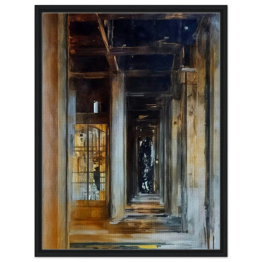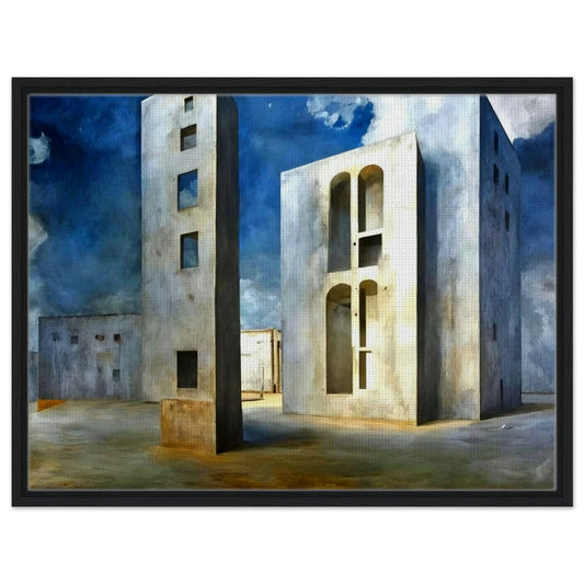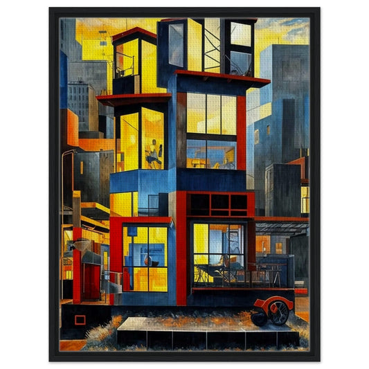 • Curved museum-quality poster featuring a vibrant and abstract depiction of a cityscape, showcasing a blend of bold colors and architectural details.