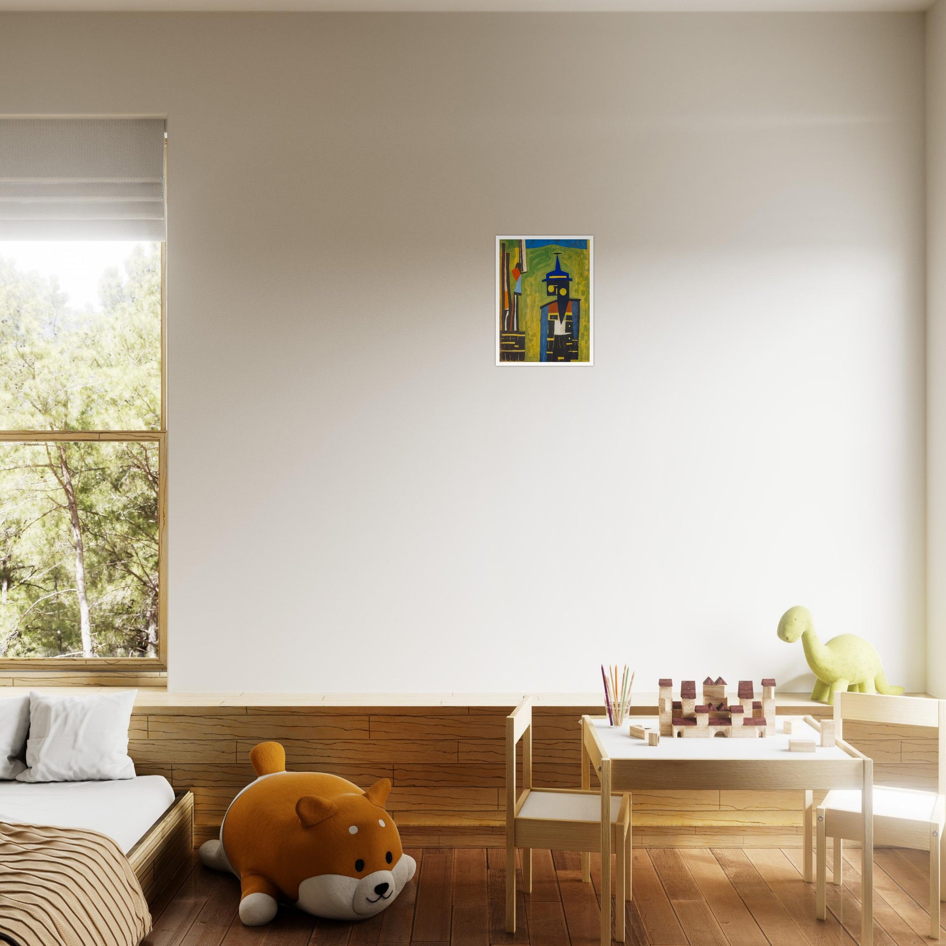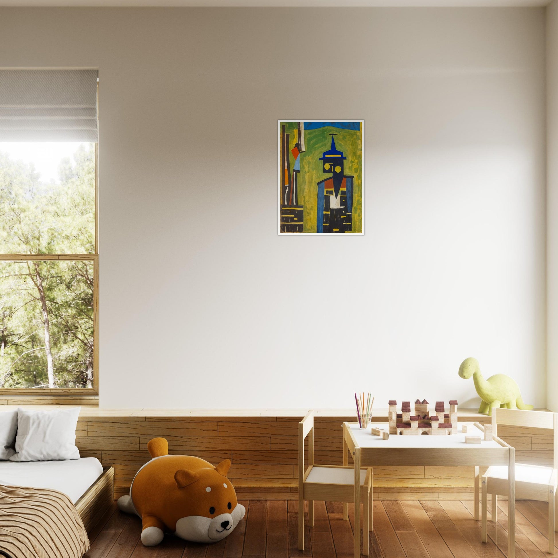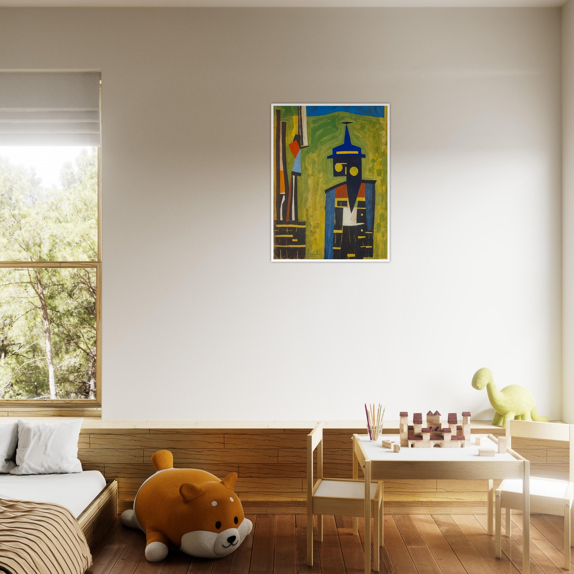 Abstract Watchman wall art is a bold, geometric expression of form and color. A figure with a triangular hat and circular eyes creates a simple yet striking silhouette. The composition is characterized by vivid colors—blues, yellows, and reds—that form an abstract representation of a watchful figure. The sharp lines and shapes, alongside the contrasting hues, create a dynamic visual that captures the essence of alertness and presence.