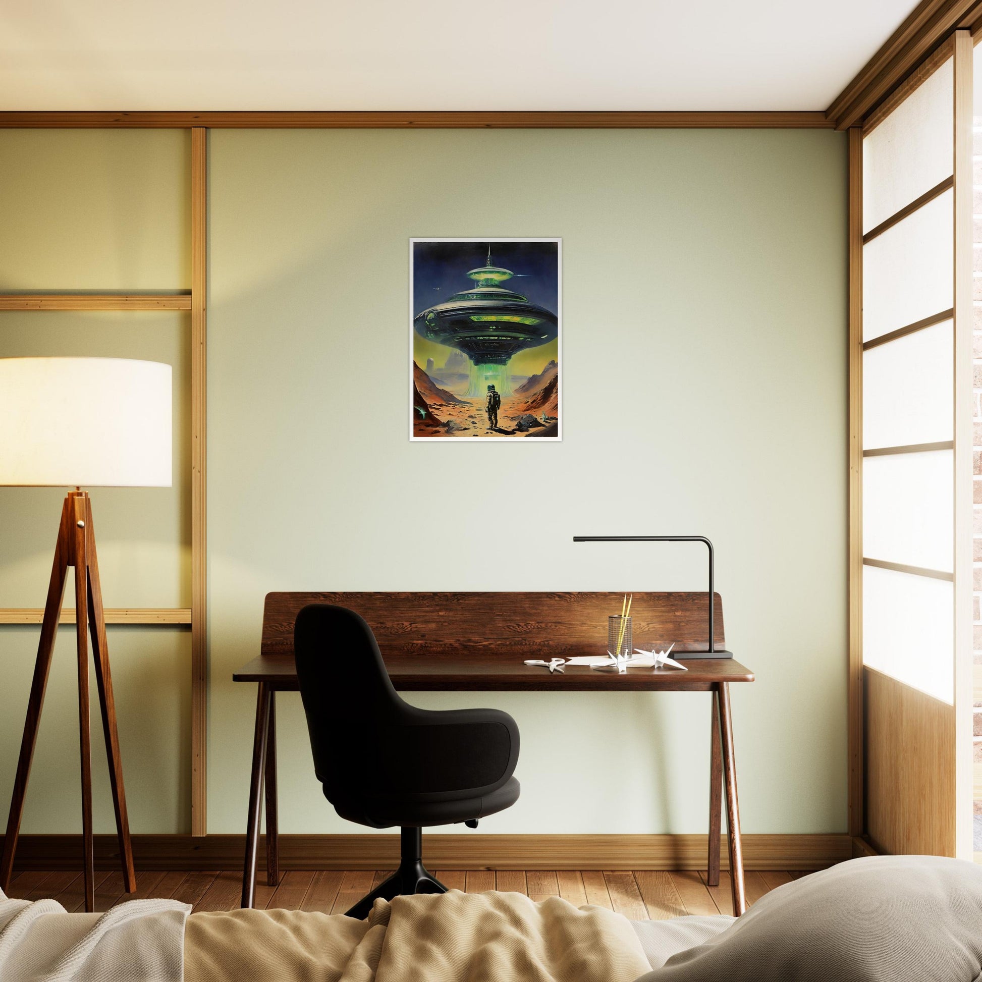 This intriguing artwork, Alien Encounter, captures the imagination with its bold depiction of an otherworldly landscape. The combination of deep, cosmic blues and vibrant greens evokes a sense of mystery and the unknown. Perfect for those who are fascinated by the vastness of space, this design will make a statement on any wall. Choose between our museum-quality prints on canvas or high-quality posters to match your decor needs.