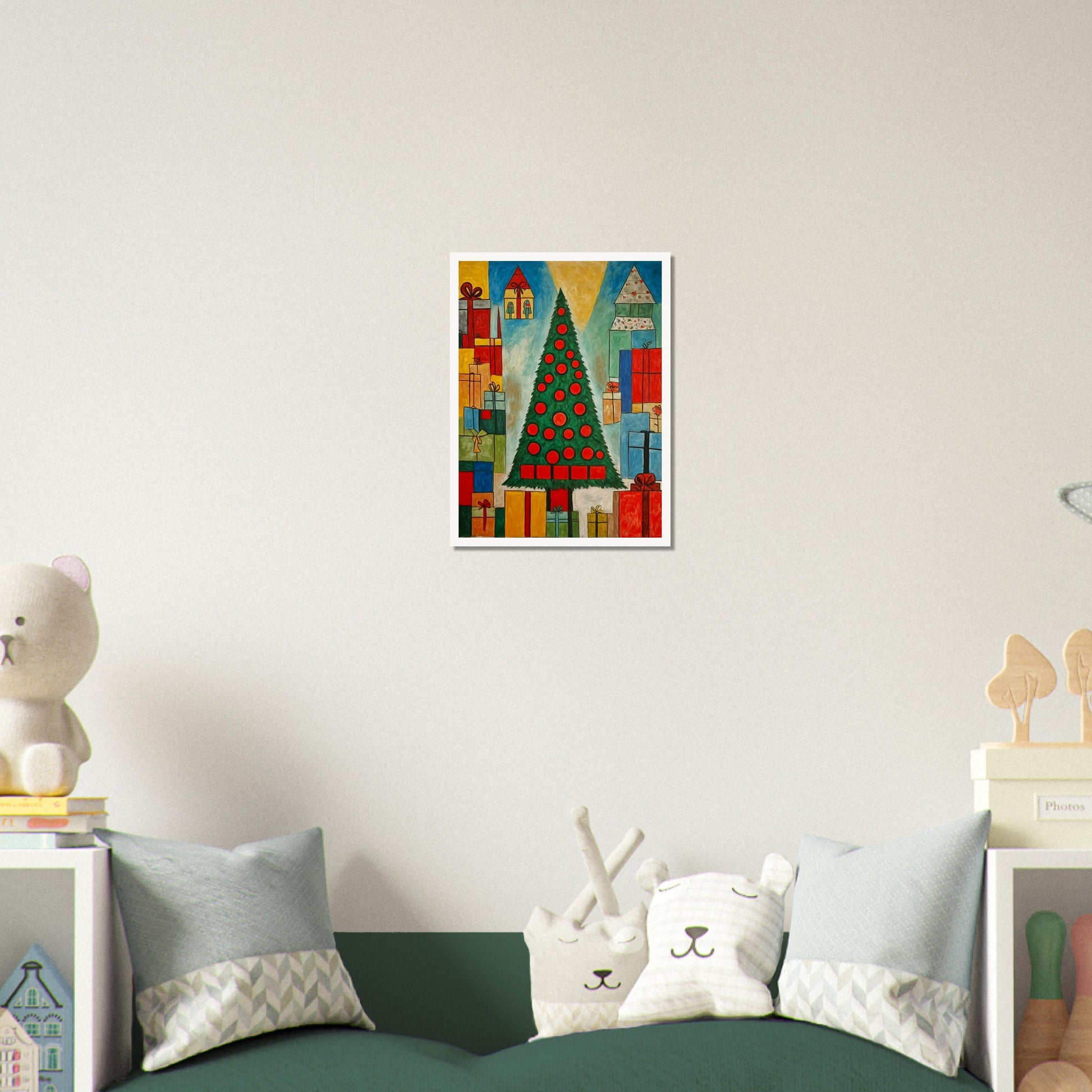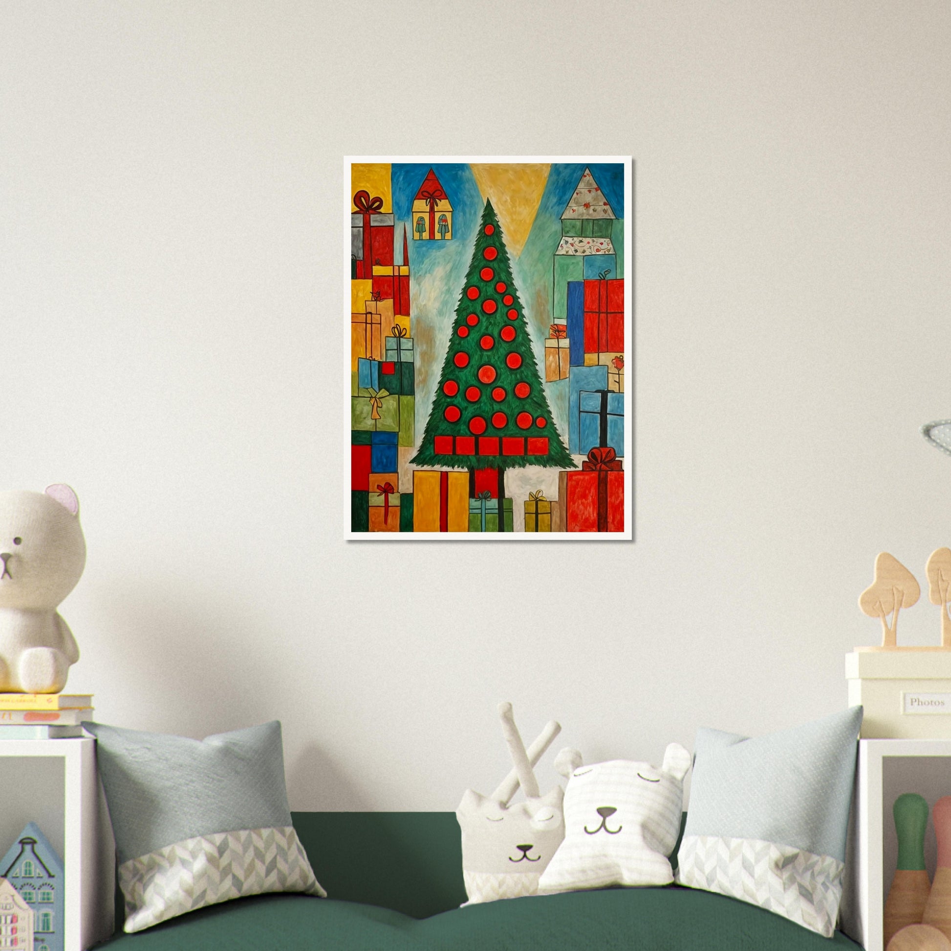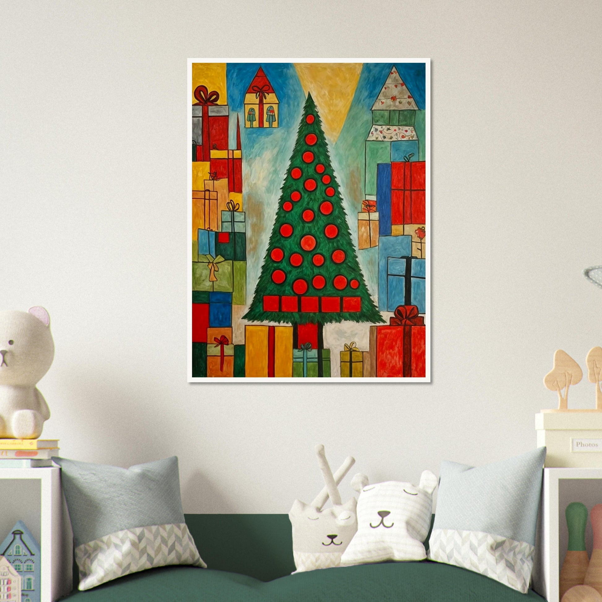 Christmas Presents wall art brings the vibrant spirit of the holiday season to life with its bold colors and playful design. A large Christmas tree, adorned with bright red ornaments, stands proudly at the center, surrounded by colorful gifts wrapped in festive paper. The whimsical shapes of the gifts and the tree make this artwork a fun and uplifting addition to any holiday decor. The piece captures the joy and anticipation of the season, making it perfect for spreading holiday cheer in your home.