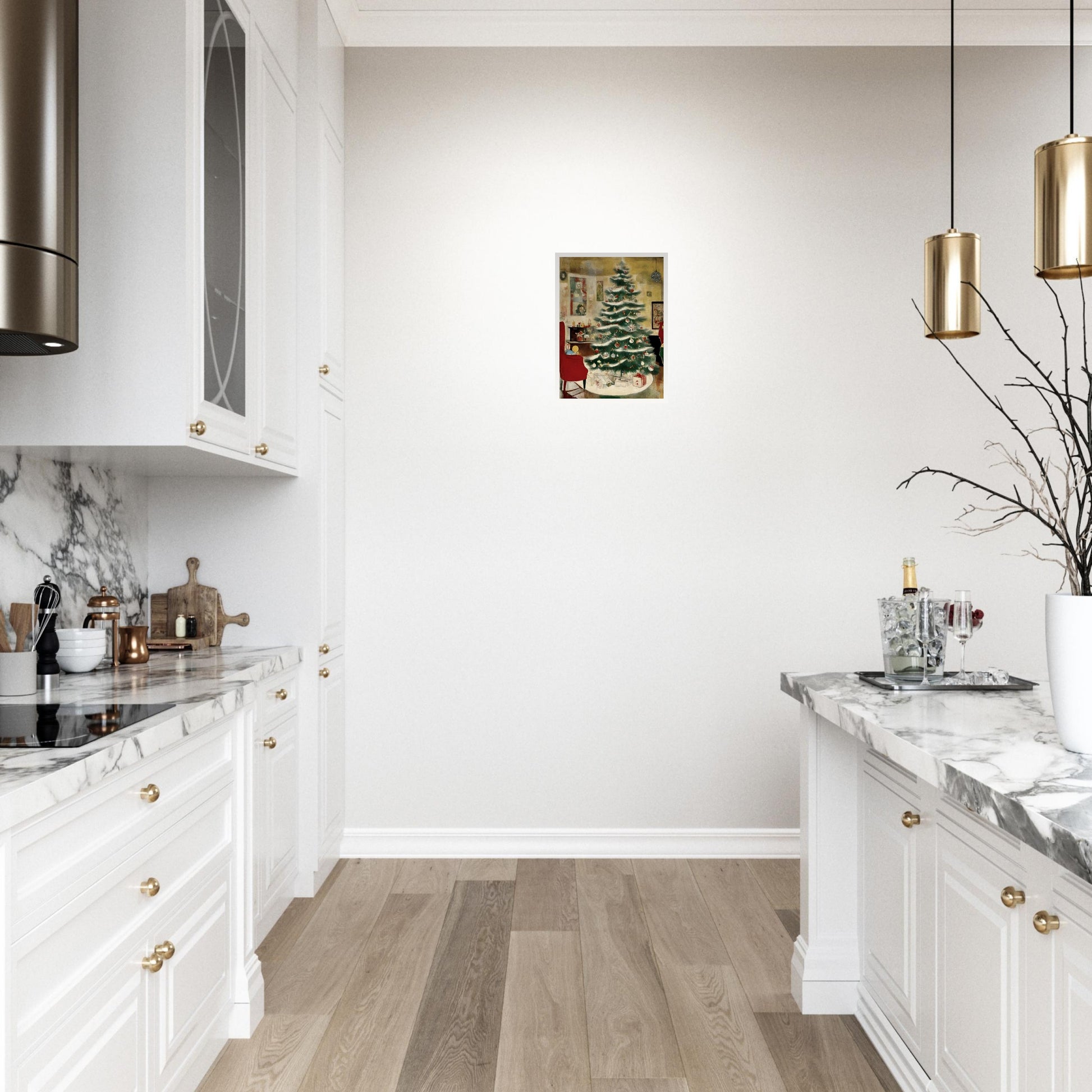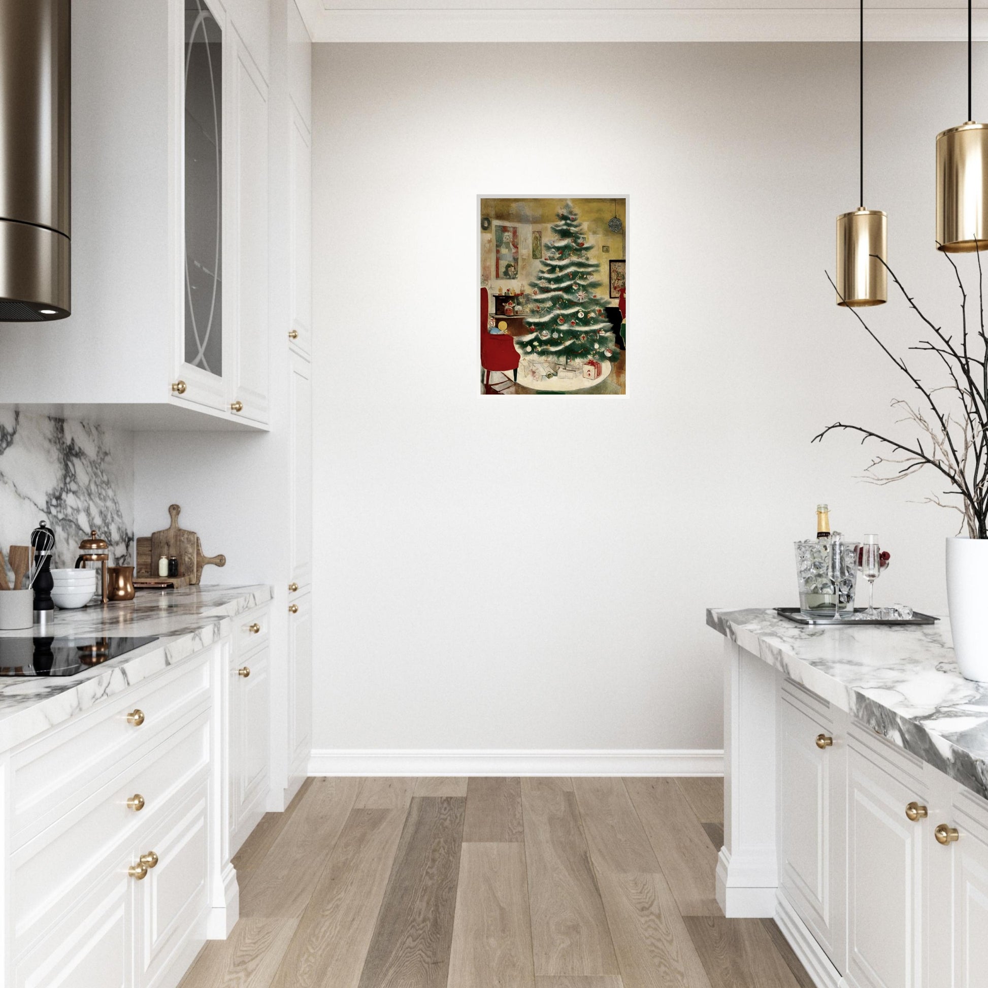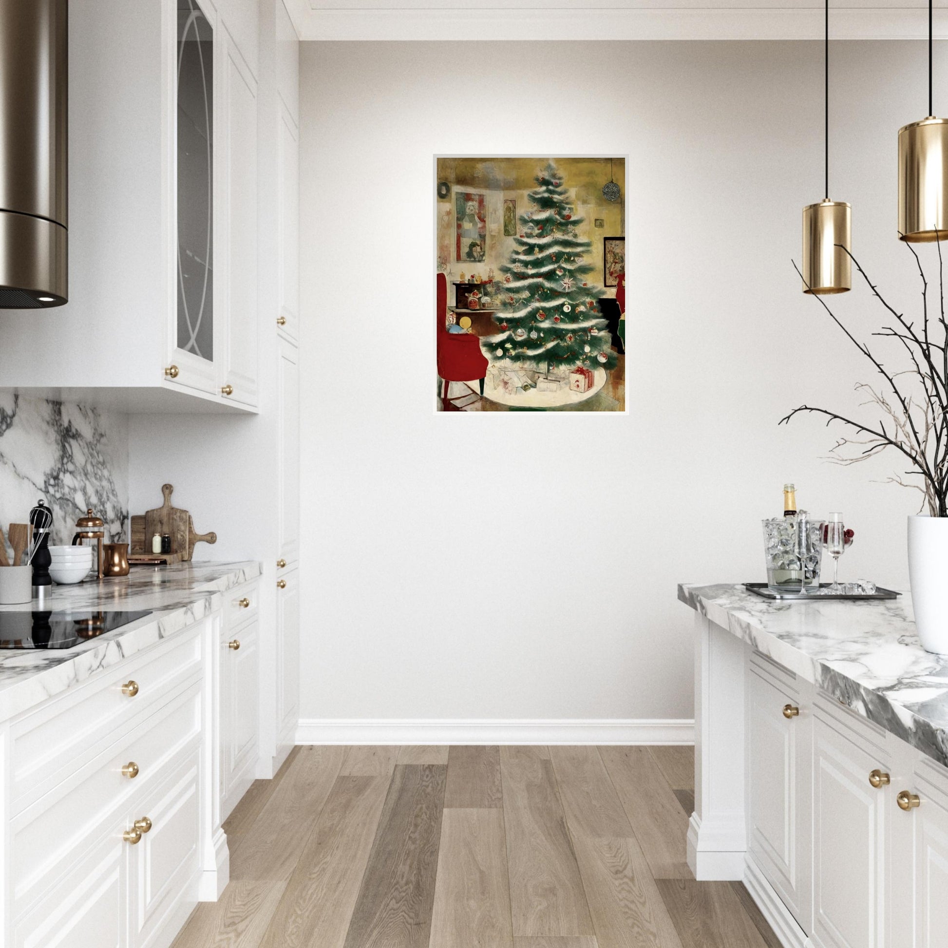 Christmas Spirit wall art brings the warmth and nostalgia of the holiday season into your home. The artwork depicts a beautifully decorated Christmas tree surrounded by gifts, with soft lighting and intricate ornaments creating a sense of comfort and joy. The subtle background of cozy furnishings and festive decorations adds to the inviting atmosphere, making it feel like a scene from a cherished holiday memory. The decorations on the tree such as sparkling ornaments and tinsel capture the magic of Christmas. This piece highlights the spirit of the holiday season, filled with love, tradition, and celebration.