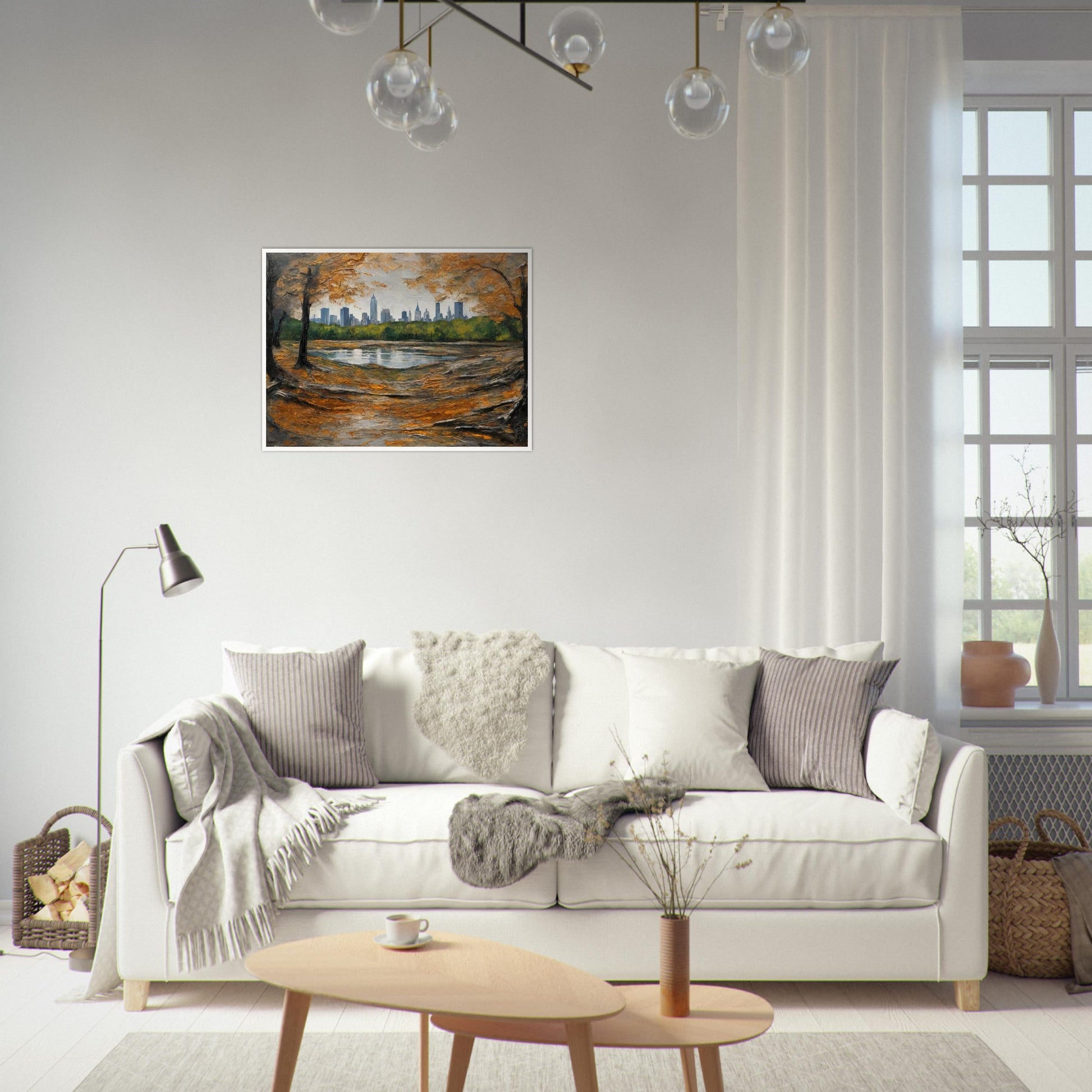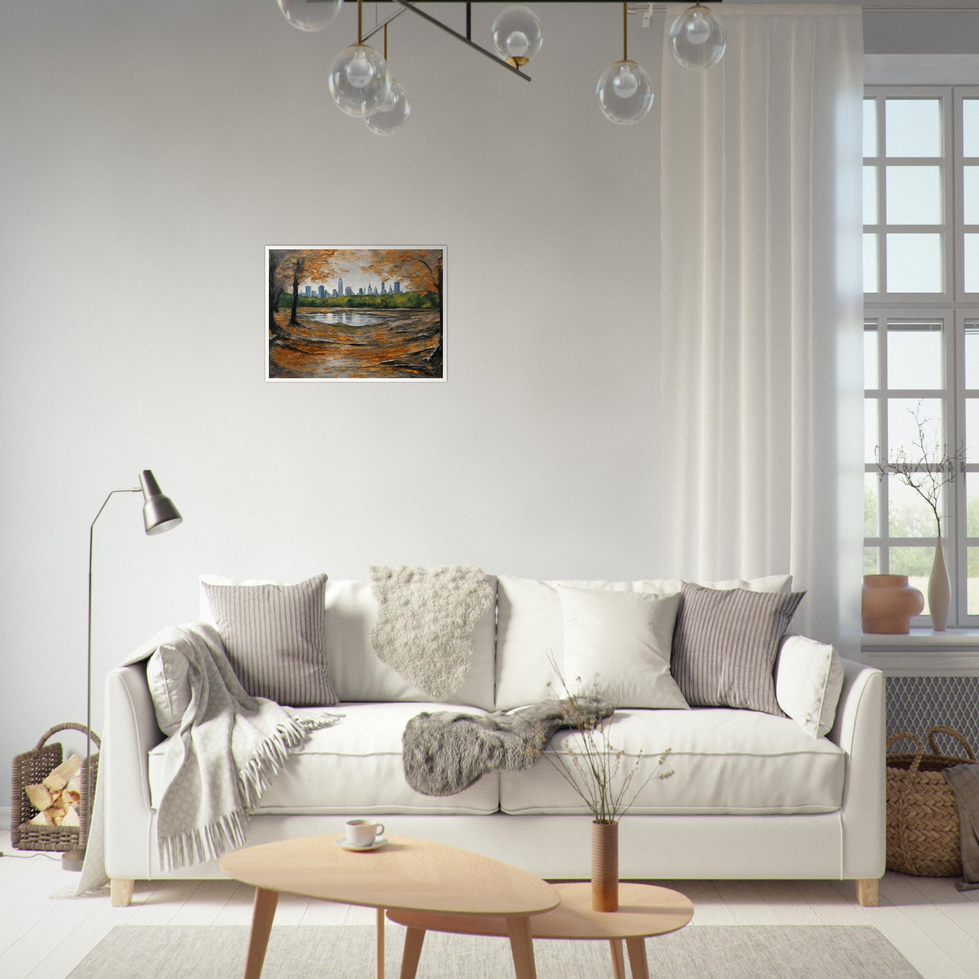 City Through the Trees wall art captures the serene contrast between nature and the bustling urban landscape. With Central Park in the foreground, framed by autumnal trees, this piece offers a peaceful view of the New York City skyline, blending tranquility with the vibrancy of city life.