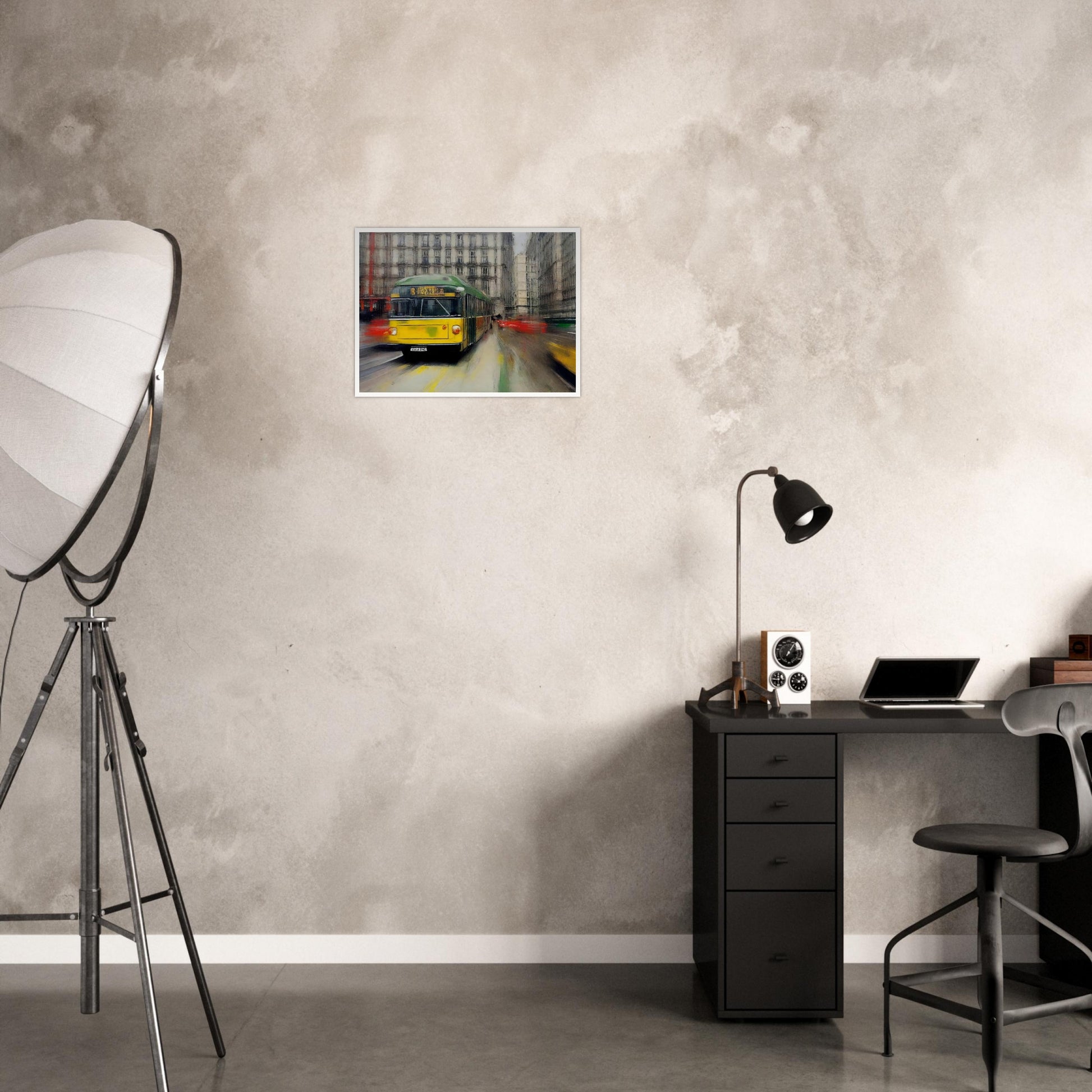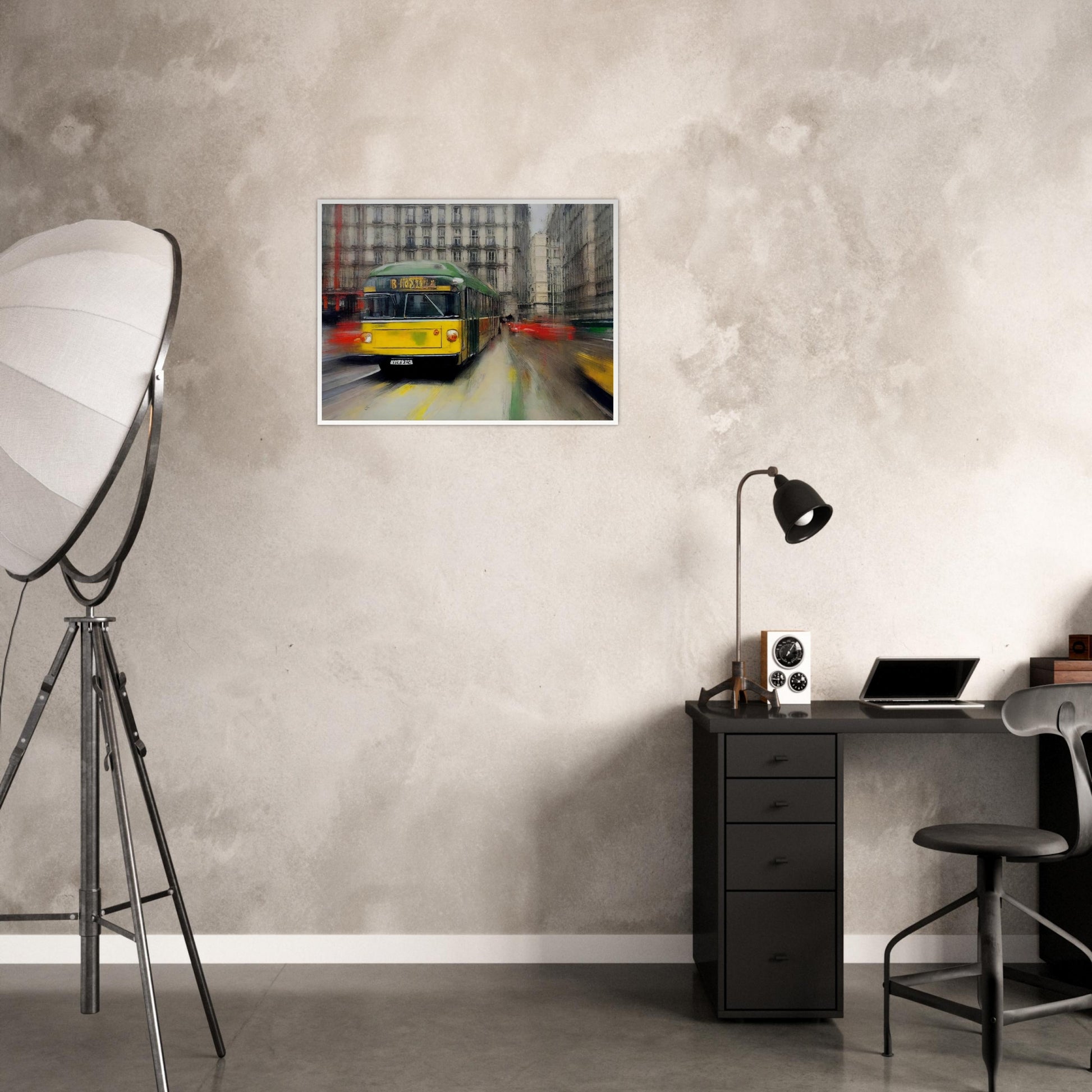 City Tram in Motion wall art portrays a vibrant green and yellow tram cutting through the city streets. This artwork captures the hustle and bustle of city life in a blend of movement and stillness. The blurred backdrop of towering buildings and passing cars reflects the energy of a metropolis.