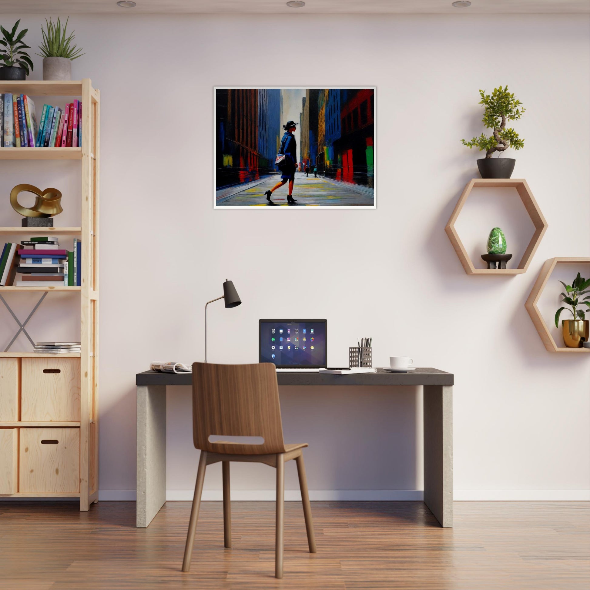 City Walk wall art captures the dynamic energy of urban life through the striking contrast of light and shadow. A solitary figure walks through a city street, the muted tones of the background buildings juxtaposed against the vibrant, colorful reflections on the pavement. The artwork draws the viewer into the bustling city atmosphere, offering a moment of introspection amid the fast-paced environment.