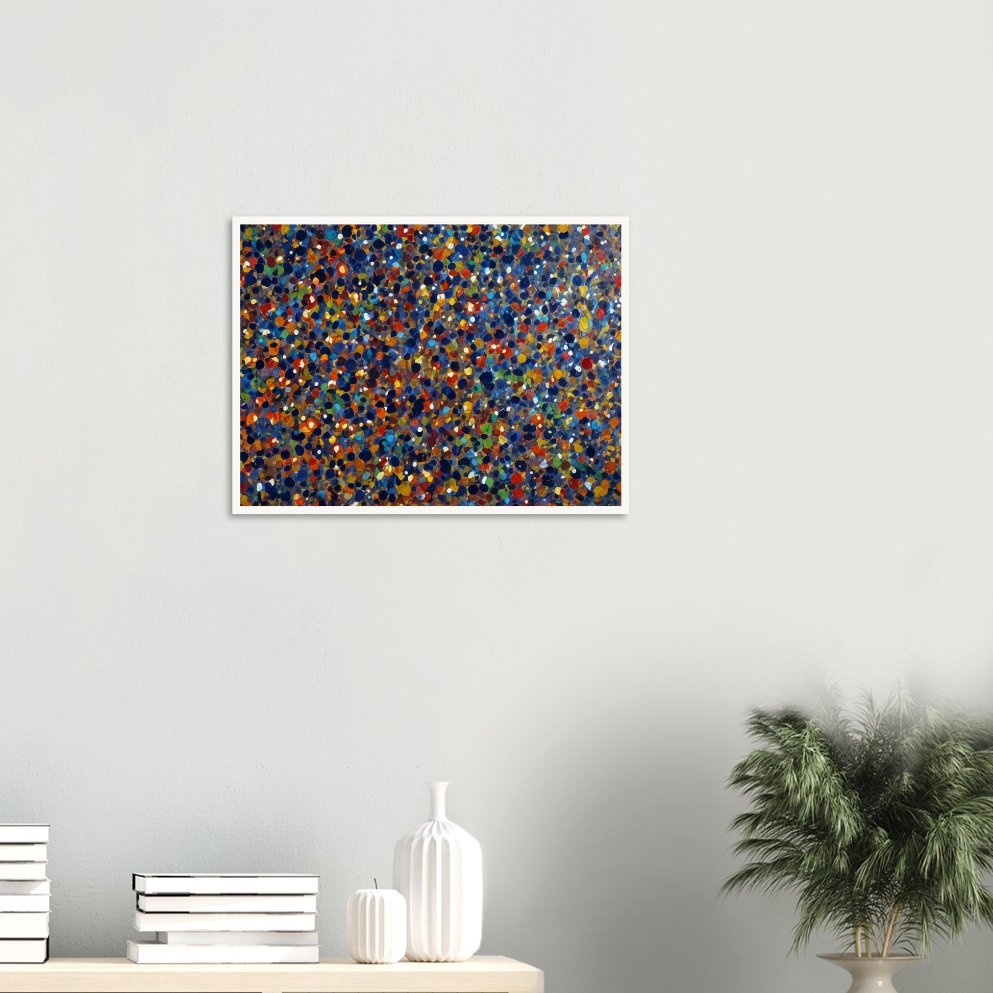Cosmic Confetti is an abstract wall art print that immerses viewers in a vibrant explosion of colors. With countless small dots and splashes in hues of blue, red, yellow, and green, this artwork offers a sense of joy and energy, like a galaxy full of colorful stars. The playful composition brings an energetic, celebratory feel to any space.