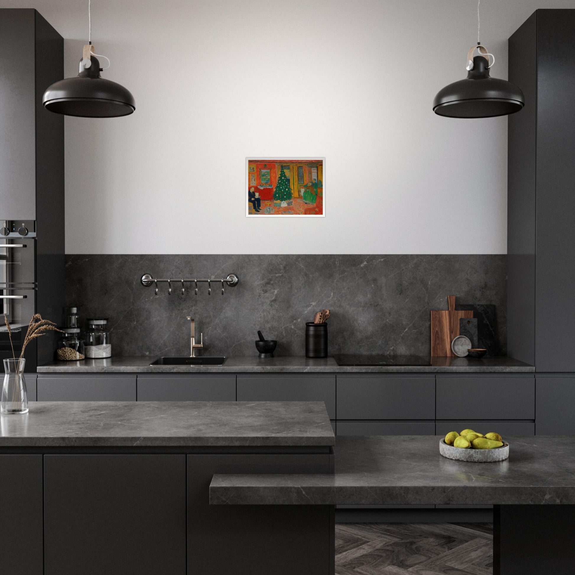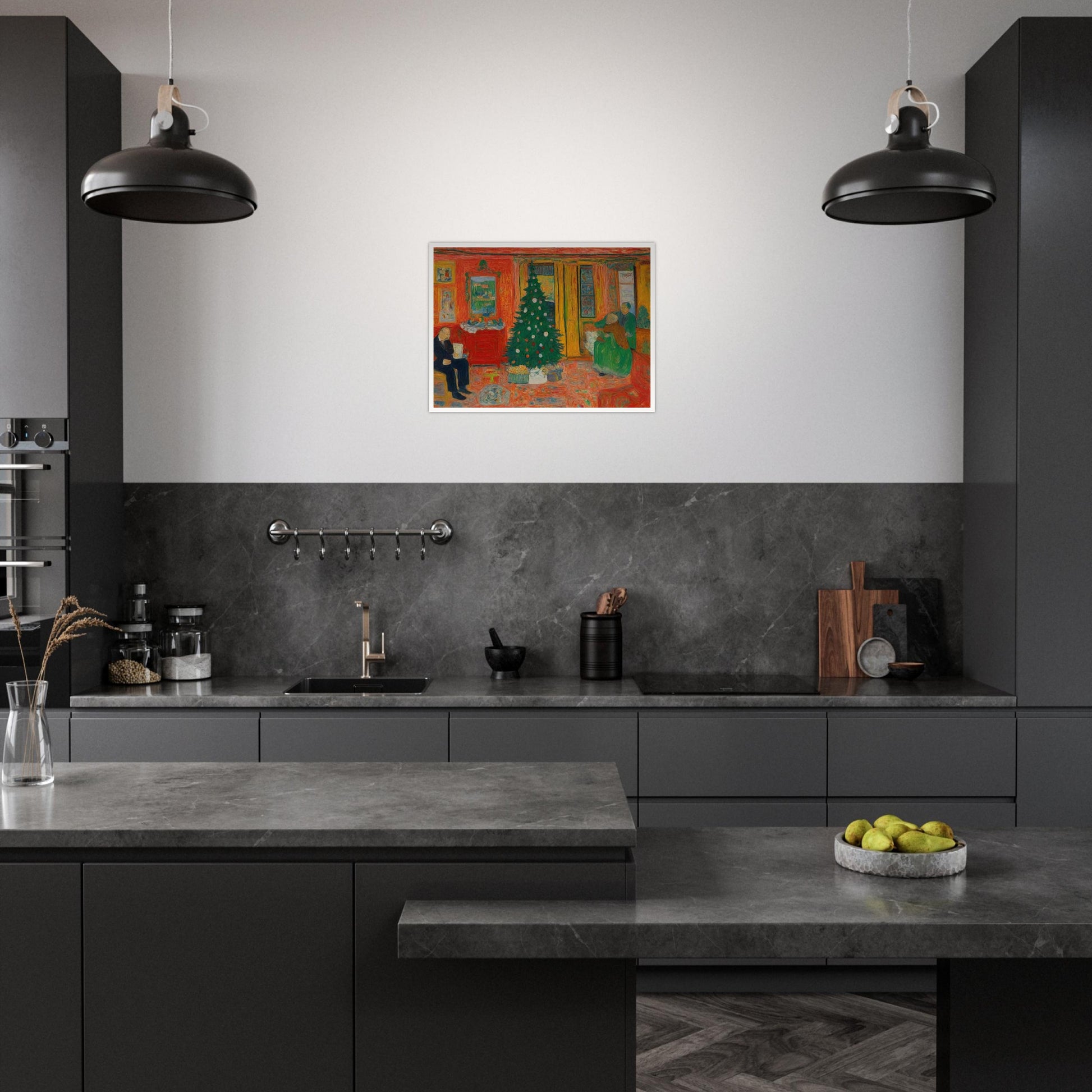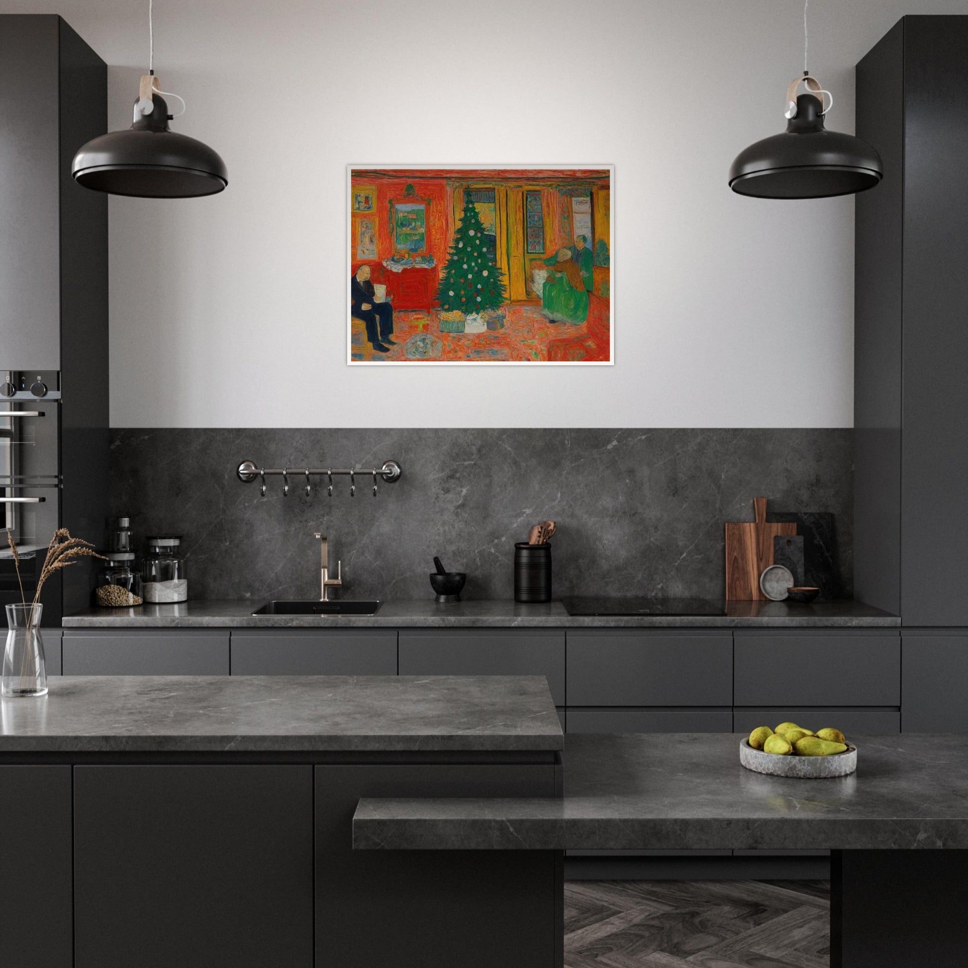 Cozy Christmas Eve wall art captures the warmth and joy of a holiday gathering. In the scene, a beautifully decorated Christmas tree stands proudly, surrounded by family members preparing for the holiday festivities. Bathed in warm reds and yellows, the scenery reflects a sense of comfort and familiarity. The intimate portrayal of family members highlights the cherished moments that make Christmas so special. The combination of bold colors and the subtle details in the characters' actions brings a sense of nostalgia and joy to the scene, which feels like a timeless Christmas memory.