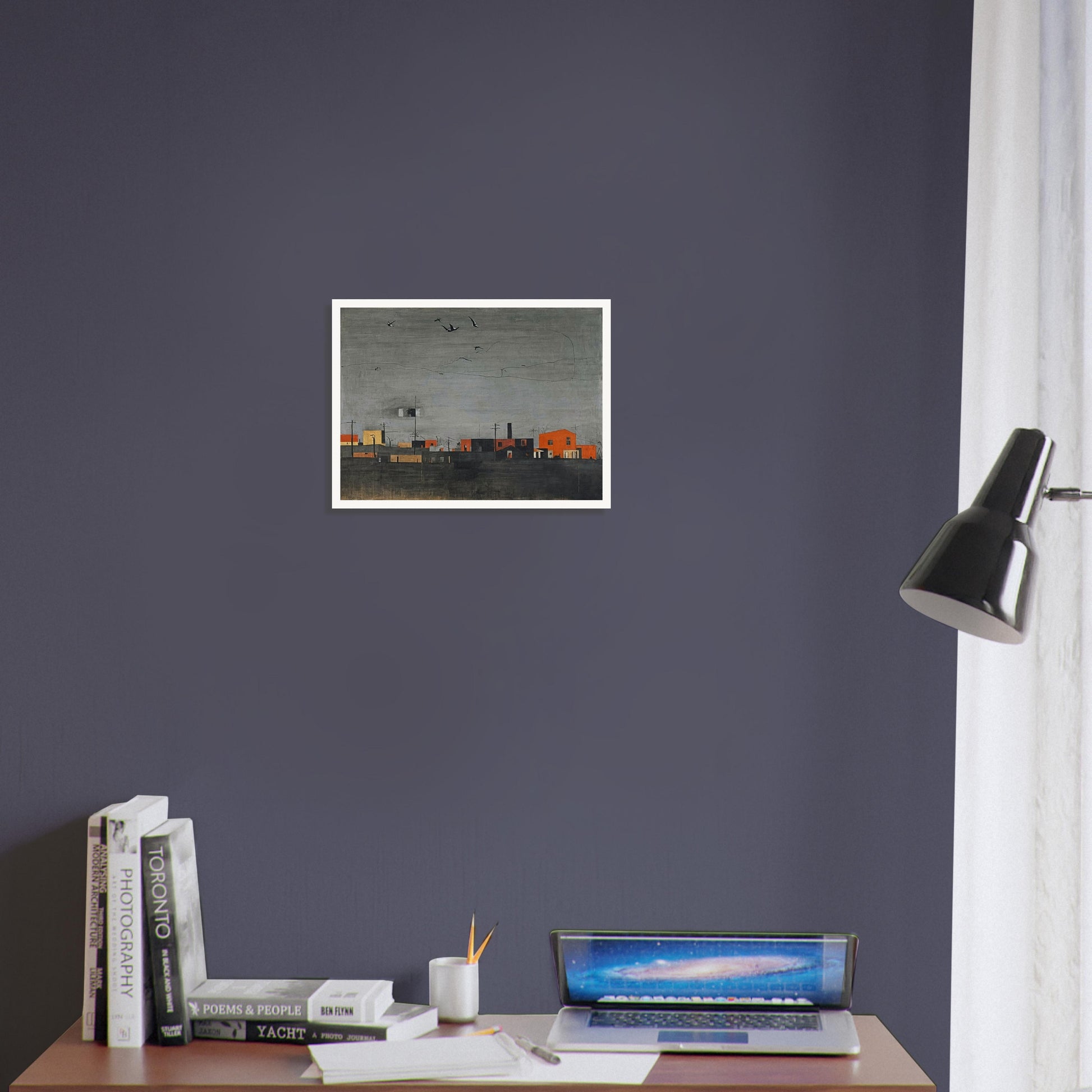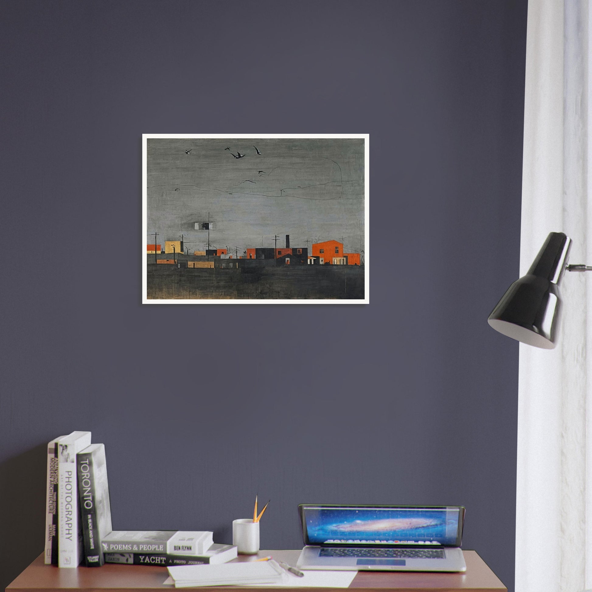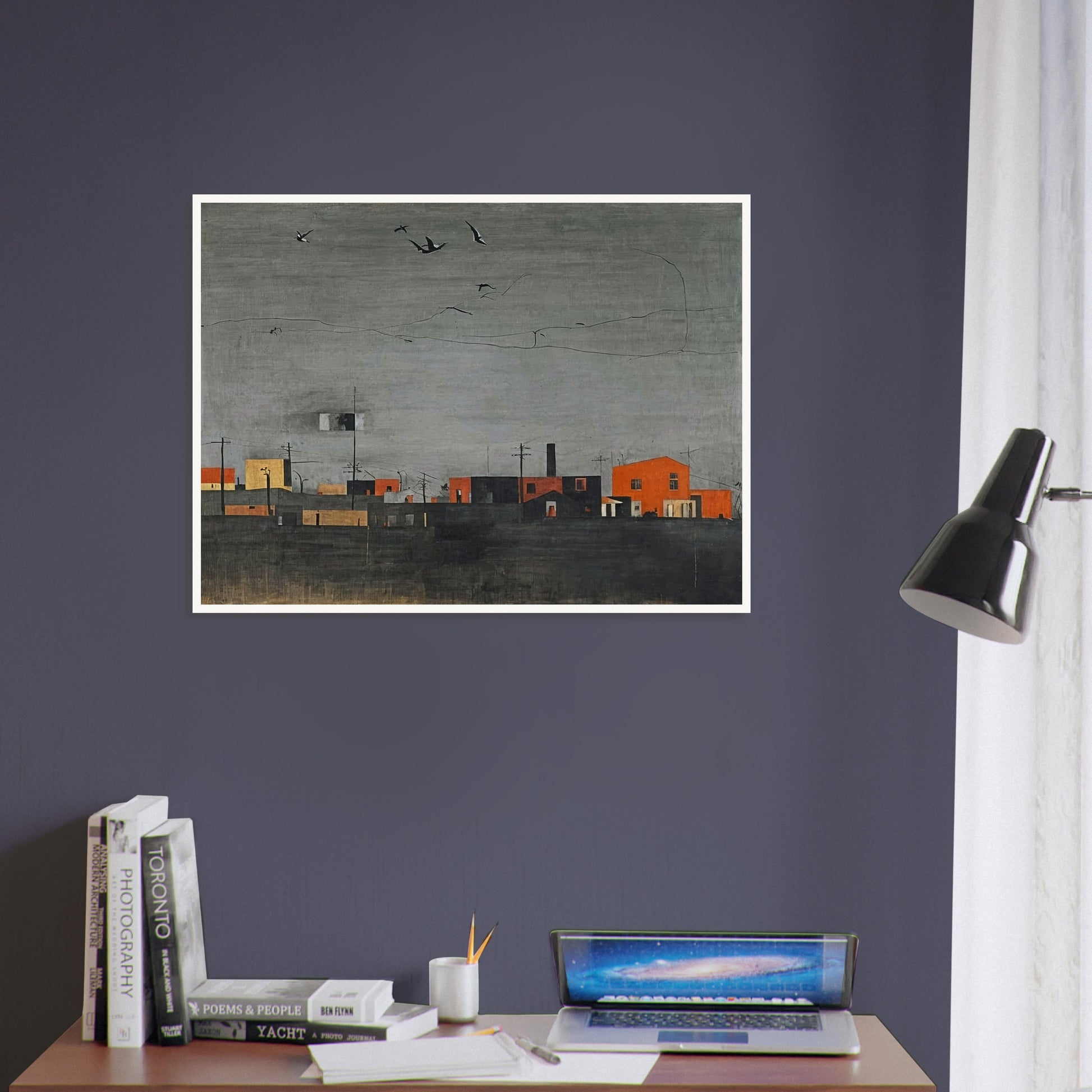 Distant Horizons wall art presents a serene and contemplative view of a quiet townscape under a moody, overcast sky. This realistic depiction captures the subtle interplay of architectural forms and natural elements, with scattered birds adding a sense of life and movement to the otherwise still scene. Its muted palette and clean composition inspire a sense of calm introspection.