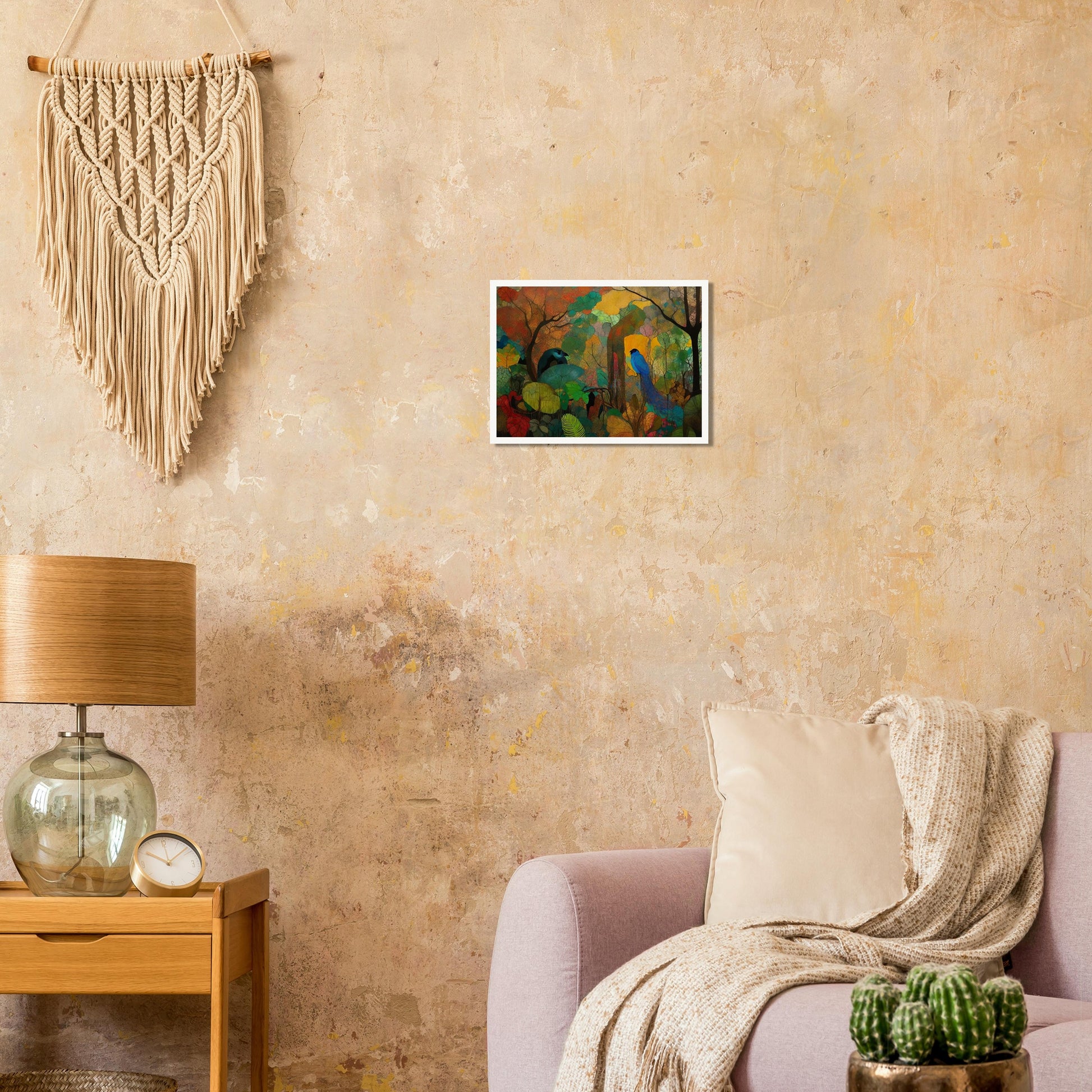 Enchanted Forest Birds wall art draws you into a lush, magical forest filled with rich colors and intricate textures. The artwork features two majestic birds perched among foliage, set against a dazzling background of layered greens, yellows, and warm autumnal hues. The mosaic-like design creates a dynamic visual experience, blending impressionism with natural elements. The interplay of bold, vivid colors and fine detailing breathes life into the scene, evoking the harmonious beauty of nature in a stylized yet captivating way. This piece seamlessly merges artistic abstraction with a celebration of wildlife.