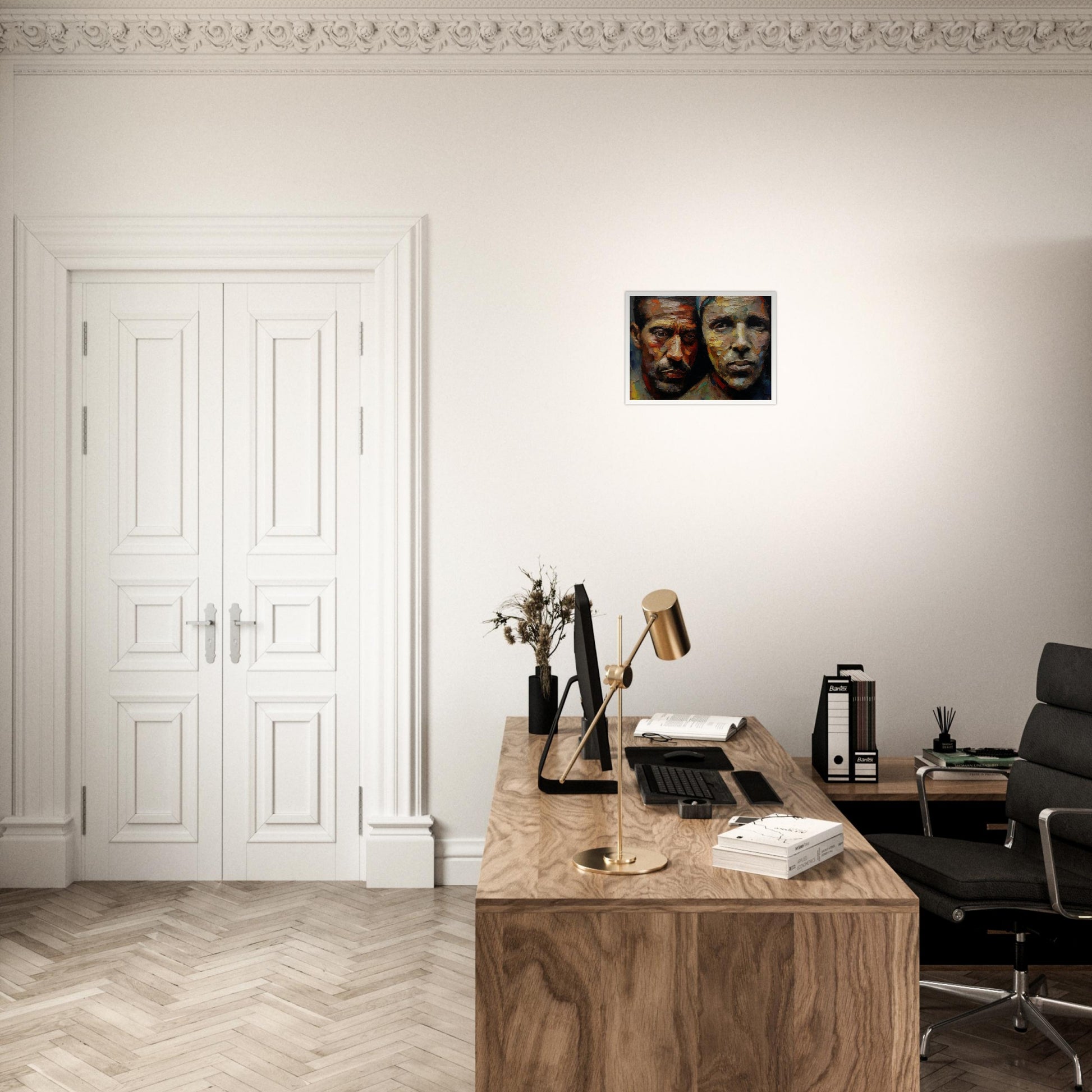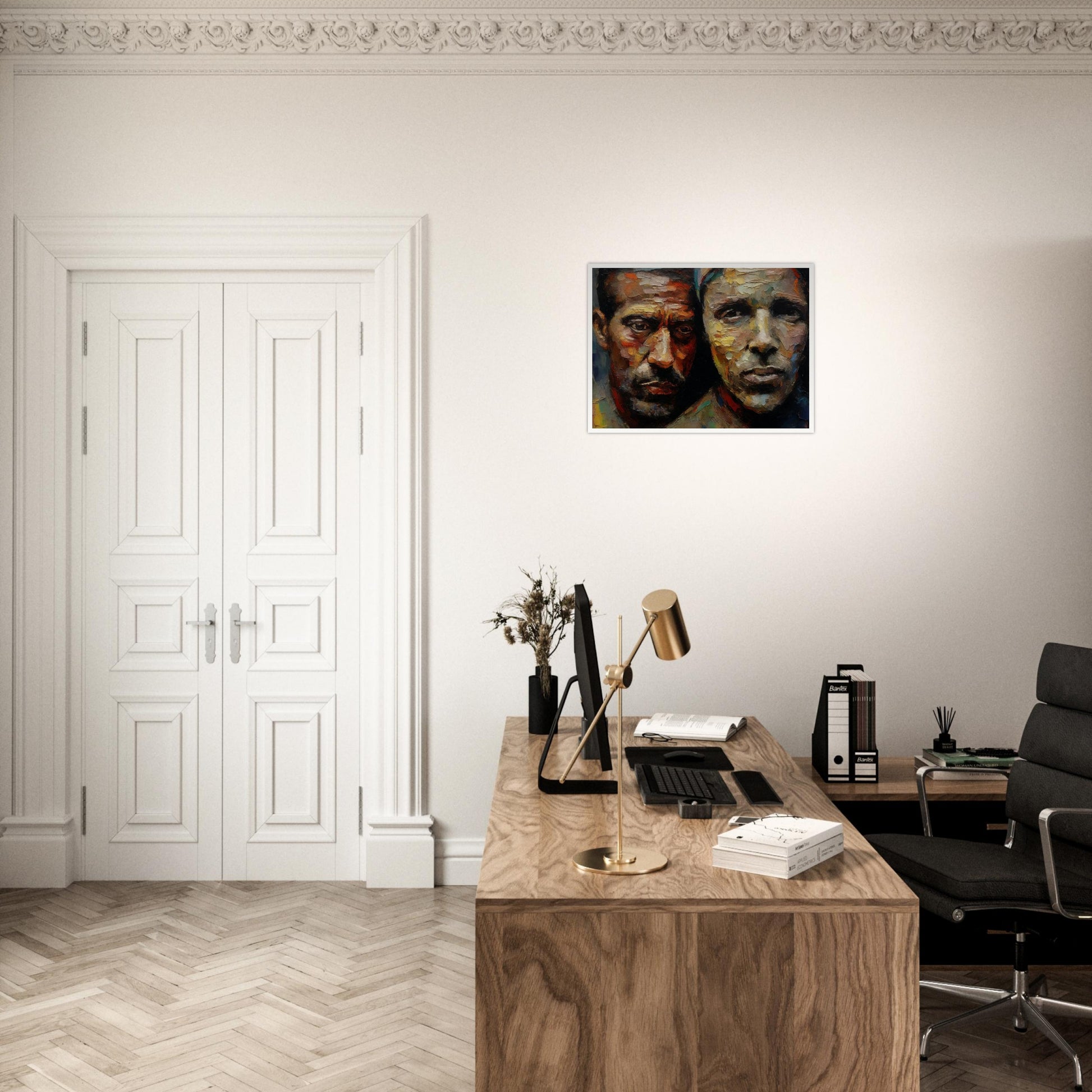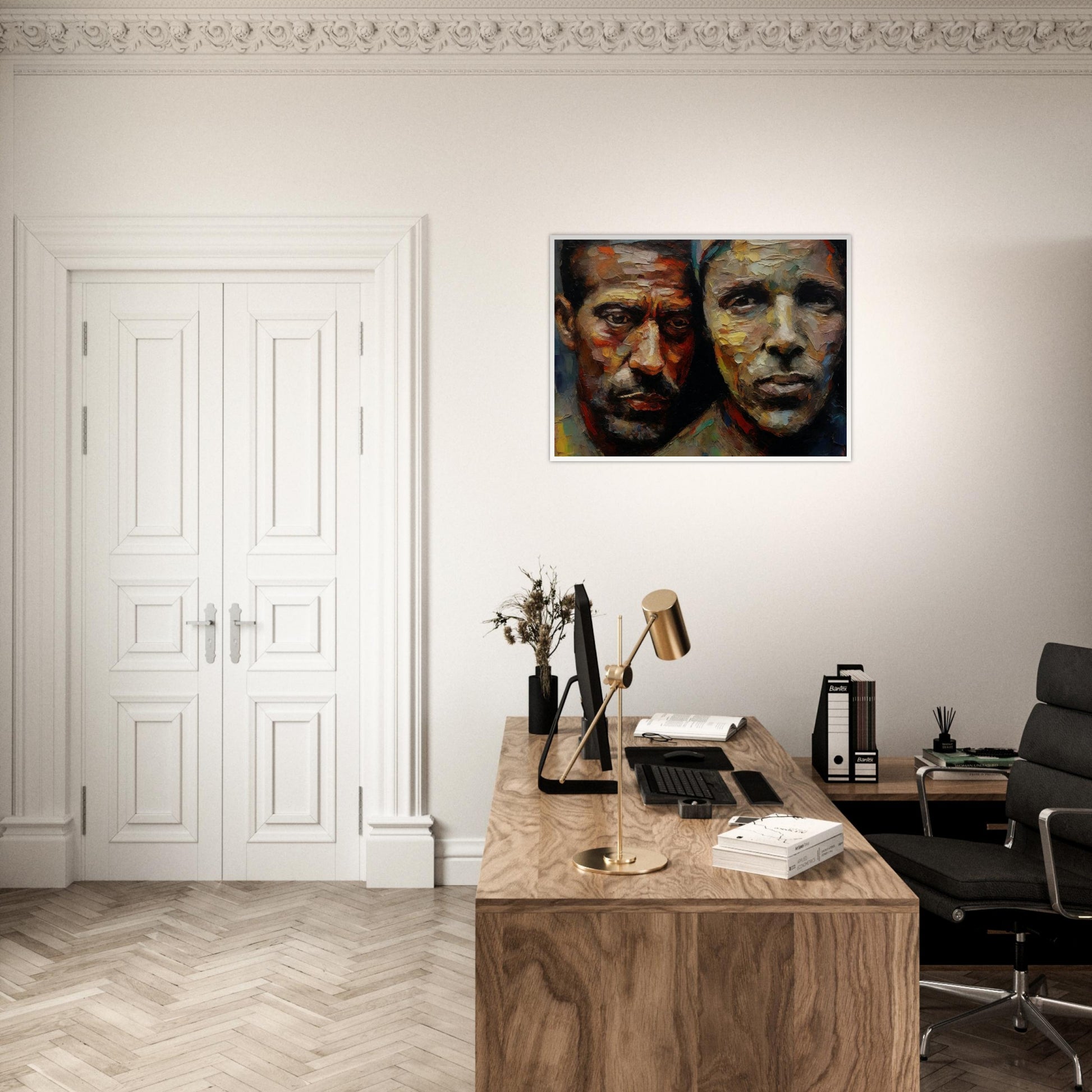 Faces of Resilience wall art captures the strength and emotions of two individuals through bold, textured brushstrokes. The vibrant yet somber color palette adds depth to their expressions, with the contrast between light and shadow highlighting their inner resilience. The close-up composition enhances the emotional impact, inviting the viewer to connect with the powerful emotions conveyed through the detailed, impasto-style painting.