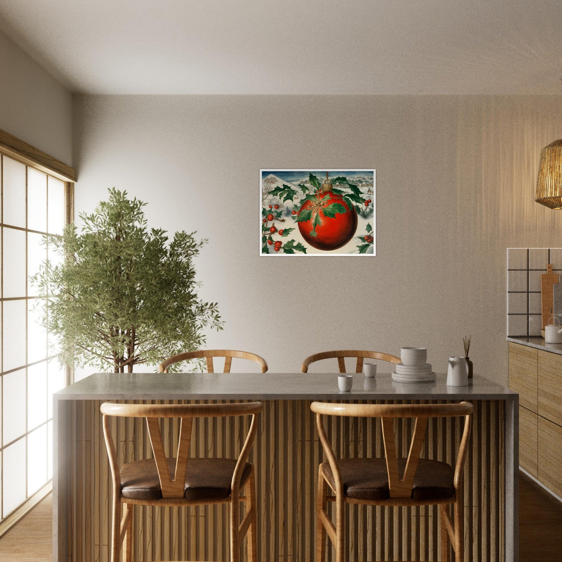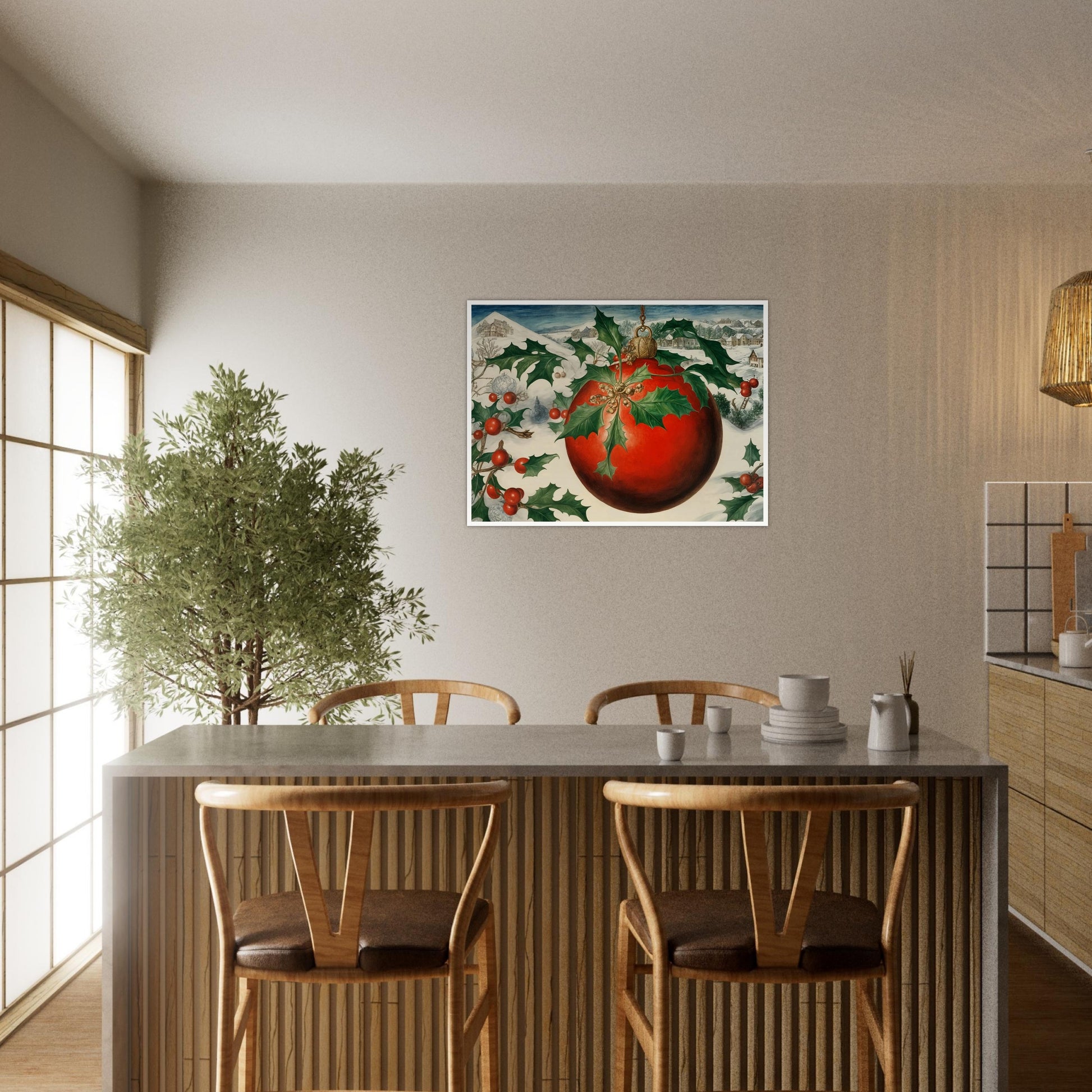 Festive Globe wall art captures the beauty and charm of the holiday season with its detailed depiction of a large red Christmas ornament adorned with holly leaves and berries. The ornament stands out against a snowy landscape with cozy homes nestled in the distance, creating a peaceful and festive winter scene. The golden bell and the lush greenery add elegance to the composition. The snow-covered trees, the bright red ornament, and the wintery landscape bring warmth and cheer. The vibrant colors bring out the joy and magic of Christmas.