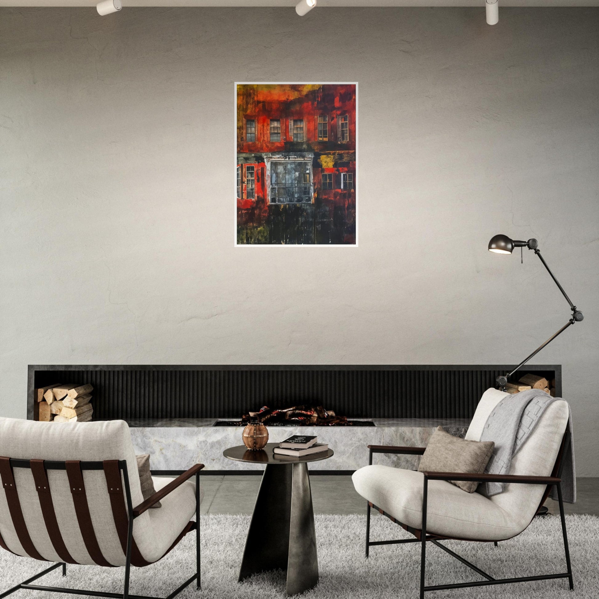 Fiery Facade wall art captures the intense energy of a building’s exterior, rendered in bold, fiery hues. The vibrant red and orange tones dominate the piece, creating a sense of heat and movement, while the dark, textured areas add depth and contrast. The architectural elements are abstracted, giving the facade a dynamic, almost otherworldly quality, as if it’s pulsating with life. The balance between the bright and dark tones creates a harmonious yet powerful visual impact.