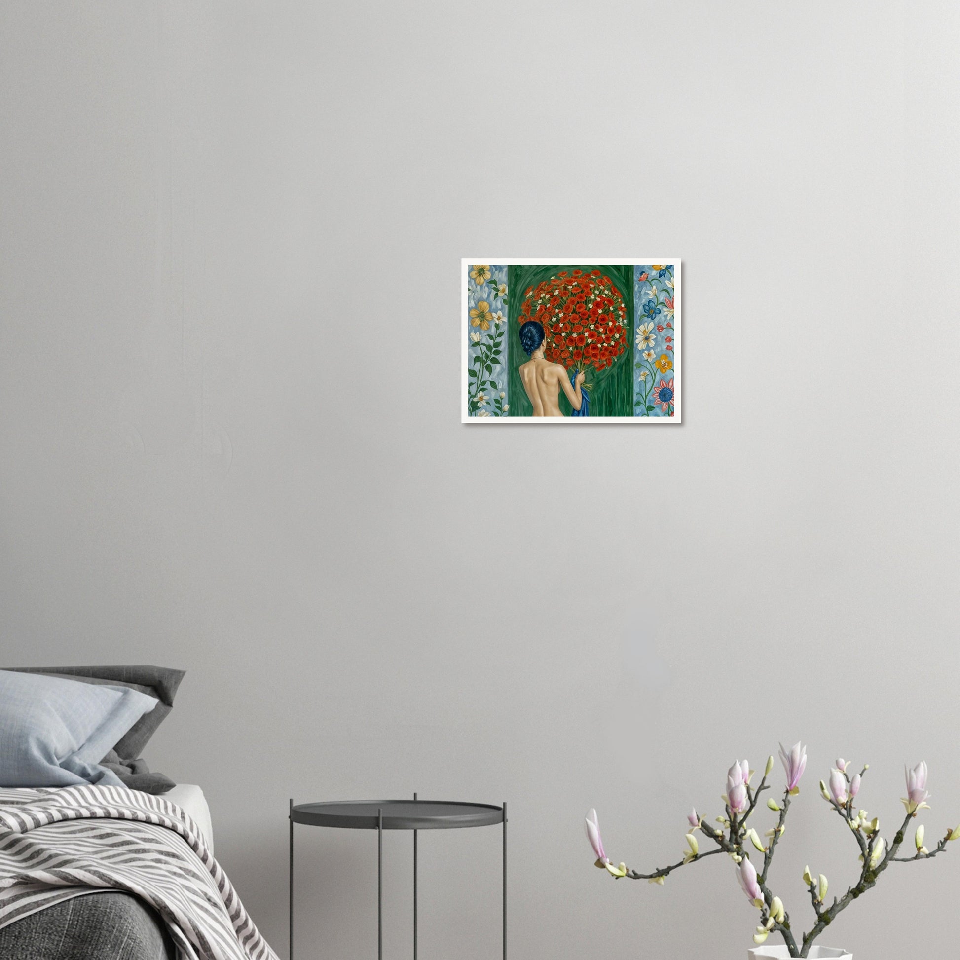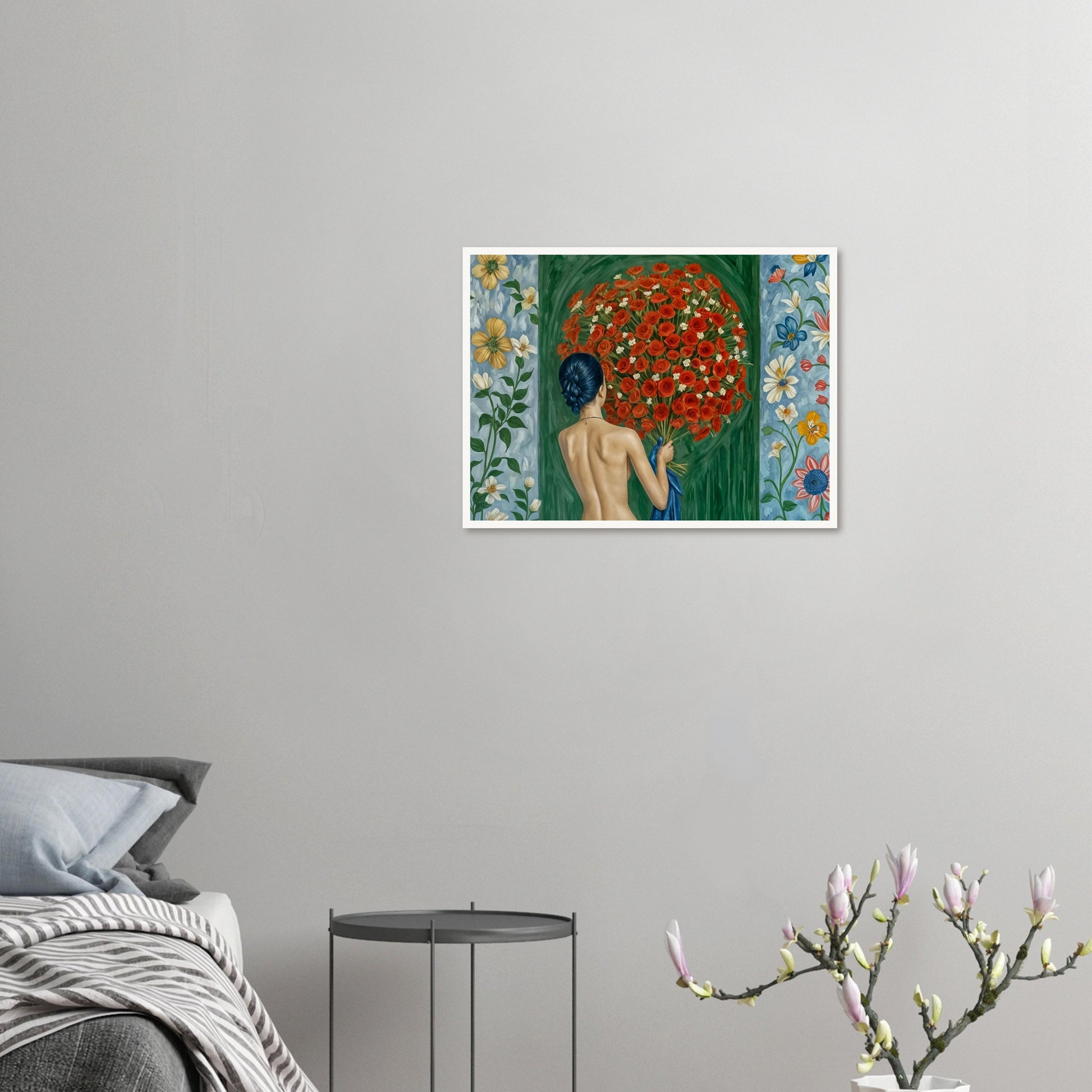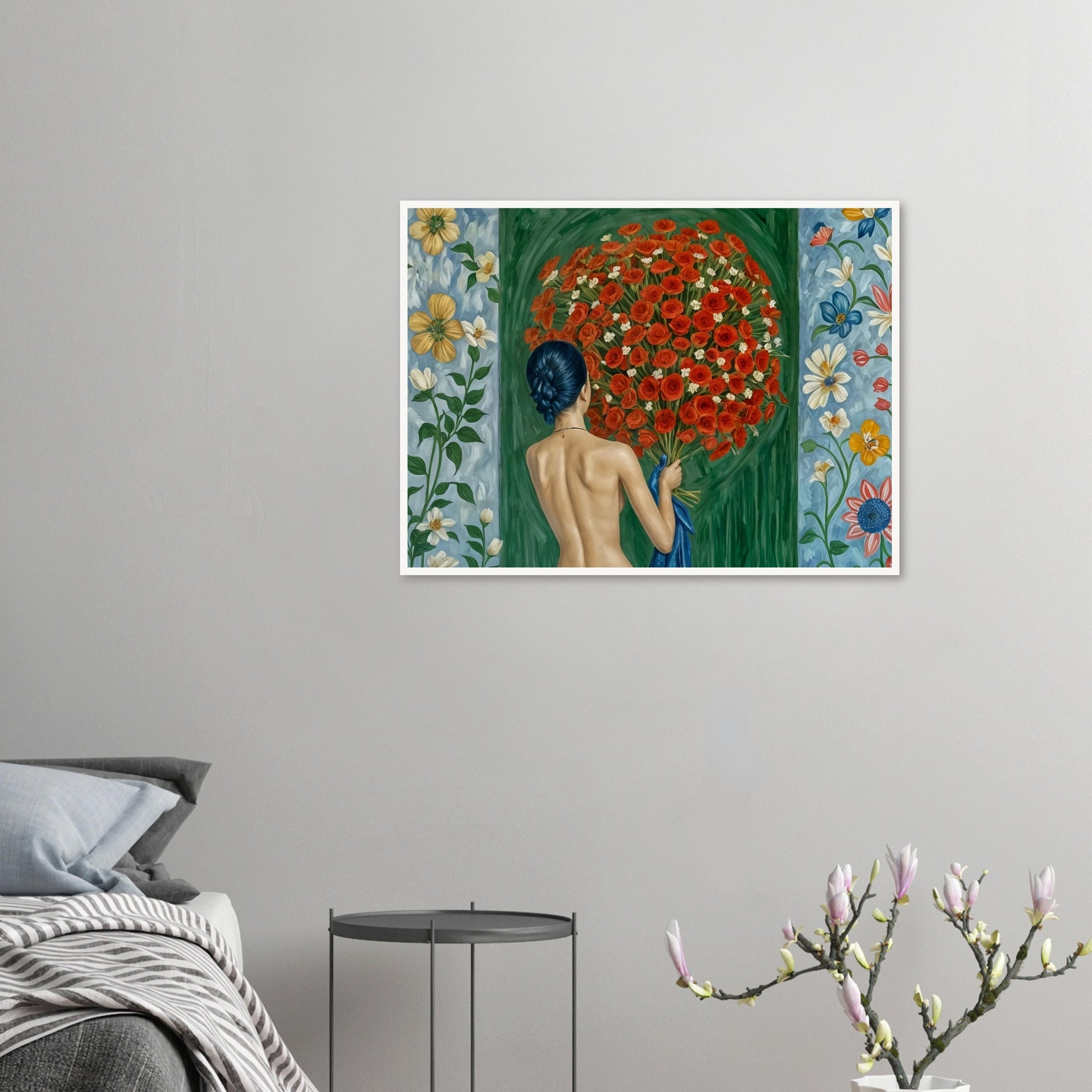 Floral Embrace wall art captures the serene moment of a woman surrounded by a vibrant bouquet of red roses. The composition features a realistic depiction of the figure with her back turned, emphasizing the connection between human and nature. The lush green background and floral details on both sides add to the sense of harmony and tranquility. This artwork blends realism with an emotive portrayal, highlighting the beauty of simplicity and the intimate bond between the subject and her surroundings. The contrast between the deep green and the vivid red roses creates a visually striking piece.