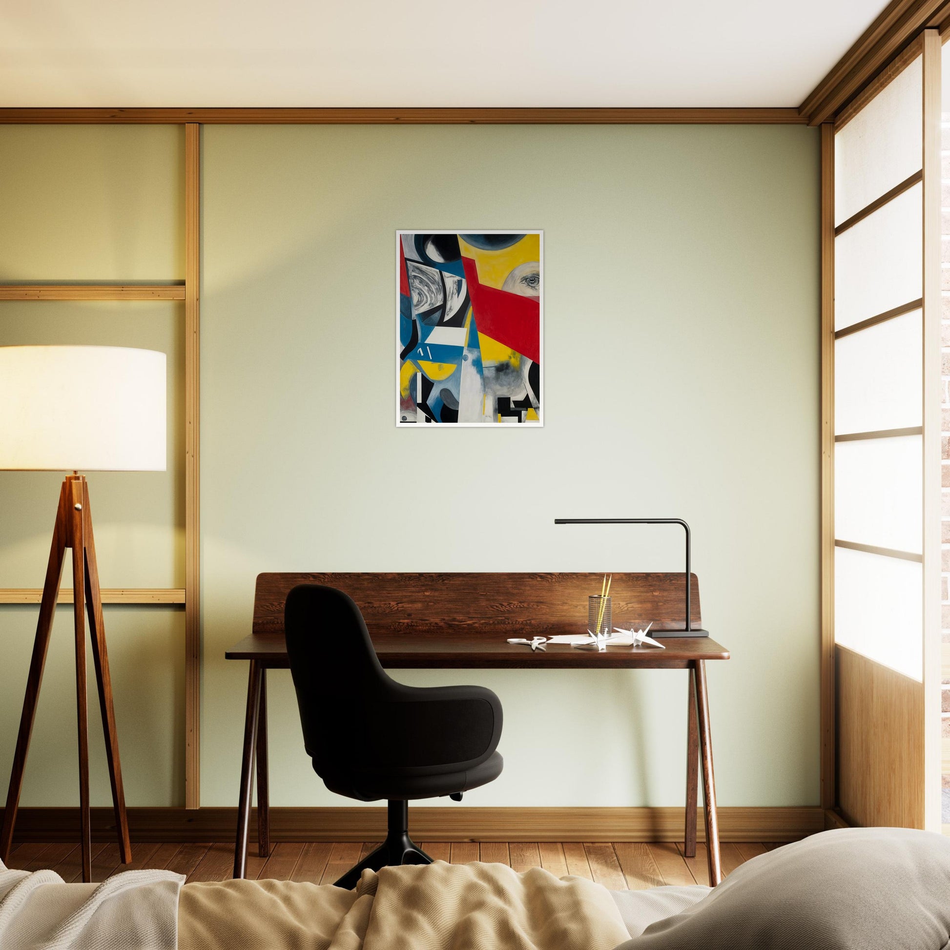 Fragmented Vision wall art showcases a dynamic mix of geometric shapes, bold colors, and fragmented elements. The interplay of vibrant yellows, deep reds, and cool blues draws attention to the sharp contrasts and layered textures, while the subtle inclusion of an eye adds a hint of surrealism and mystery. The composition’s bold lines and structured forms are balanced by smooth gradients and overlapping shapes, creating a sense of movement and depth. Its contemporary style is both visually engaging and thought-provoking, making it a versatile choice for modern interiors.