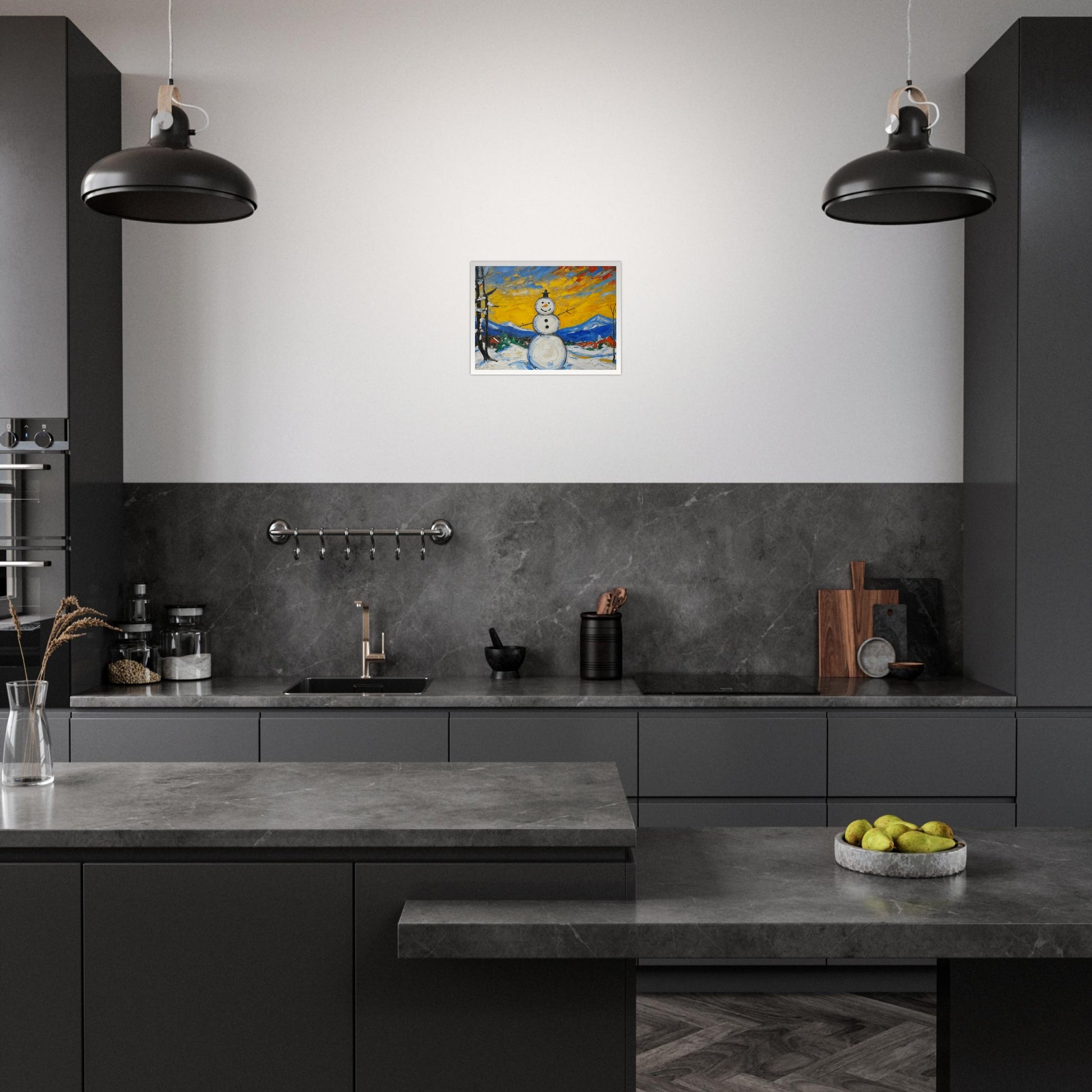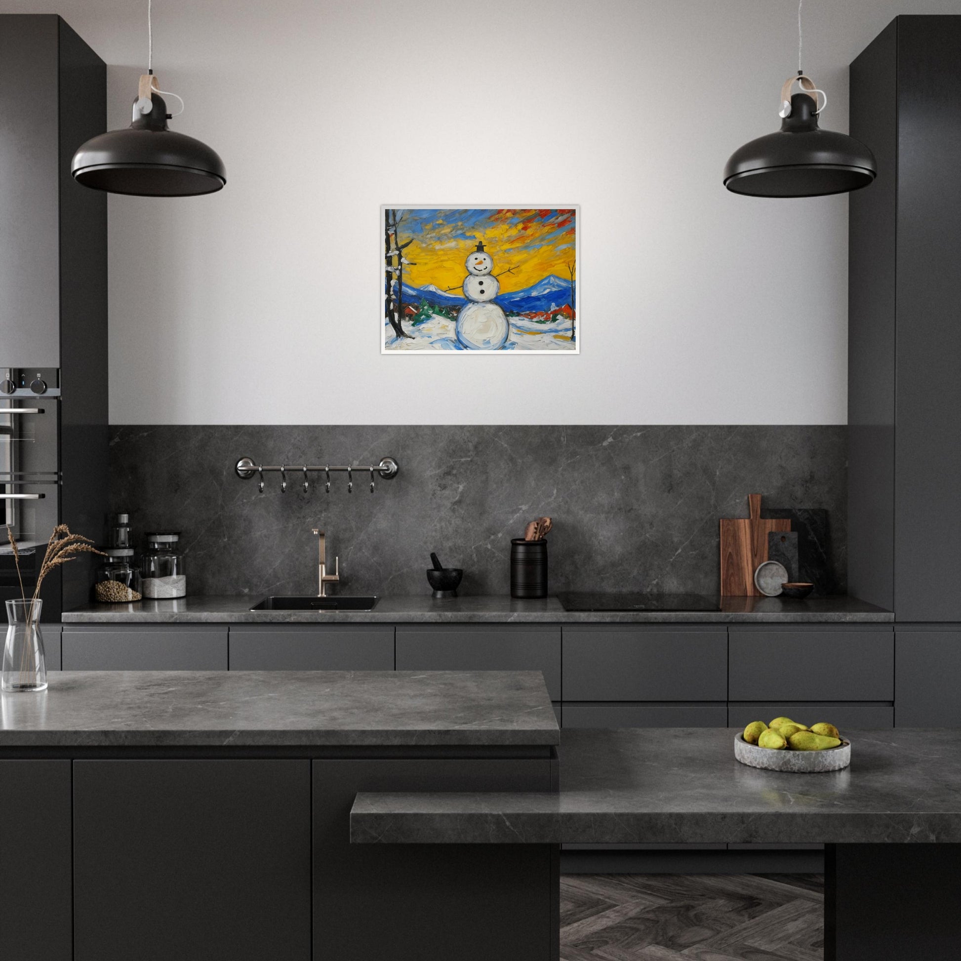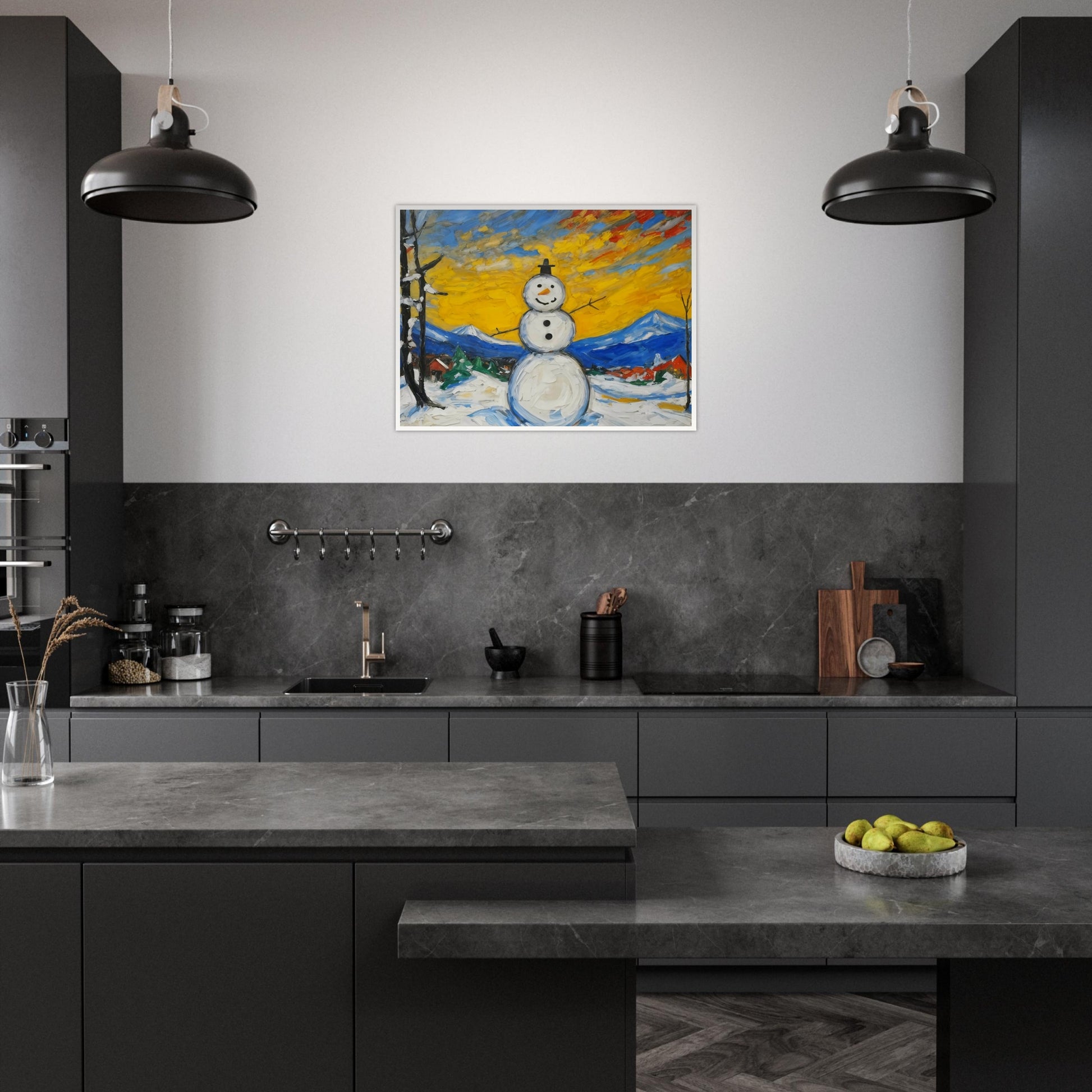 Frosty Sunrise wall art captures the cheerful spirit of winter, featuring a snowman standing proudly against a colorful and vibrant sky. The dynamic colors of yellow, blue, and white reflect the warmth of a sunrise in a snowy landscape. The simple yet joyful depiction of the snowman adds a playful and nostalgic touch to the scene, bringing life to a crisp winter morning.
