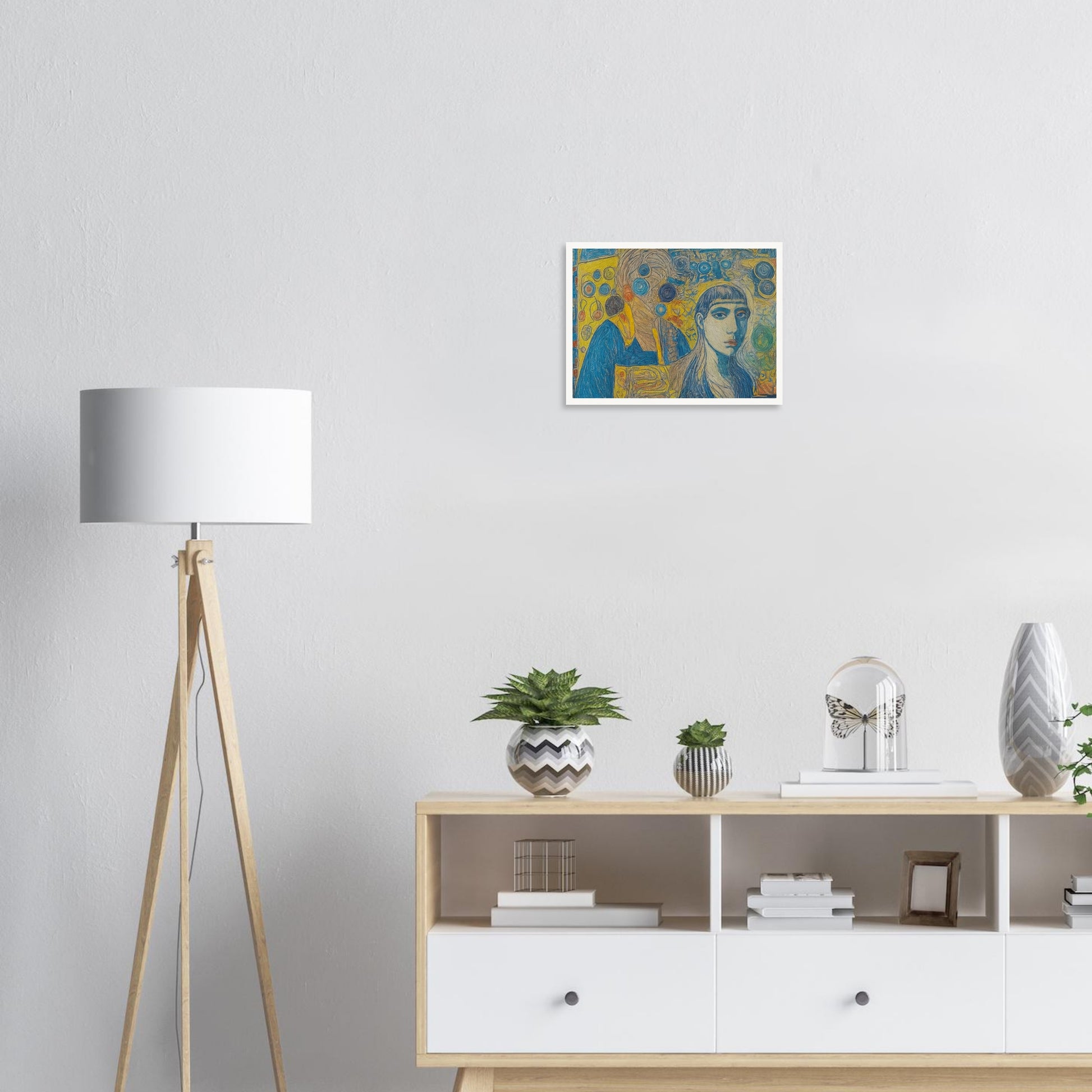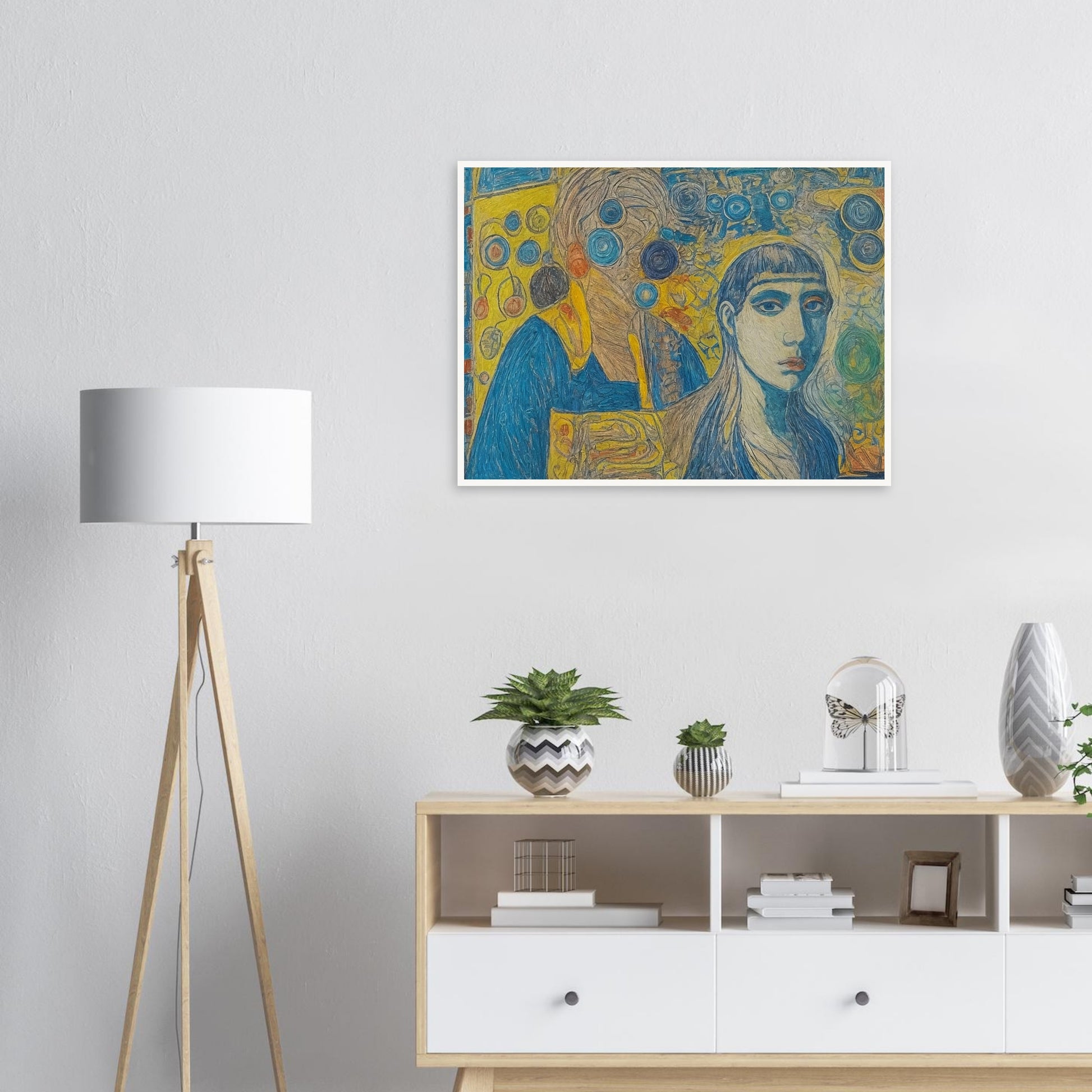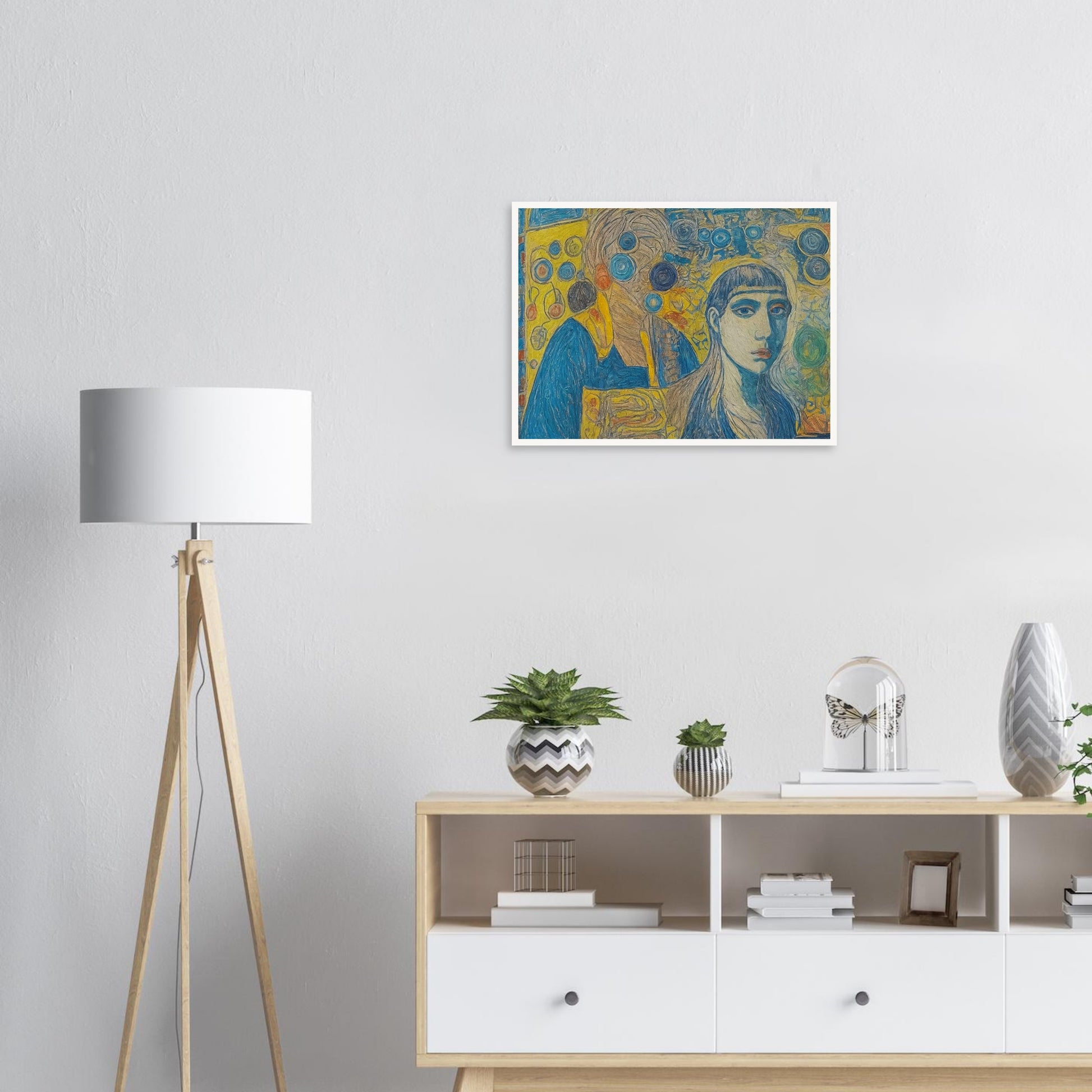 Interwoven Identities wall art blends vivid colors and intricate patterns to create a thought-provoking composition. Dominated by shades of blue and yellow, the artwork captures two figures that appear to merge with an abstract, swirling background, reflecting themes of identity and connection. The use of bold lines and overlapping elements gives the piece a dynamic, layered appearance. This artwork employs a mix of realism and abstraction, using contrast and repetition to draw the viewer's eye across the canvas. The juxtaposition of the detailed faces against the abstract background suggests a narrative of inner thoughts or emotional complexity.