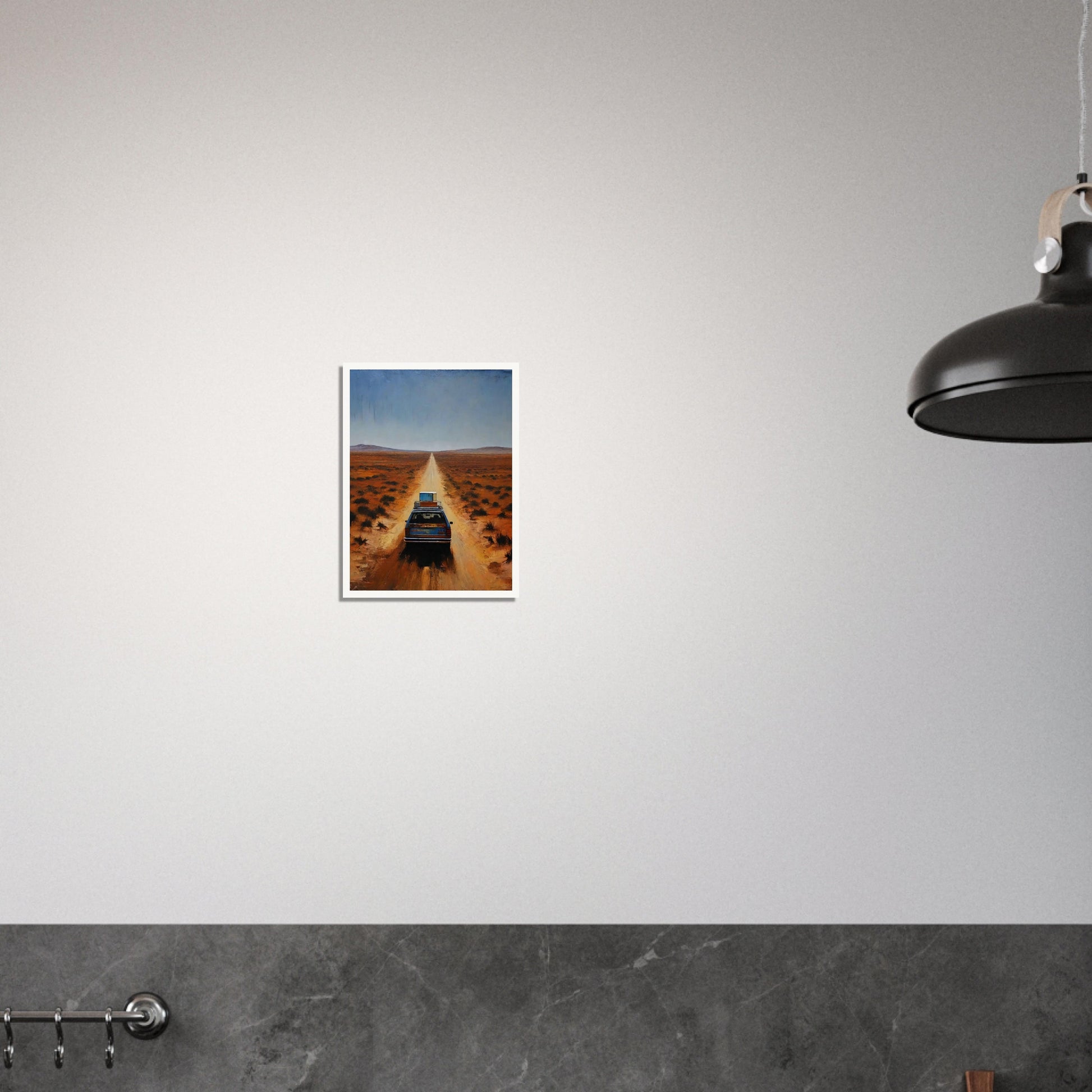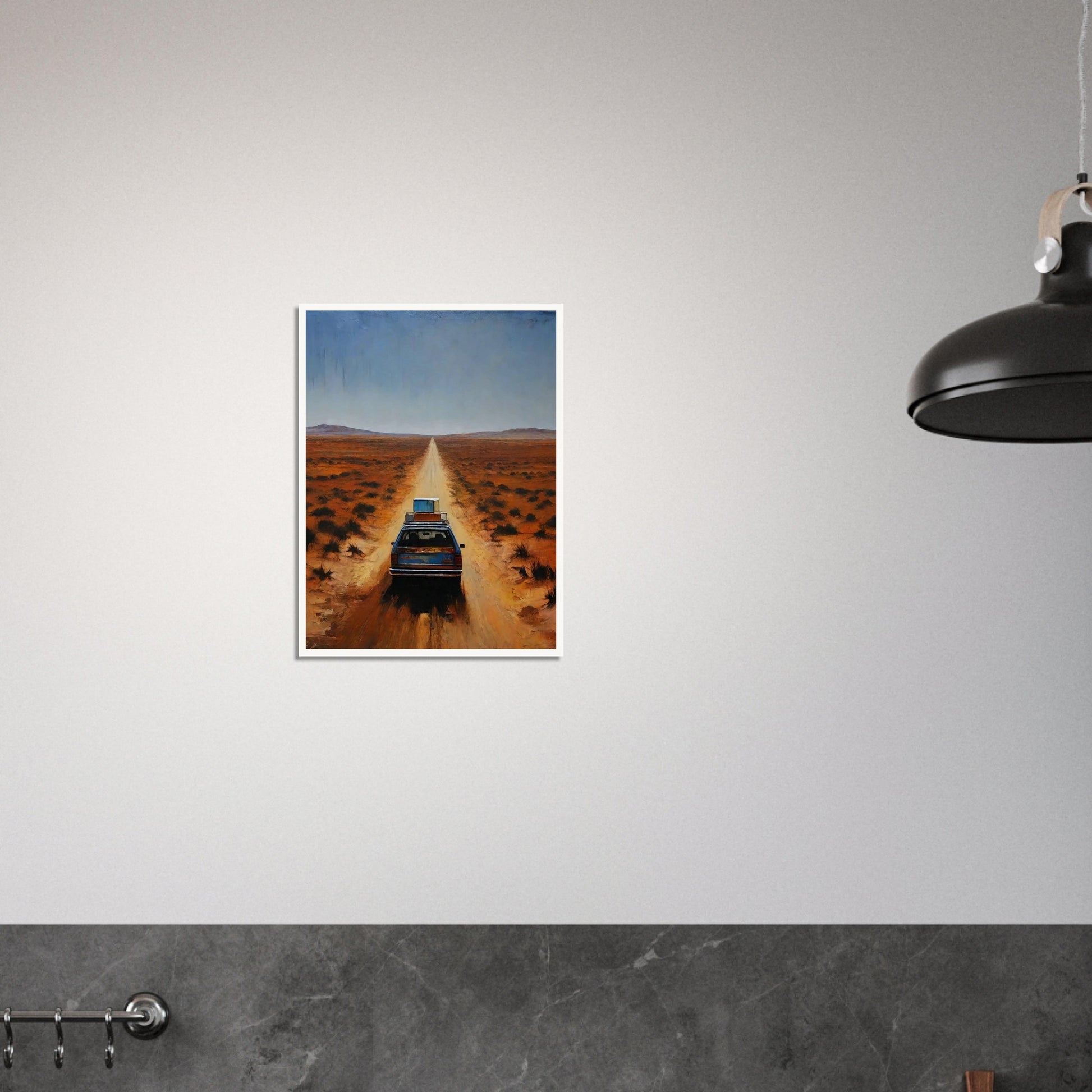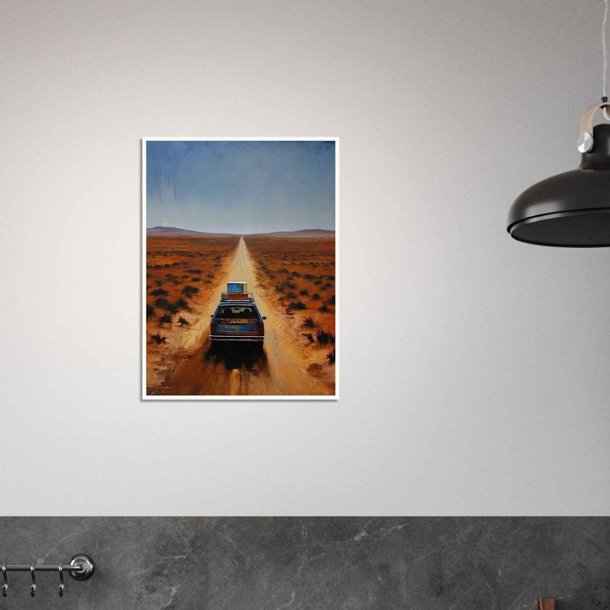 Journey to the Unknown wall art invites the viewer into a captivating scene of solitude and adventure. The artwork depicts a lone car traveling down an endless road through a vast, desolate landscape. The warm, earthy tones of the desert contrast with the deep blue sky, creating a sense of both isolation and freedom. This piece masterfully captures the essence of a journey into the unknown, evoking feelings of curiosity and exploration.