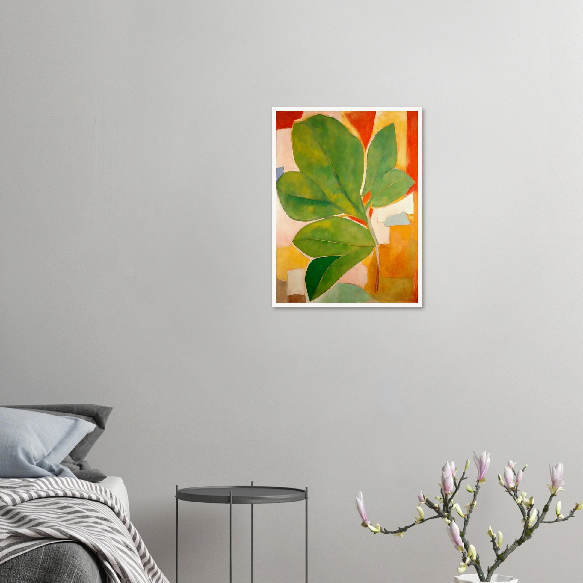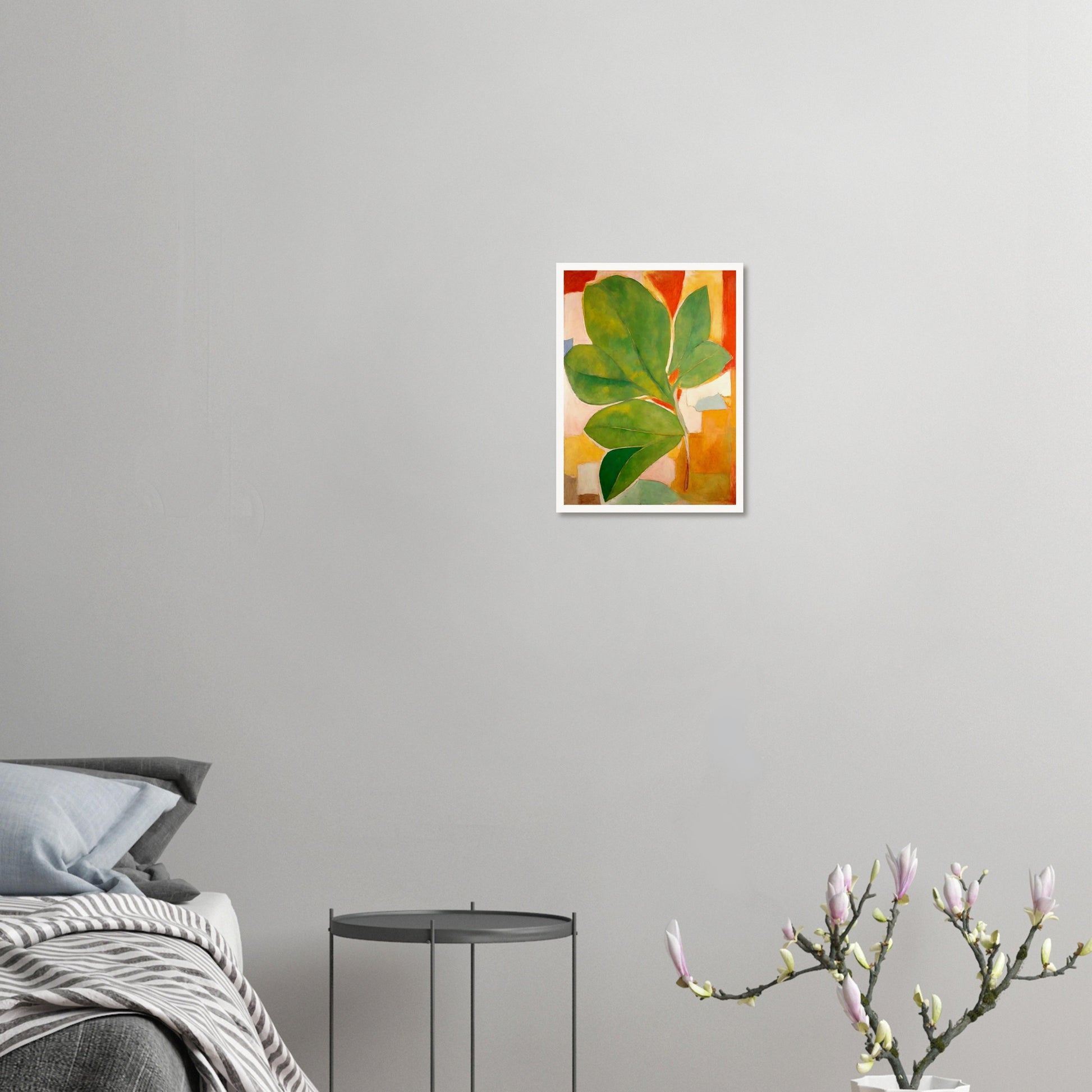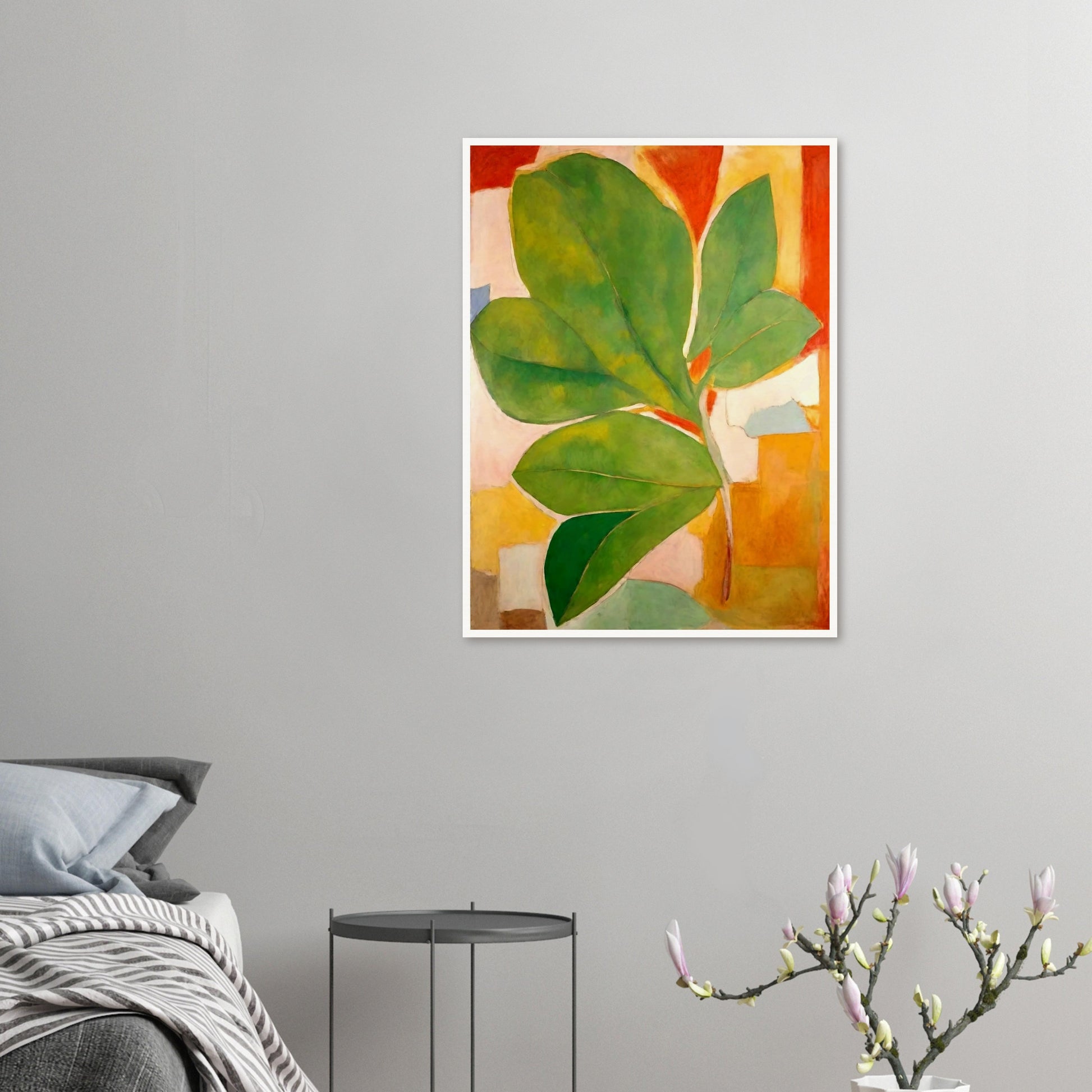 Leaf and Form wall art captures the organic beauty of a large green leaf against a vibrant backdrop of abstract shapes. The softness of the leaf contrasts beautifully with the bold, geometric colors, creating a harmonious balance between nature and art. This artwork creates a sense of serenity and warmth, making it an ideal addition to modern and natural spaces.