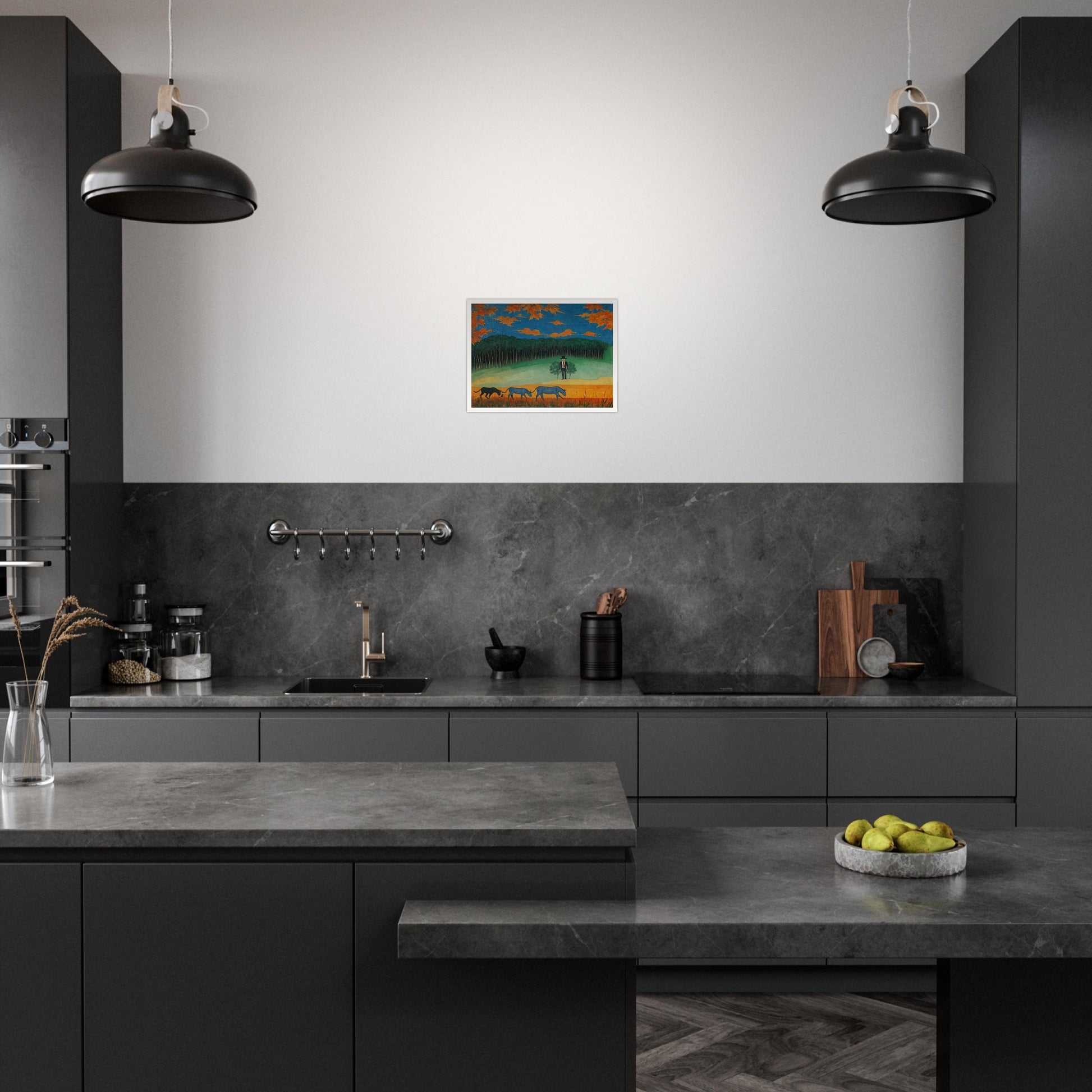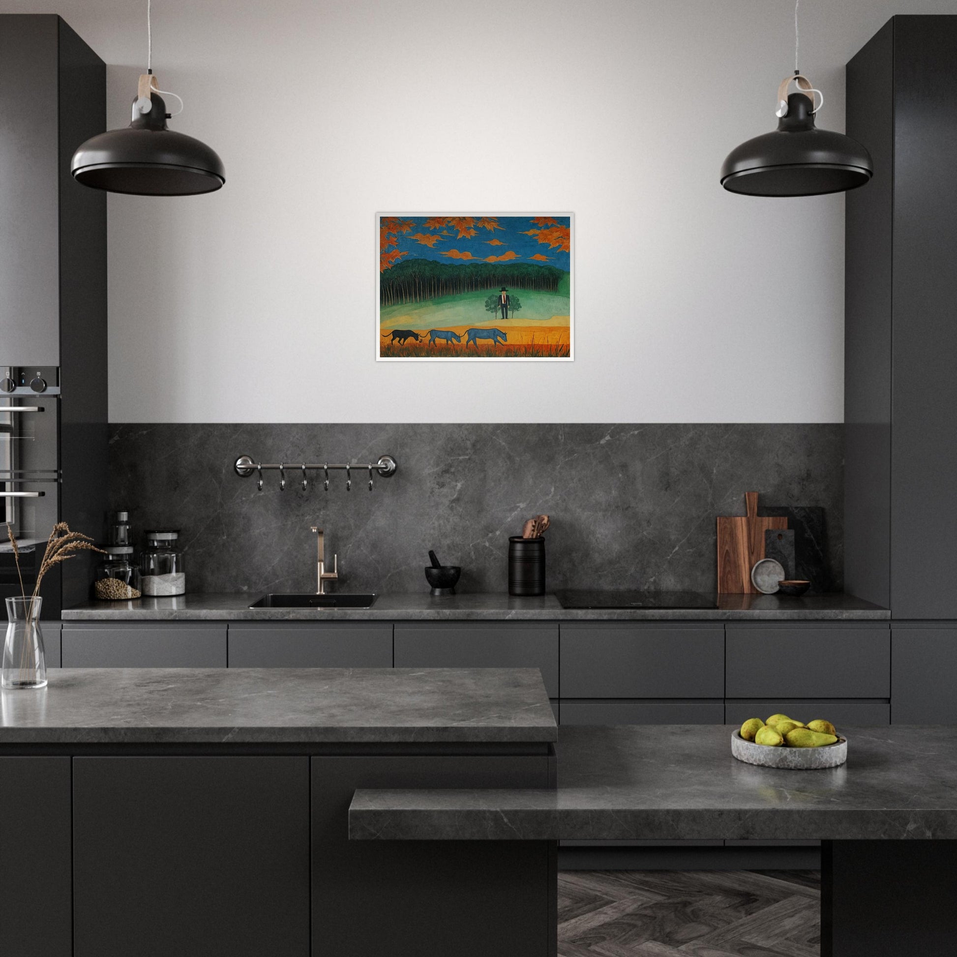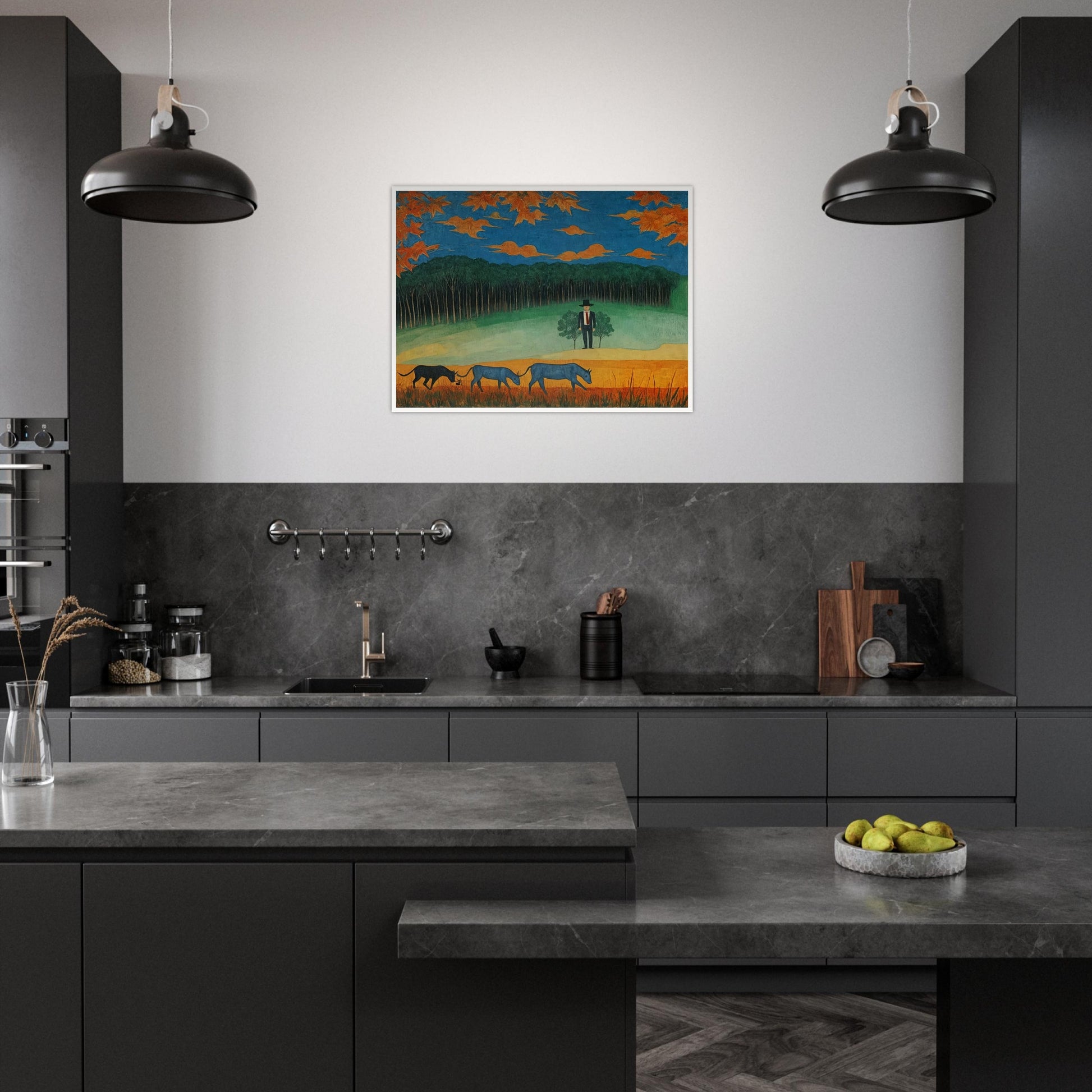 Man and Autumn Pasture wall art brings forth the peaceful essence of a quiet countryside scene bathed in the colors of autumn. It is a landscape filled with a harmonious palette, emphasizing the beauty of a calm autumn day. The artwork’s balanced composition and soft, natural tones make it a perfect fit for spaces that exhibit warmth and tranquility.