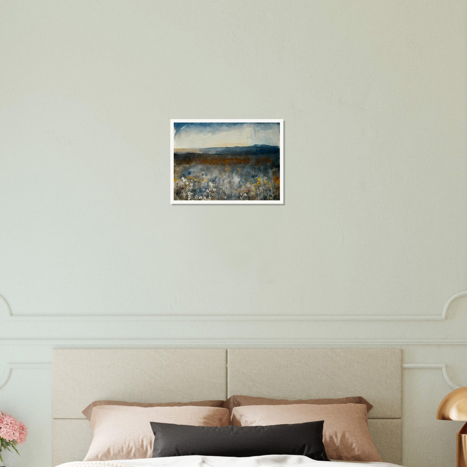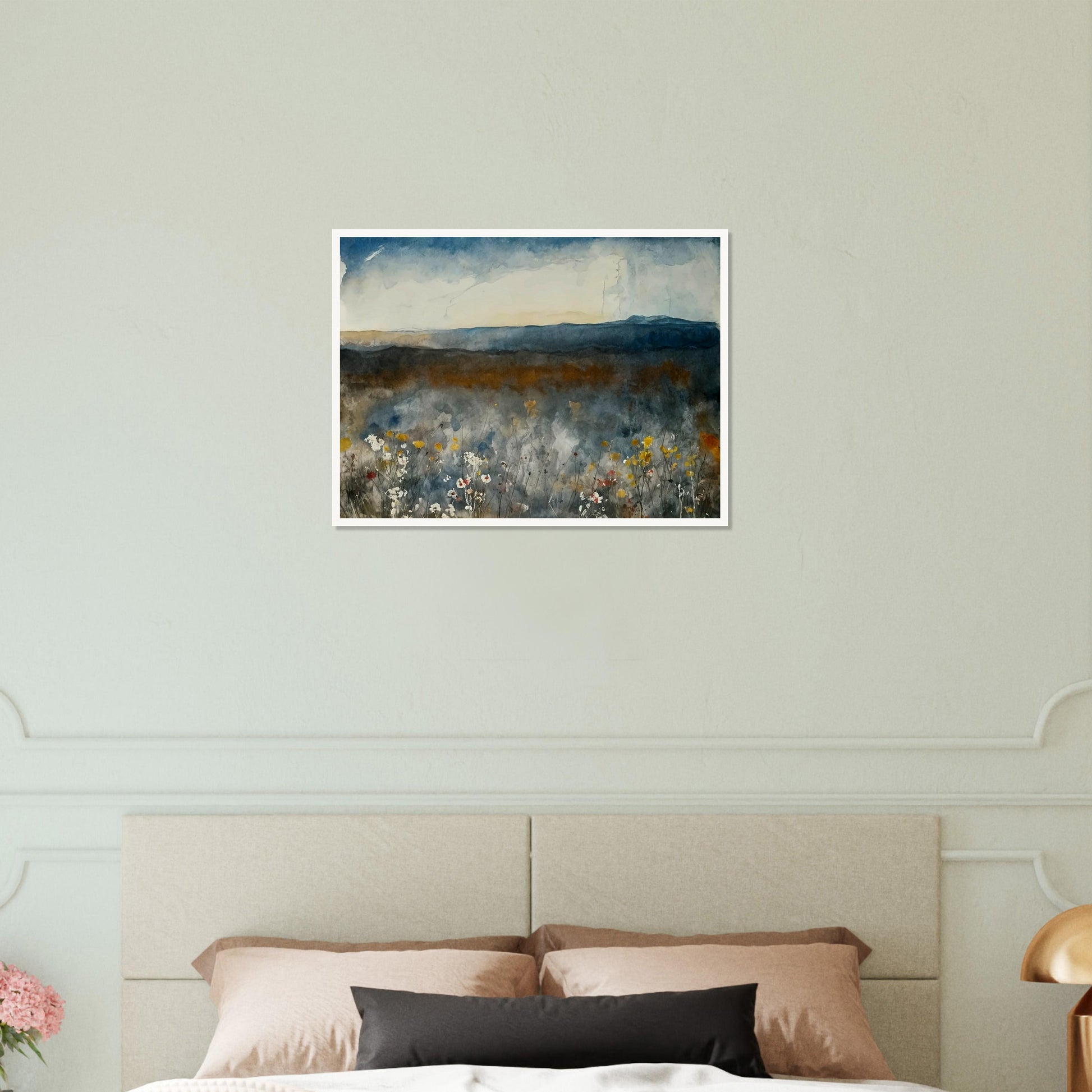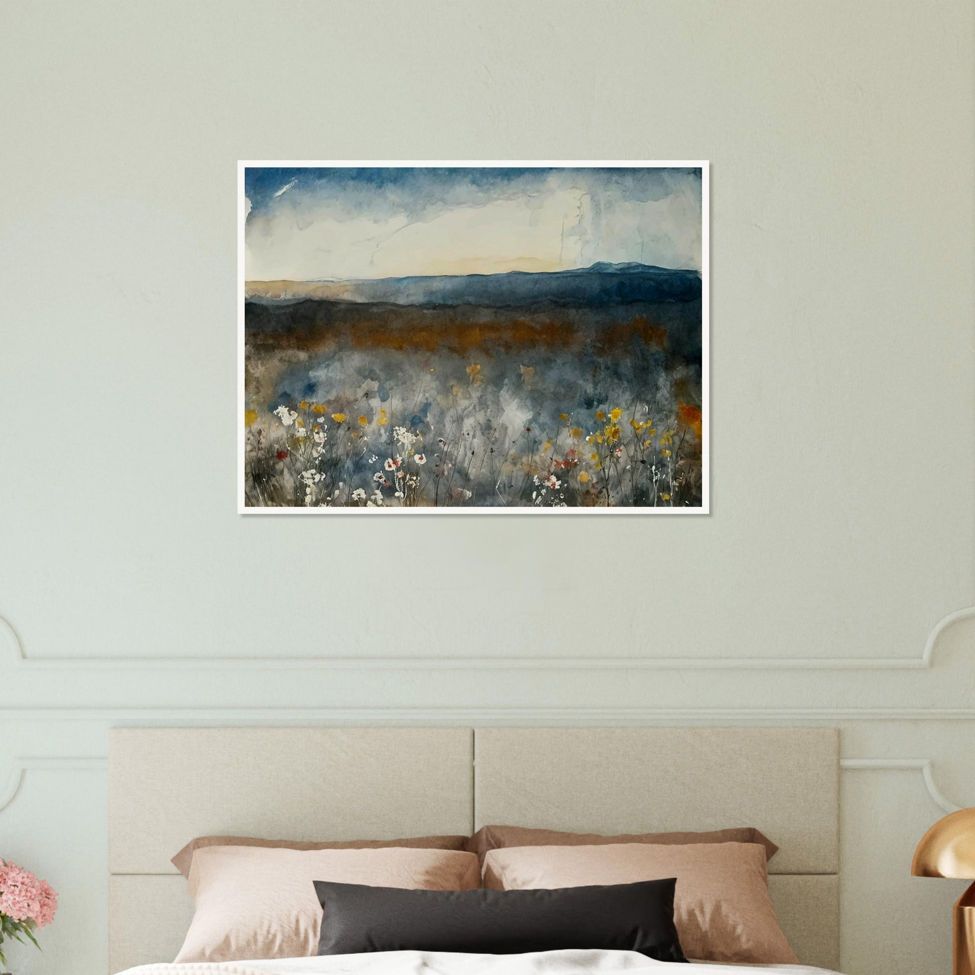 Misty Meadow wall art captures the essence of a tranquil landscape with a soft, atmospheric palette that conveys a sense of peace and serenity. The subtle blending of colors and gentle brushstrokes create a misty effect that blurs the lines between sky, land, and flora, immersing viewers in the natural beauty of the scene. This artwork offers a delicate balance of color and texture, perfect for bringing a touch of nature indoors.