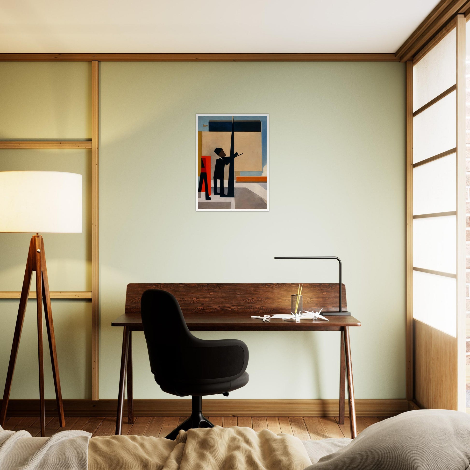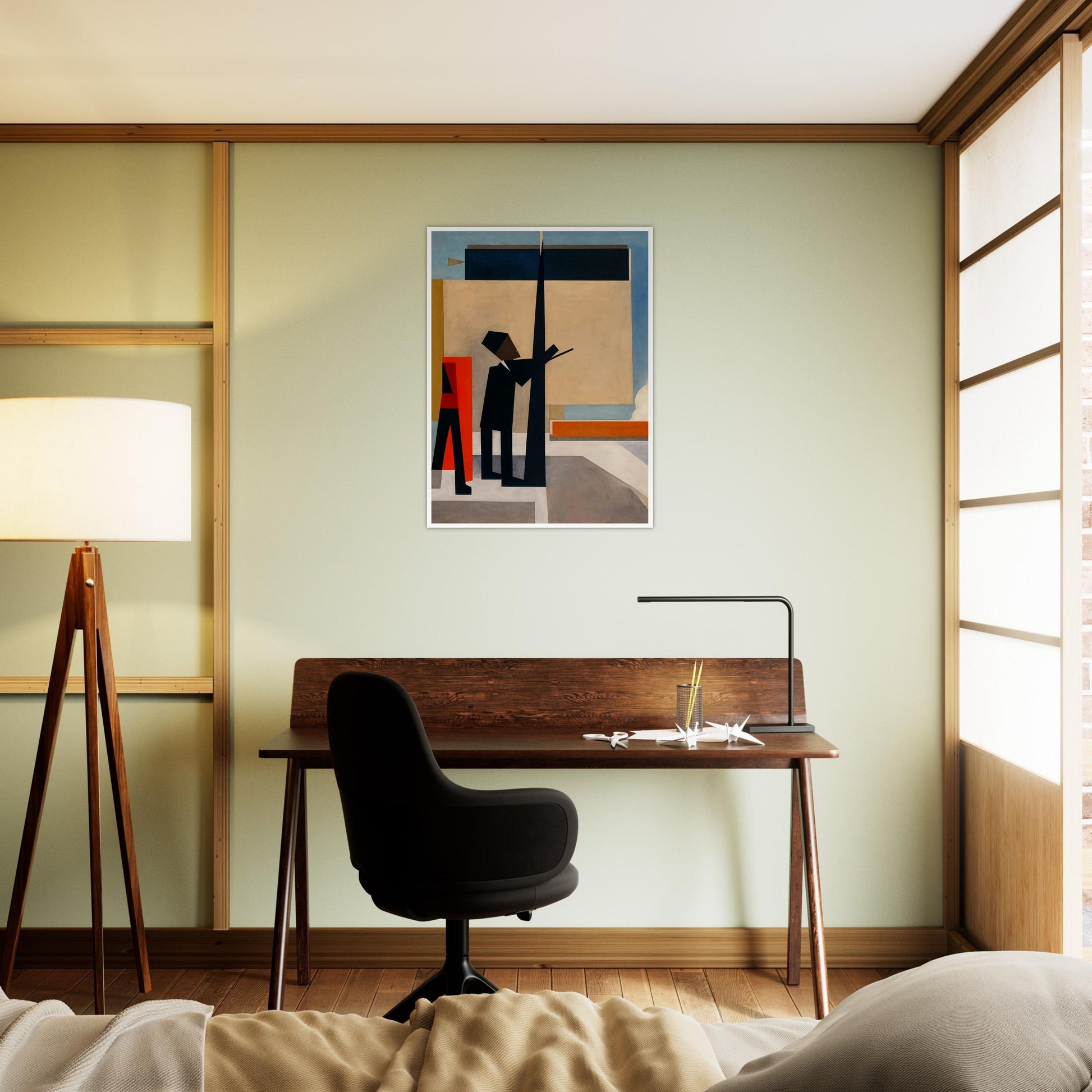 Modern Connections wall art brings together bold geometric shapes and contrasting colors, creating a compelling abstract representation of people in an urban setting. The use of solid black, red, and beige forms against a light blue background adds depth and dimension, drawing the eye to the interaction between the figures. This piece uses a minimalistic, modern style with clean lines and sharp angles, focusing on the silhouettes and outlines of human figures. The simplicity of the design contrasts with the complexity of the human relationships it suggests, making it an engaging visual experience.