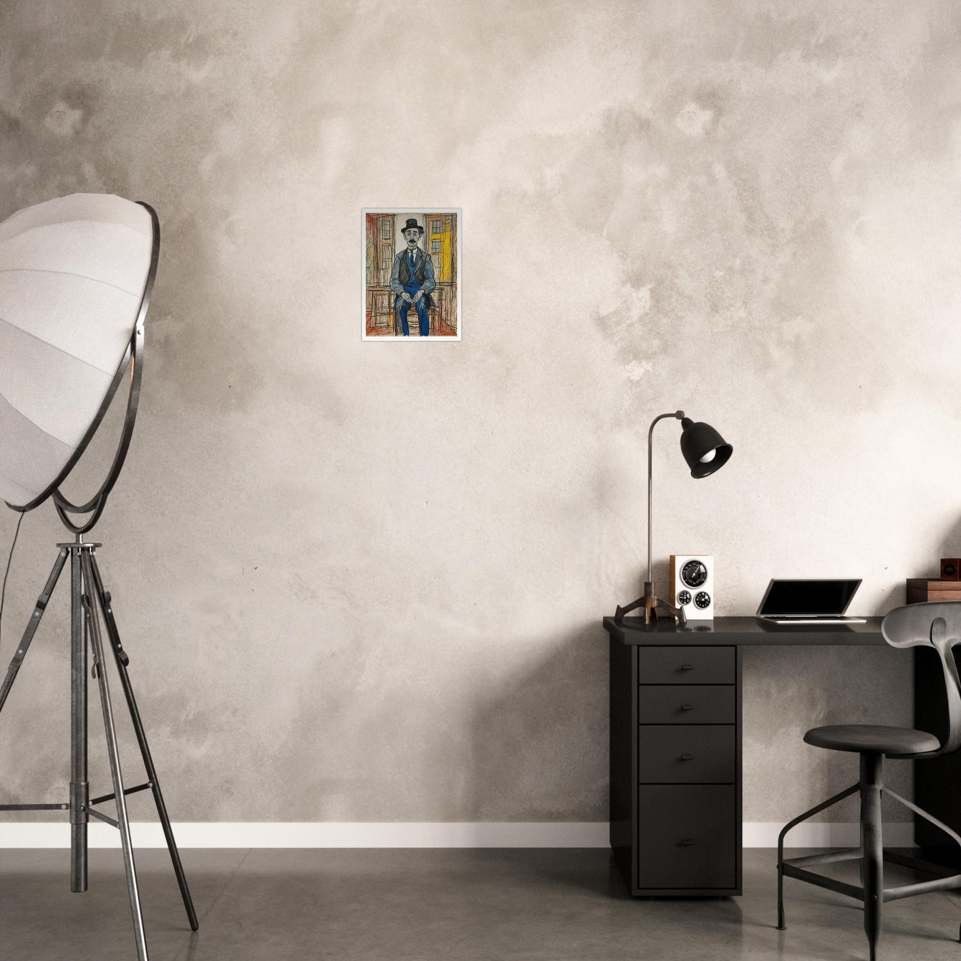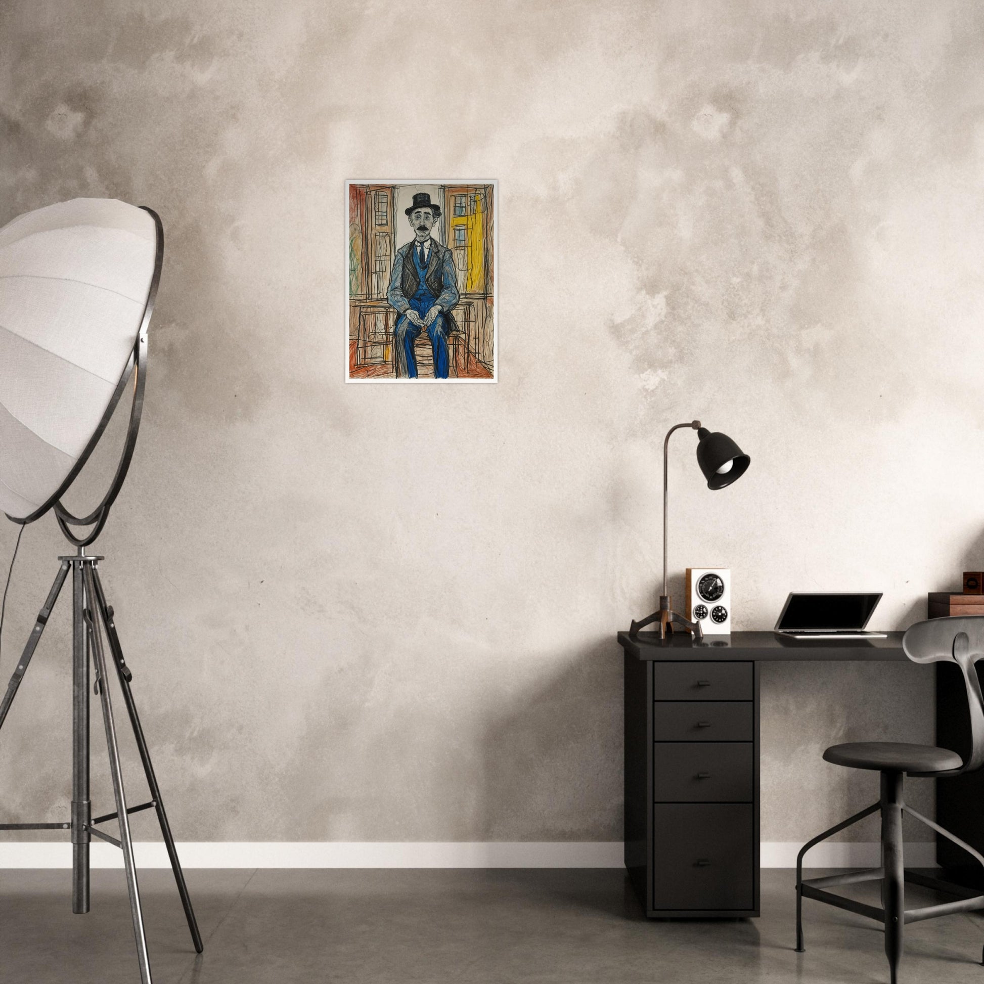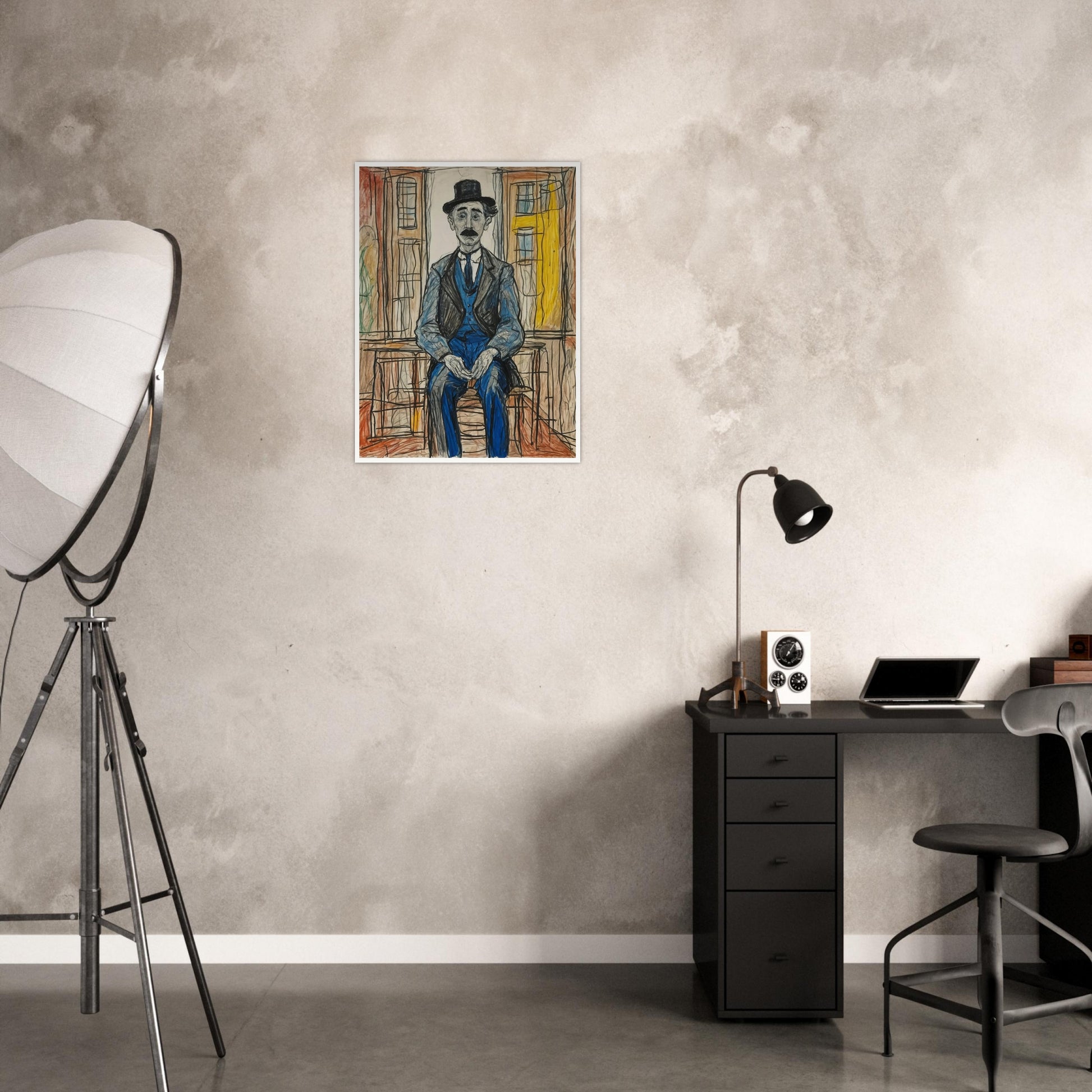 Pensive Man in Blue wall art features a reflective figure seated against an abstract urban backdrop. This vintage-inspired piece uses bold, sketch-like lines and muted colors to portray a quiet, contemplative mood, perfect for adding character to any space. With its expressive style and focus on the human form, the artwork captures a moment of thoughtful pause. The simple yet effective composition draws the viewer’s attention to the character’s introspective posture.