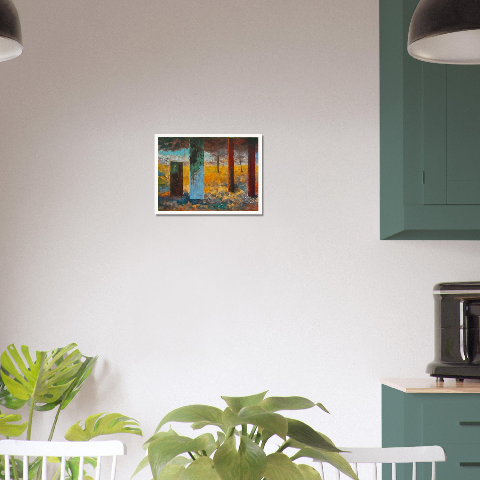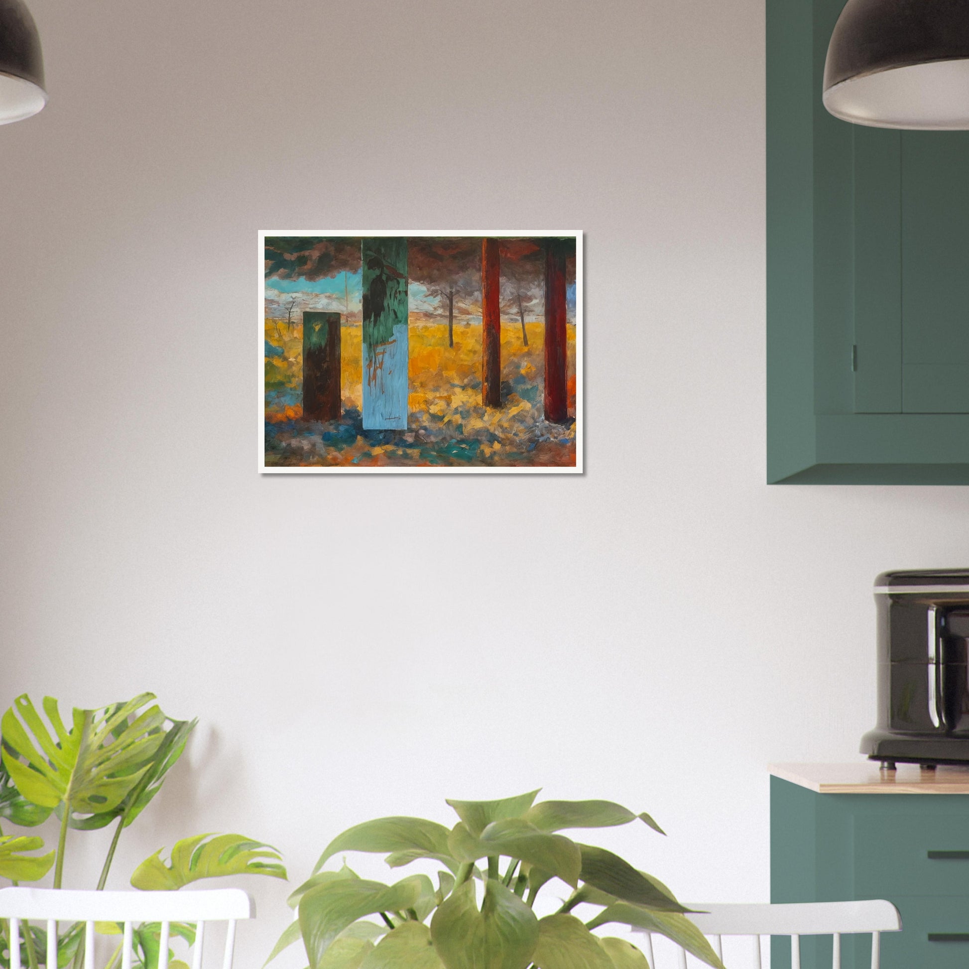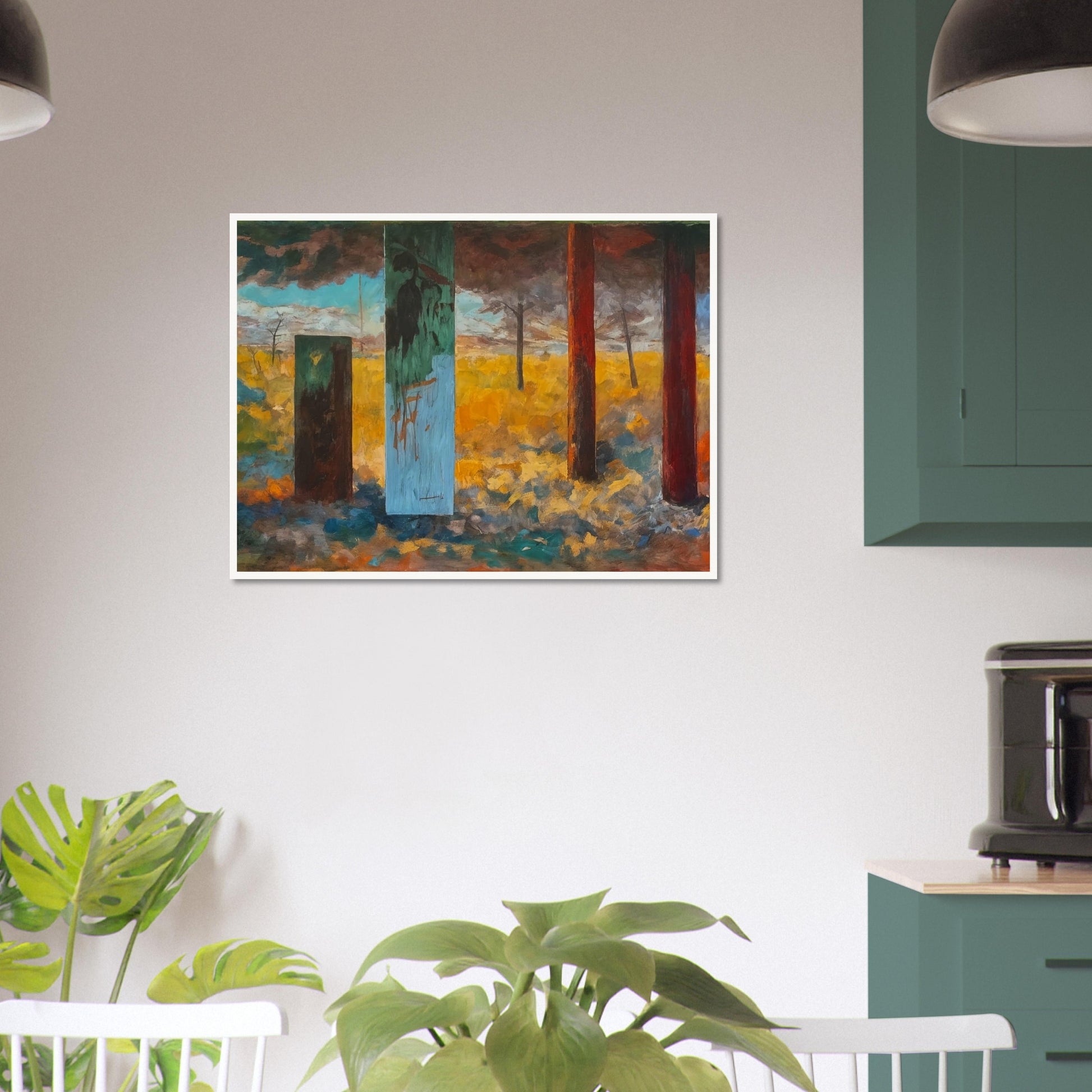 Pillars of Time wall art immerses the viewer in a surreal landscape where abstract elements meet vivid colors. The composition features tall, weathered pillars rising from a textured ground, each standing as a silent witness to the passage of time. The dramatic use of light and shadow, combined with the contrasting hues of golden yellows, deep reds, and blues, creates a scene that feels both dreamlike and rooted in reality. The artwork balances the abstract and the surreal, with each pillar acting as a focal point that guides the eye through the composition. The varied textures and brushstrokes add depth to the landscape, inviting a sense of mystery and contemplation, as if each pillar holds a secret from the past.