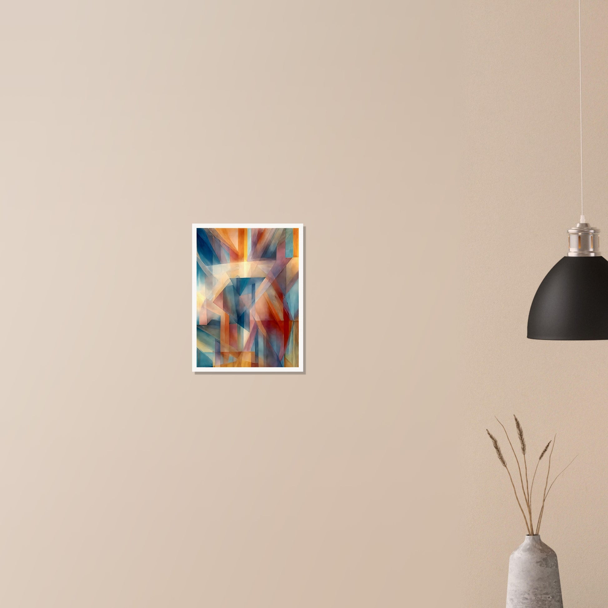 Prismatic Paths wall art combines dynamic, geometric shapes with a soft yet vibrant palette of blue, orange, and red. The bold color transitions, juxtaposed with the sharp angles and intersecting planes, invite the viewer to explore the piece from various perspectives. Its smooth gradients and radiant hues convey a sense of movement and depth, making it an ideal accent for modern interiors. This artwork’s clean lines and warm yet cool colors make it an excellent addition to any living room, office, or space that benefits from a contemporary, artistic touch.