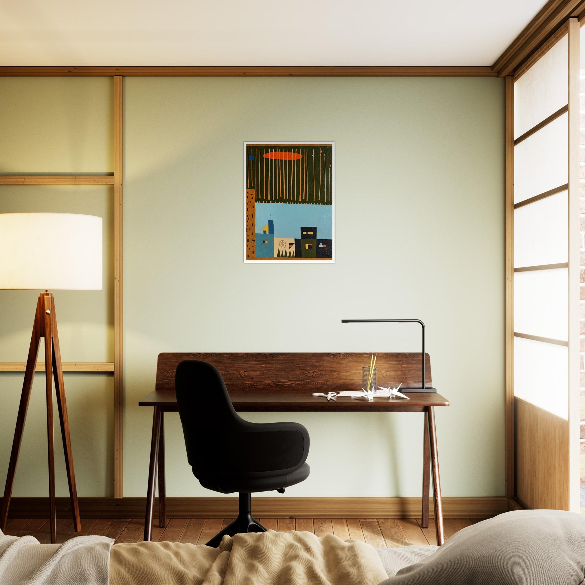Quiet Horizons wall art is a tranquil landscape that juxtaposes the calmness of a serene village with the vibrancy of a stylized sky. This piece features a minimalist palette with hues of blue, green, orange, and black, encapsulating a peaceful yet modern feel. The composition is rooted in expressionism, with simplified forms and bold lines defining the landscape. The vertical lines of the trees and the horizontal layout of the village create a balanced and soothing visual effect.