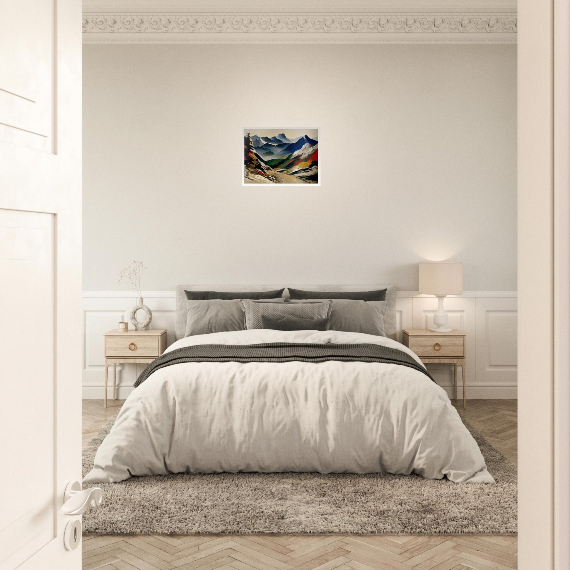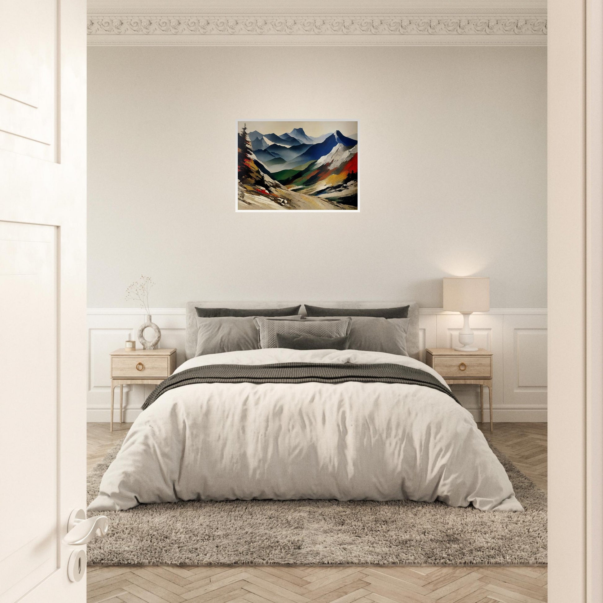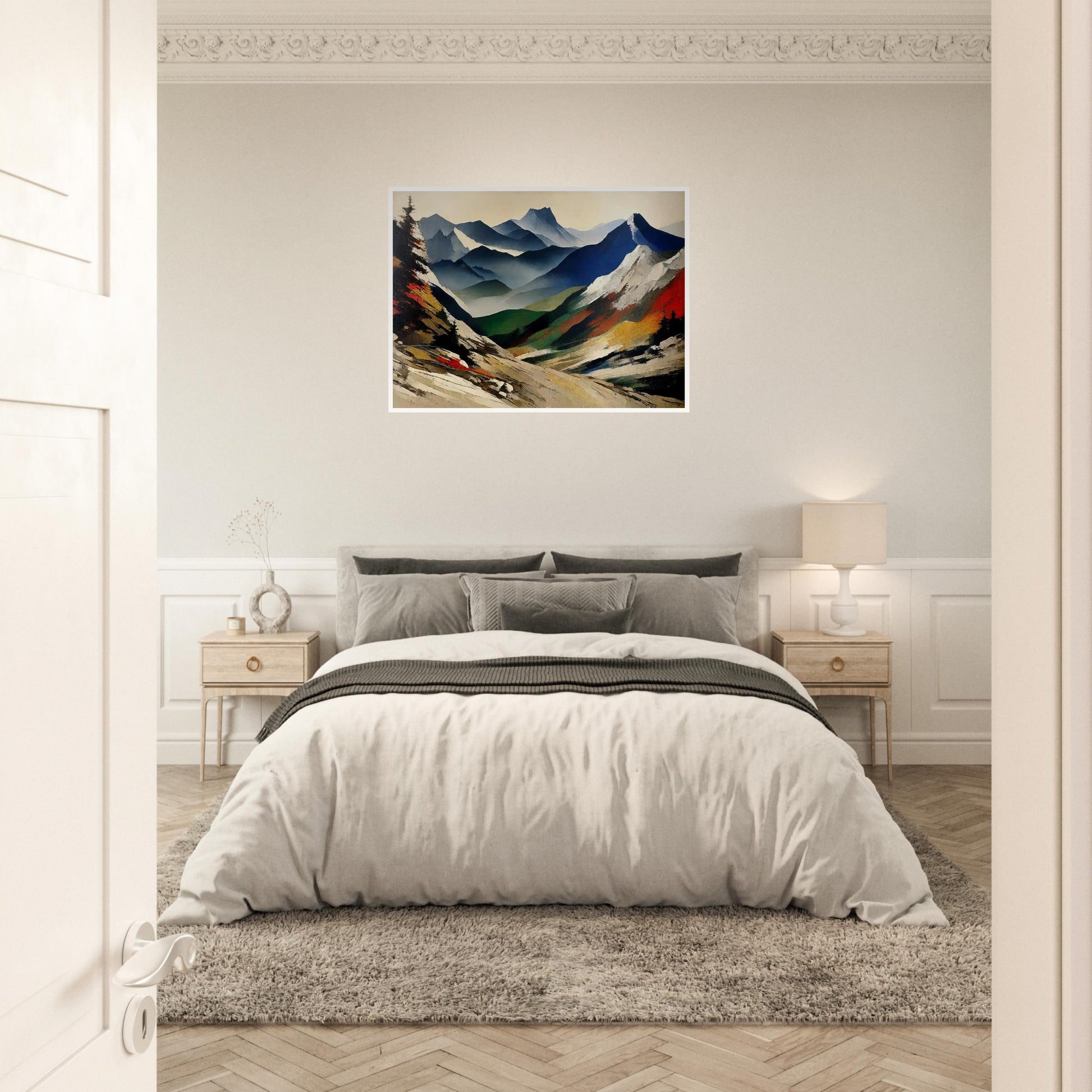 Quiet Mountains wall art showcases a serene mountain range, with layers of mist and varying shades of green, blue, and grey. This realistic depiction captures the grandeur of nature, with sharp peaks and soft valleys blending harmoniously. The artwork features a soothing color palette, including earth tones and deep blues, that reflects the calmness of the mountains. The detailed brushstrokes convey the textures of the rugged terrain, adding a sense of depth and realism.
