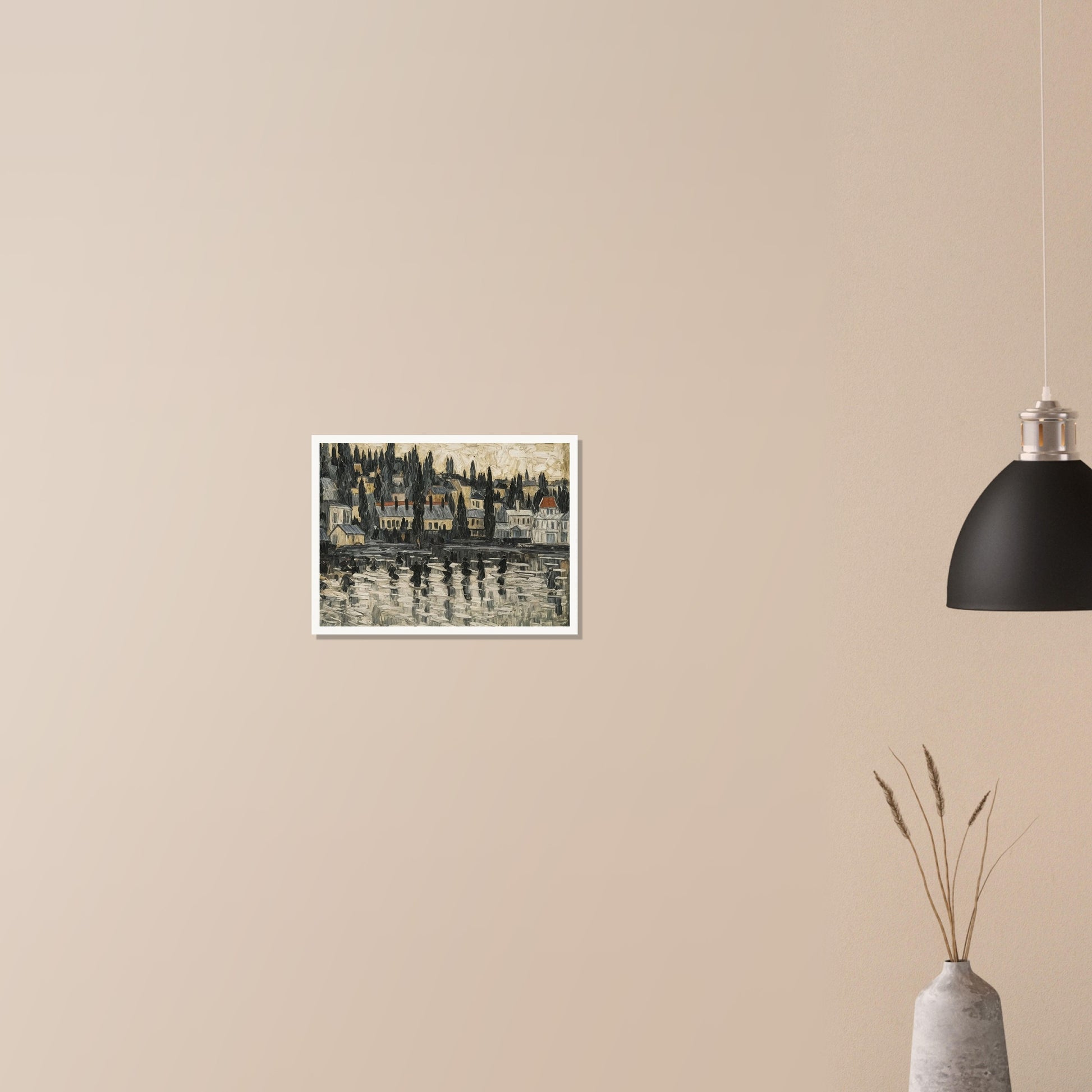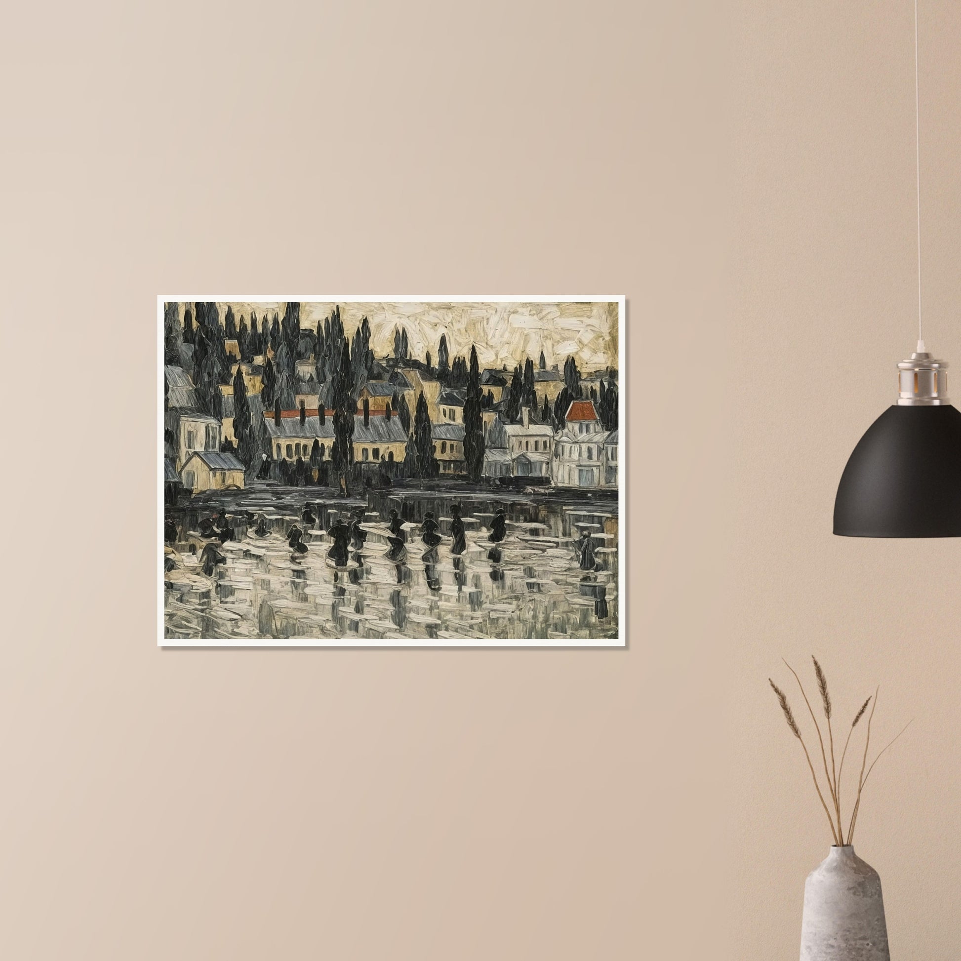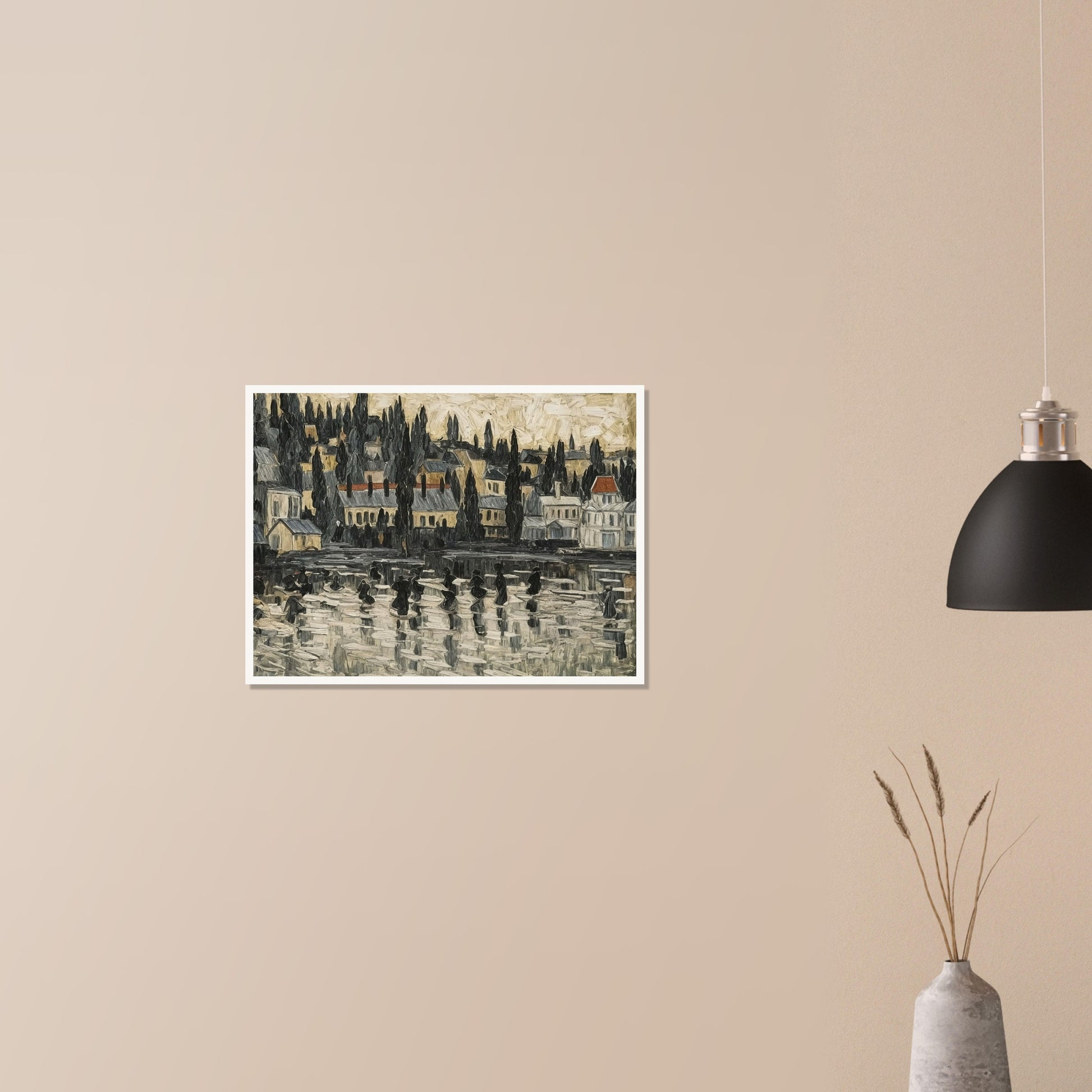 Reflections of Time wall art captures a tranquil, nostalgic moment in a historic village by the water. With its reflective surface, the piece portrays a timeless connection between nature and the passage of time. The muted and swirling tones invite viewers to immerse themselves in the serene beauty of the scene. Perfect for adding depth to your living room, lobby, or hallway, this piece resonates with those who appreciate the calmness in natural surroundings.