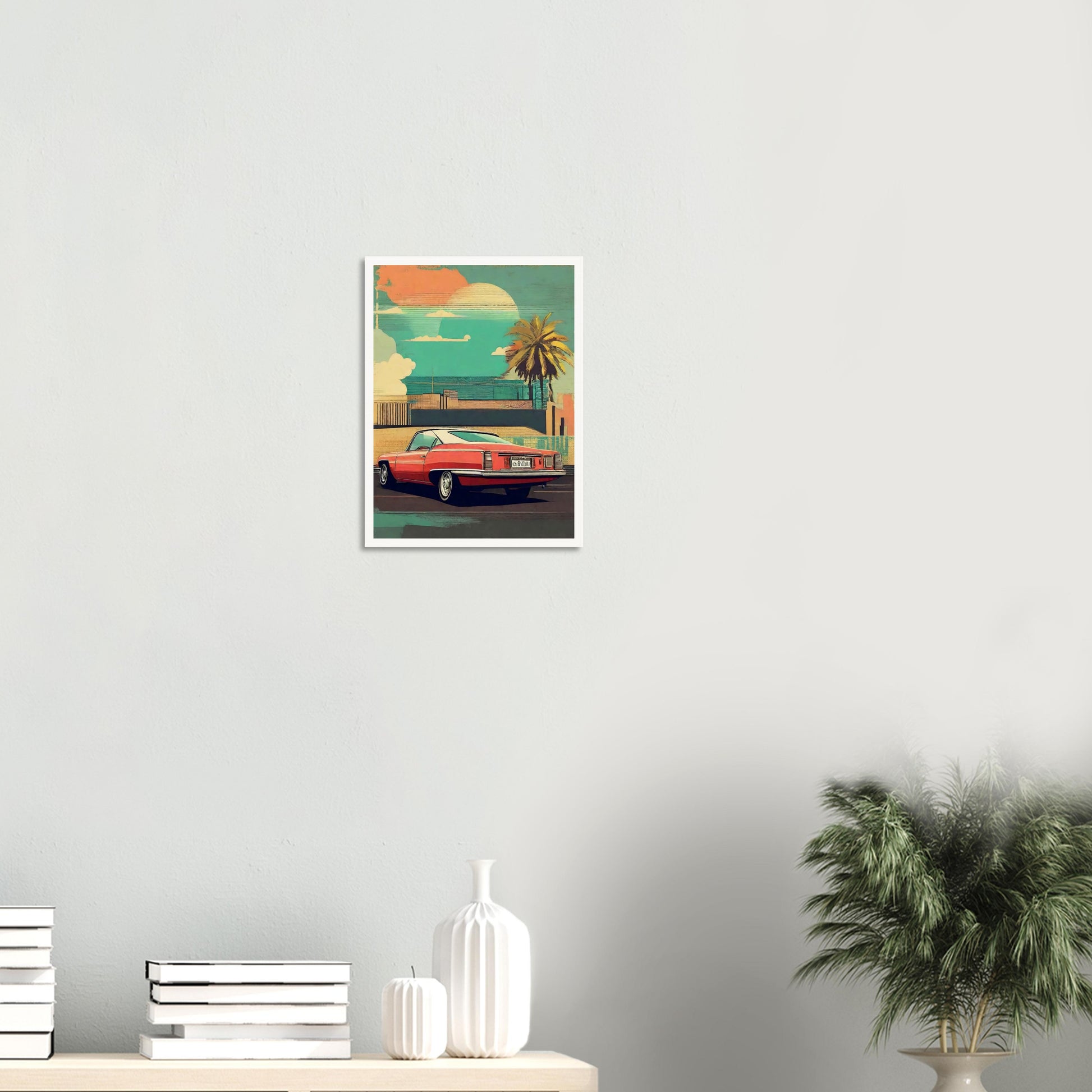Retro Road Trip wall art is a nostalgic piece of vintage wall art, captures the essence of a classic American road trip with its vibrant colors and detailed depiction of a vintage car against a picturesque backdrop. The artwork’s bold, retro-inspired design evokes a sense of freedom and adventure, making it a perfect tribute to the open road. The combination of warm oranges, teal blues, and soft yellows creates a harmonious color palette that enhances the retro aesthetic. The detailed rendering of the car and the stylized landscape adds depth and character to the piece, inviting viewers to relive the golden age of travel.