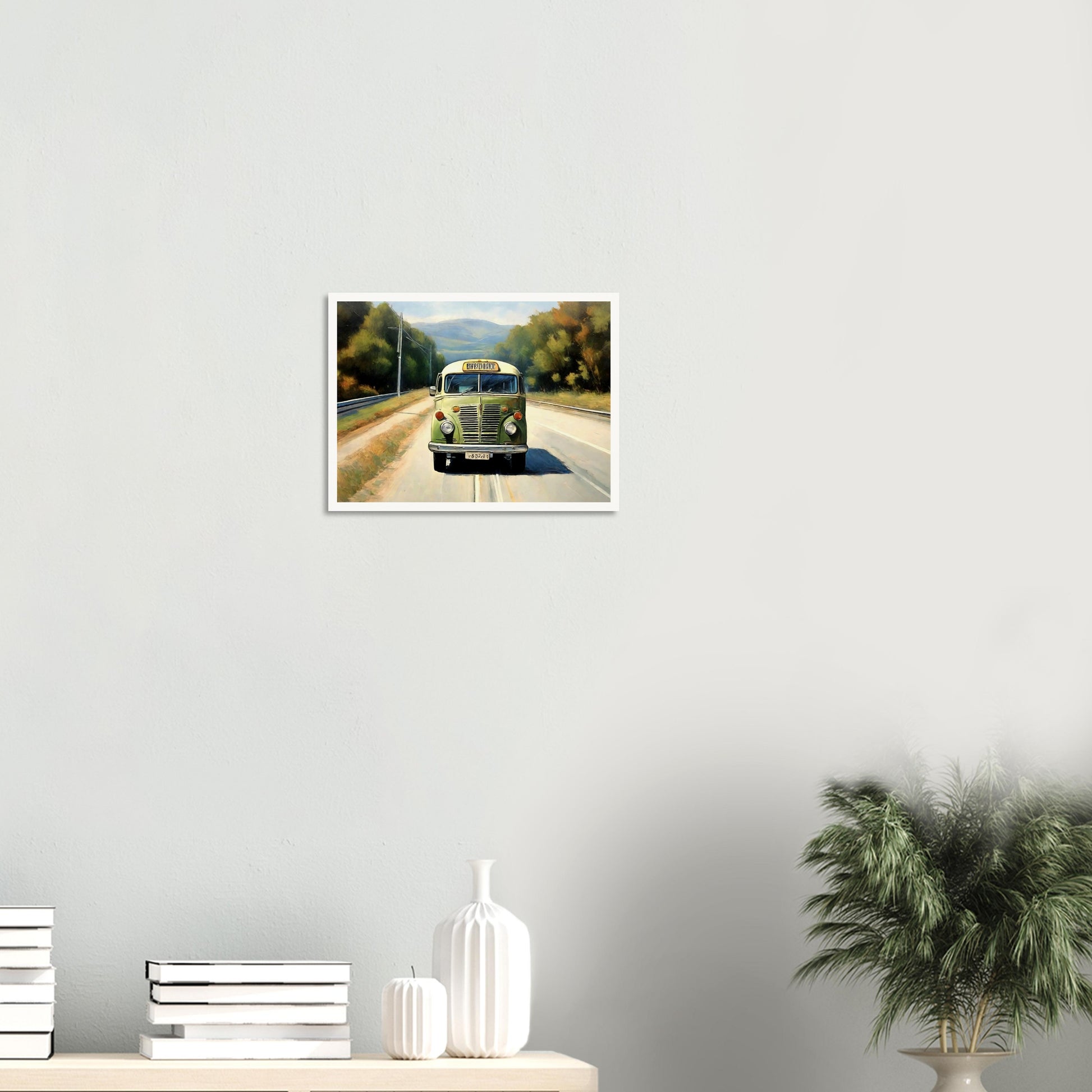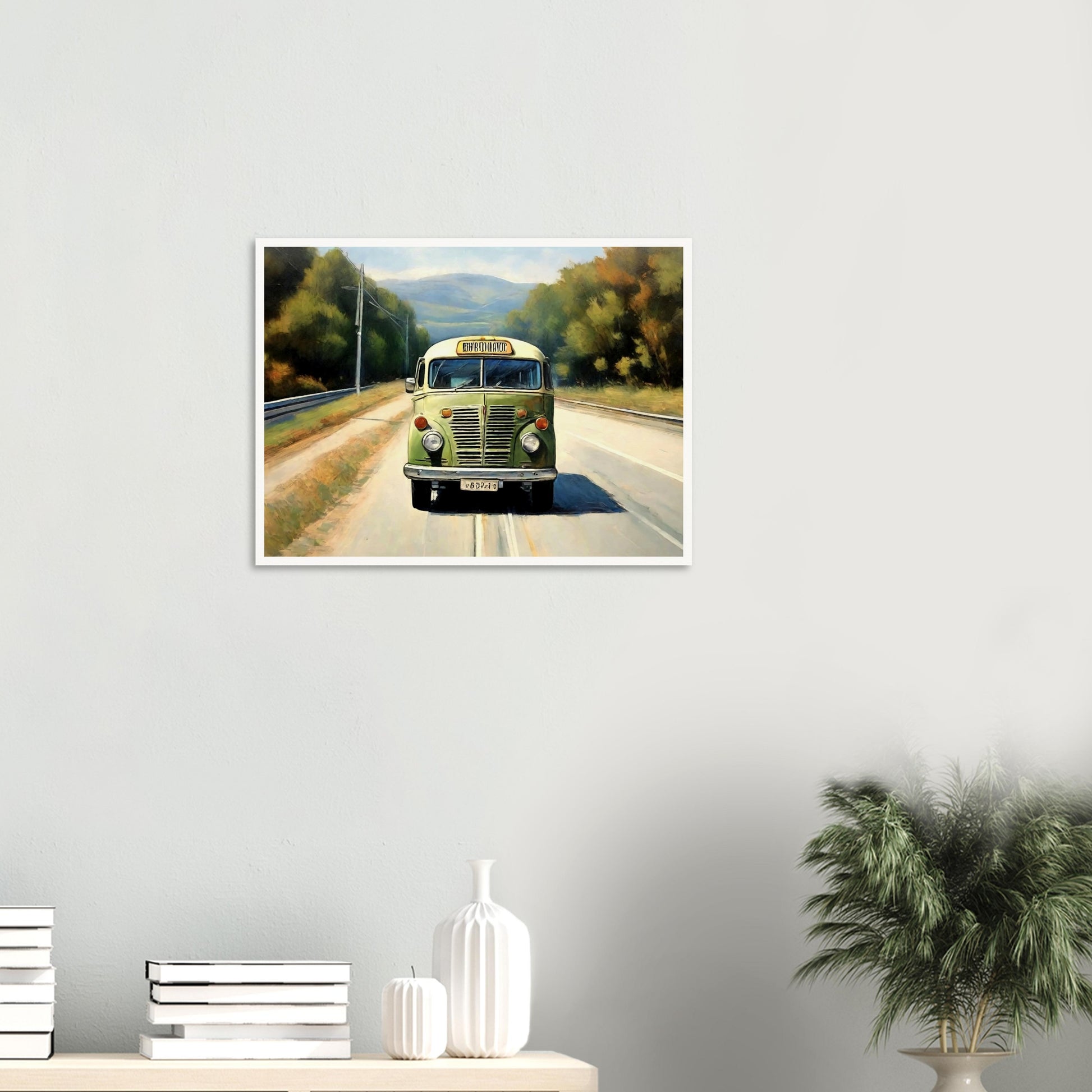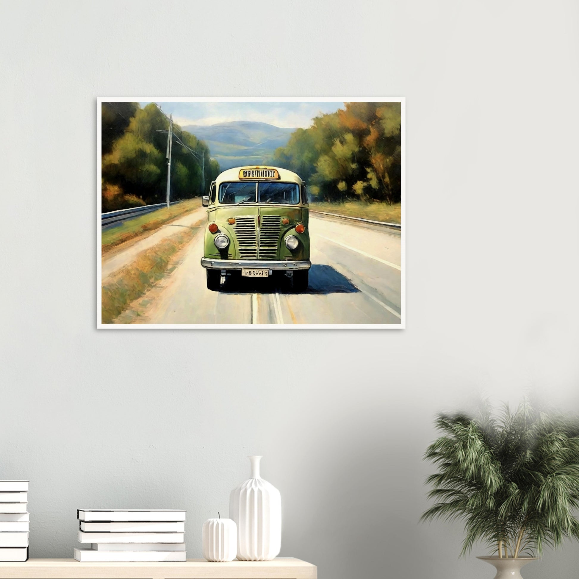 Retro Road Trip wall art captures the essence of a nostalgic journey, featuring a vintage green bus cruising down a scenic road surrounded by nature. The warm, inviting landscape complements the retro charm of the bus, depicting memories of carefree travels and adventurous days on the road. This artwork is a tribute to the freedom of the open highway.