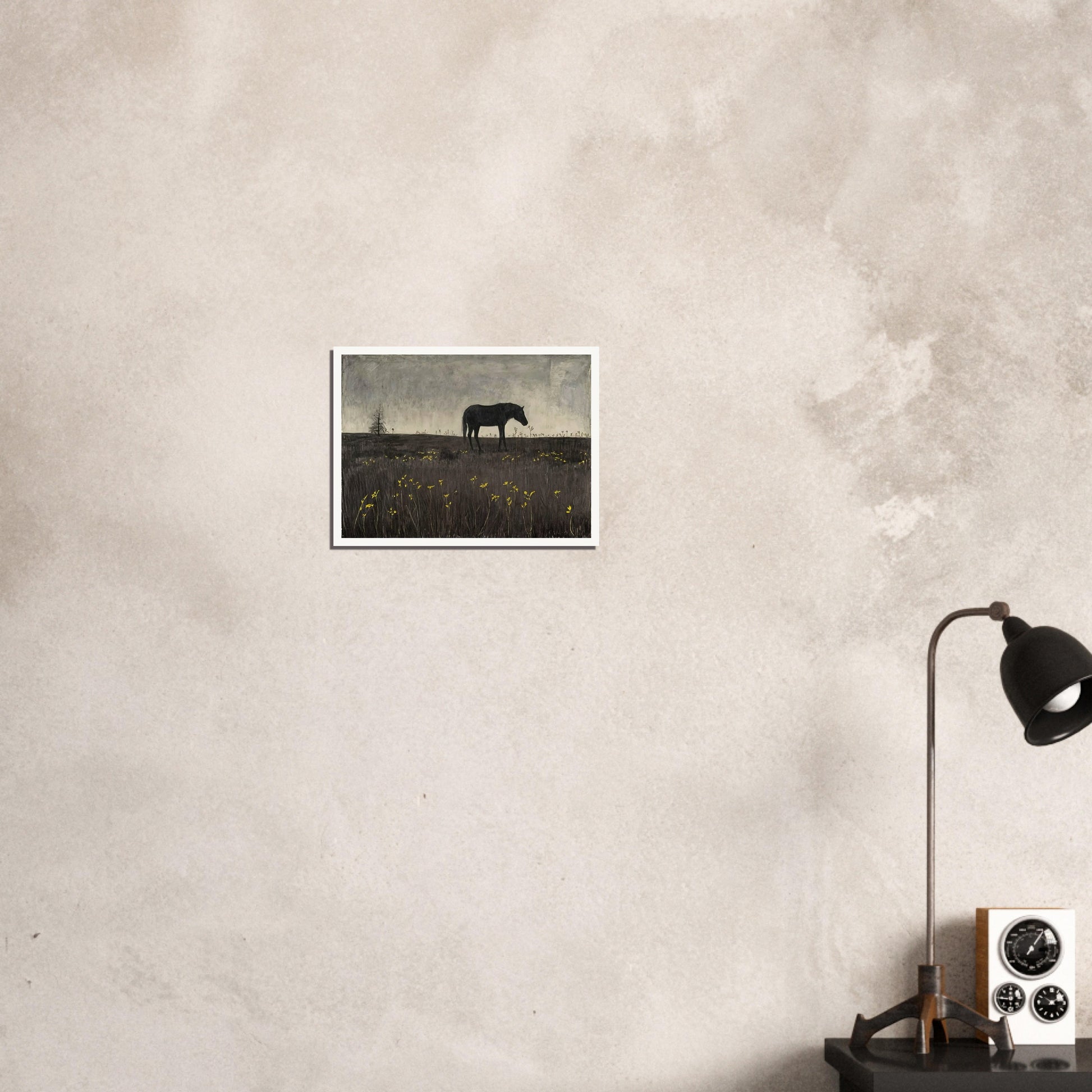 Silent Fields is an expressionist wall art print capturing the profound stillness of a lone horse standing in a shadowed field. The dark, muted tones of the landscape create a mood of quiet introspection, while delicate yellow flowers scattered across the ground add a whisper of hope and renewal. The balance between the somber hues and subtle bursts of color makes this artwork deeply evocative and layered with meaning.