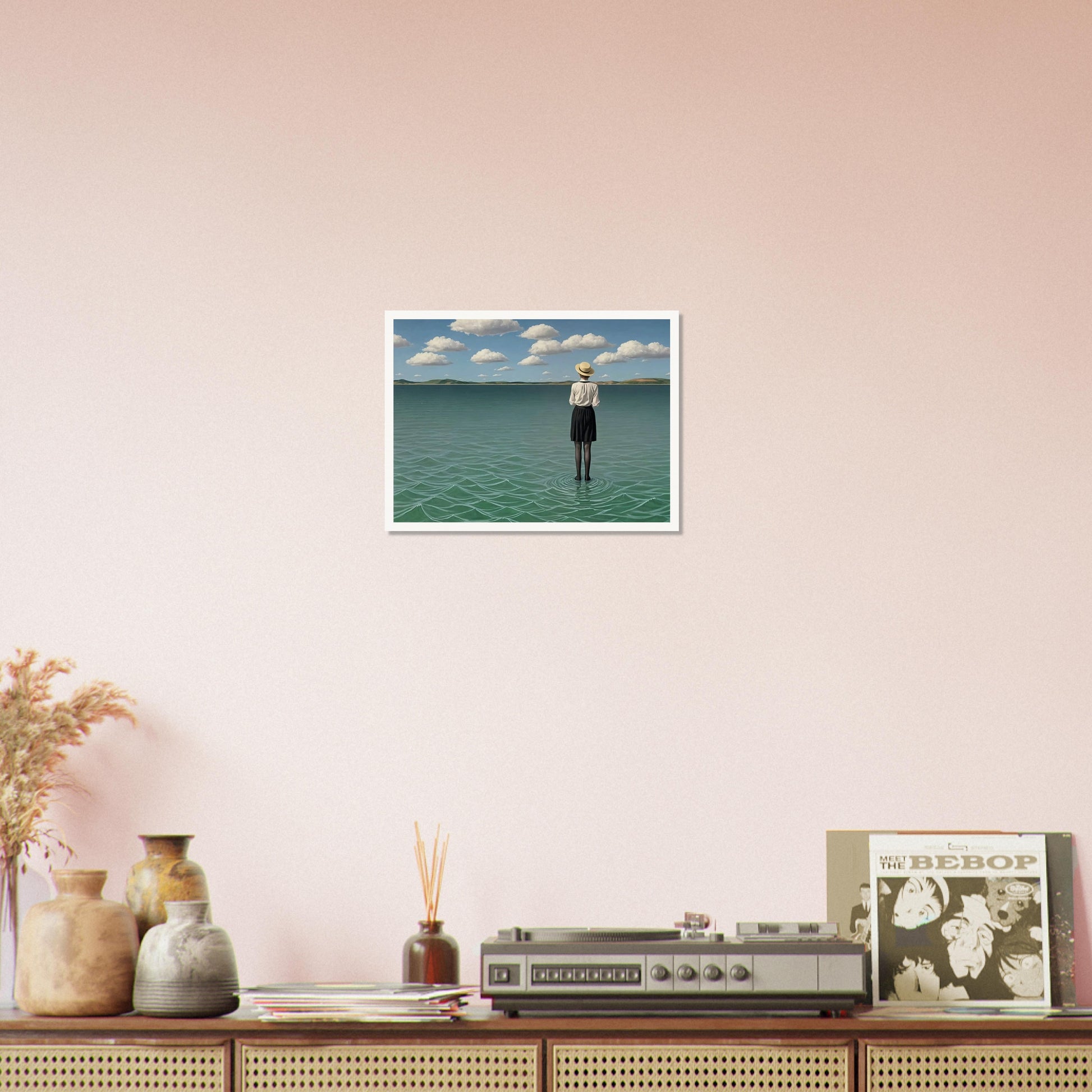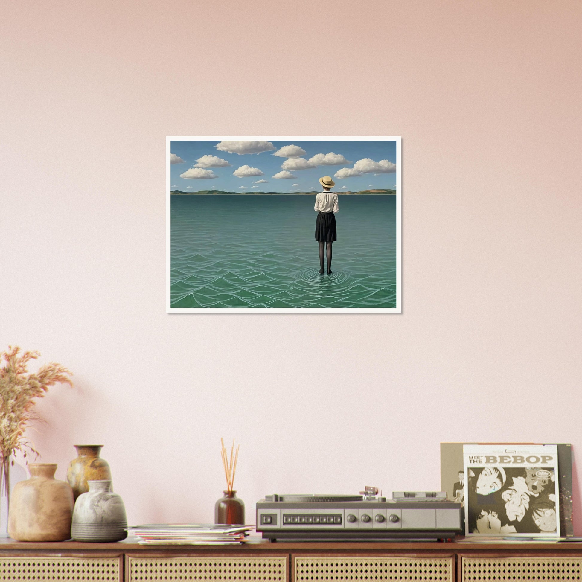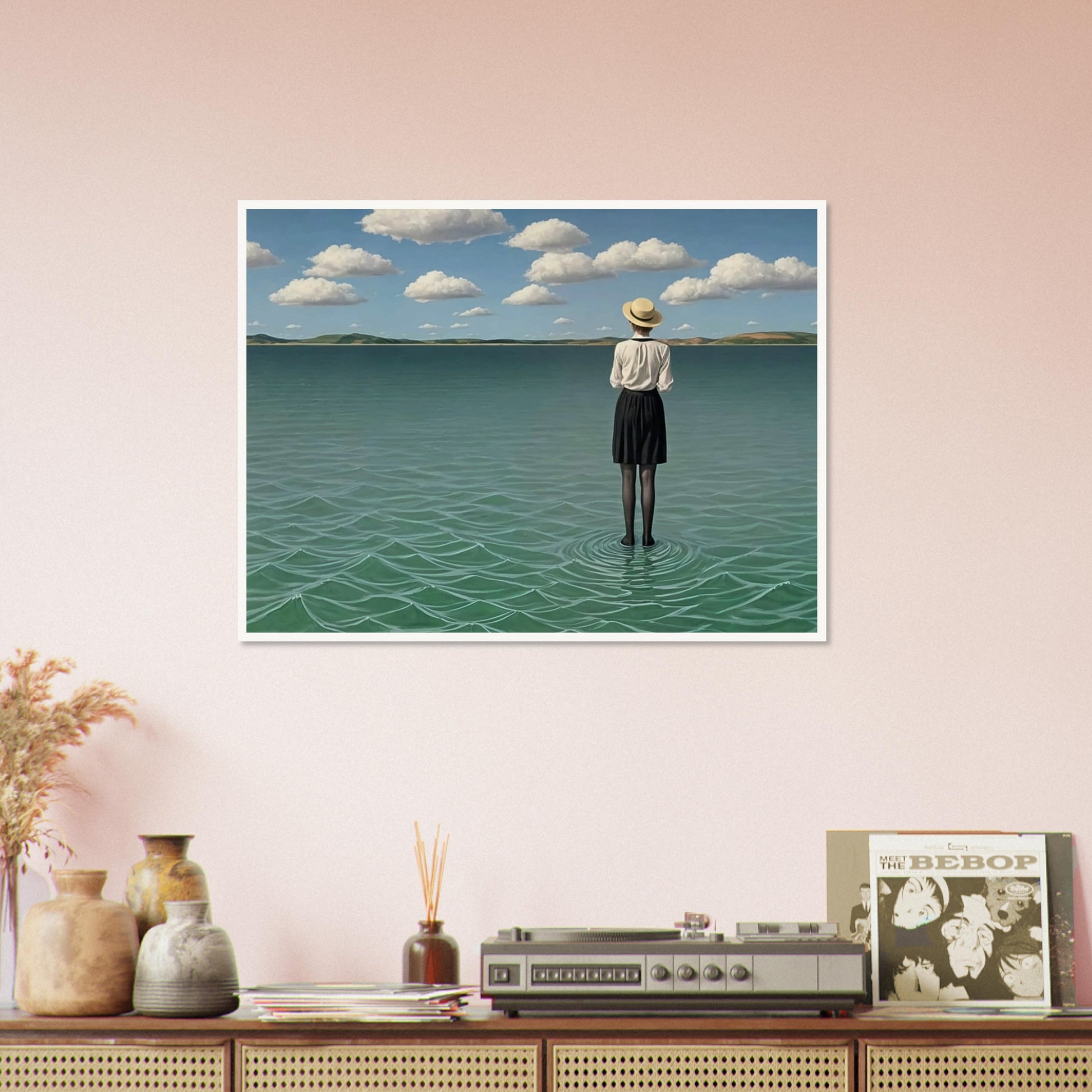 Solitude in Serenity wall art is a mesmerizing piece of surrealism wall art, features a lone figure standing in the middle of a tranquil body of water under a vast sky filled with soft, drifting clouds. The artwork’s calming hues of blue and green create a peaceful ambiance, evoking a sense of quiet introspection and connection with nature. The composition’s balance of elements, with the figure centered and the clouds stretching infinitely across the horizon, enhances the feeling of solitude and serenity. The subtle ripples in the water add a dynamic touch, reflecting the stillness of the scene.