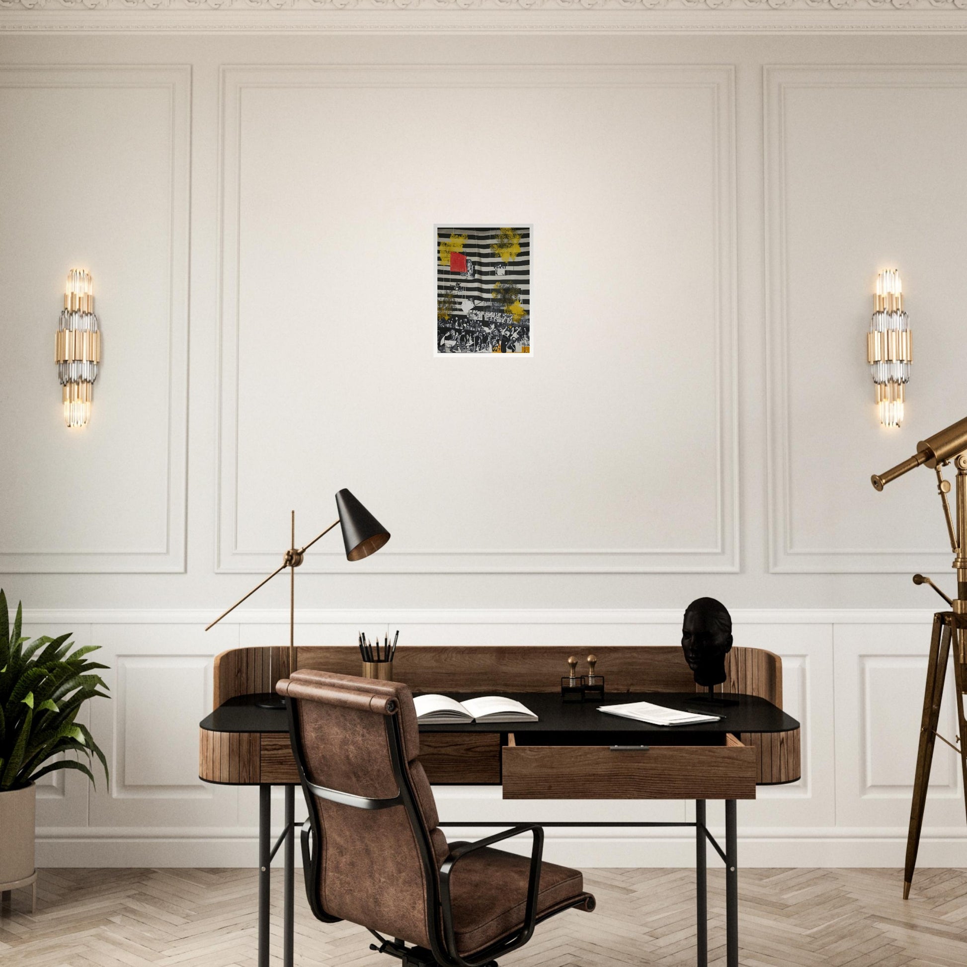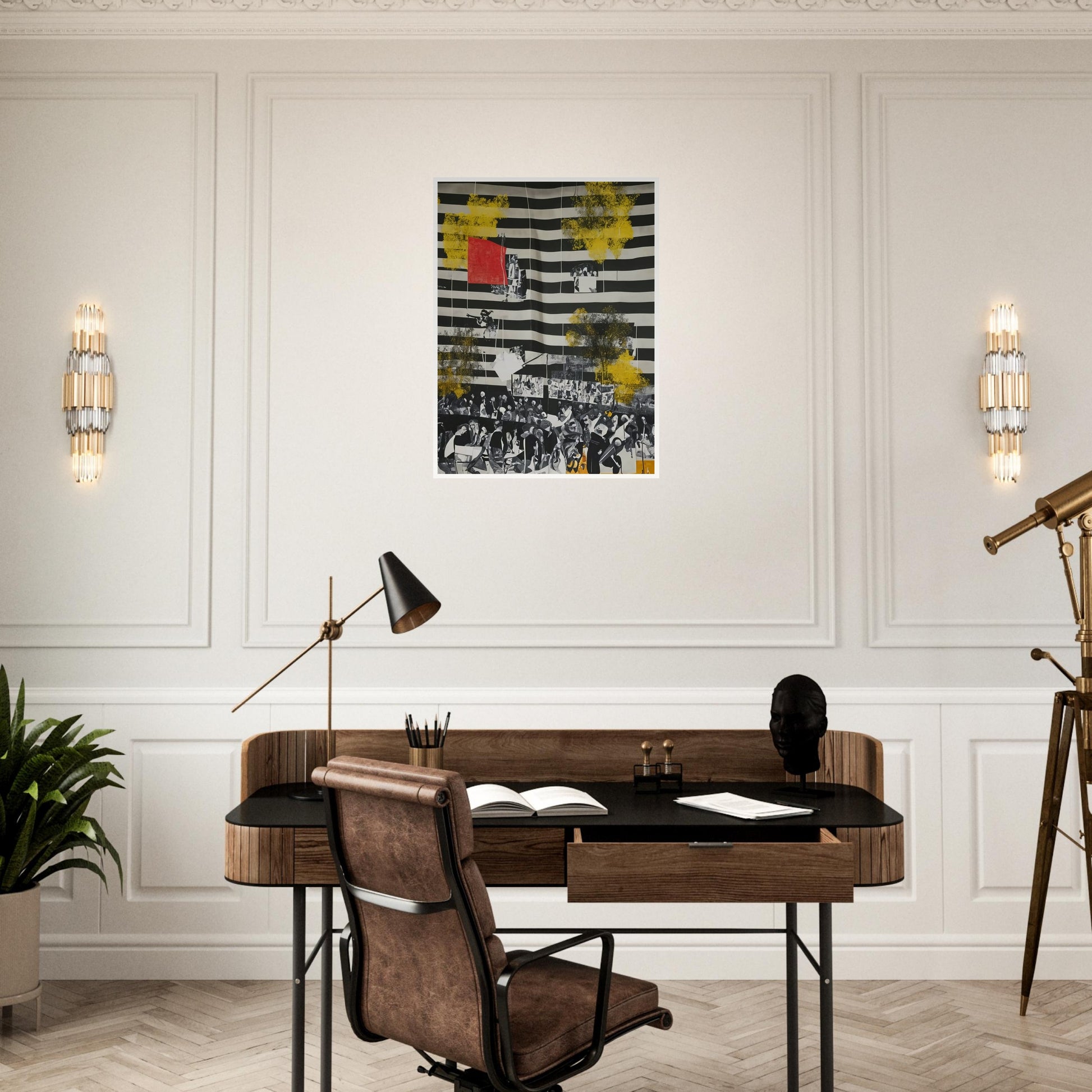 Stripes of History wall art offers a bold statement piece with its juxtaposition of abstract elements and historical imagery. The use of striking black and white stripes creates a sense of movement and tension, while the splashes of red and yellow add visual interest and depth. This artwork would make a powerful addition to any living room, where it can serve as both a conversation starter and a focal point. The complex layering of elements invites viewers to engage and reflect on the stories being told.