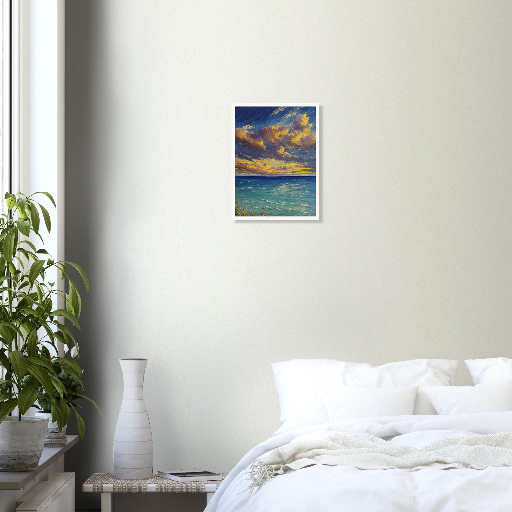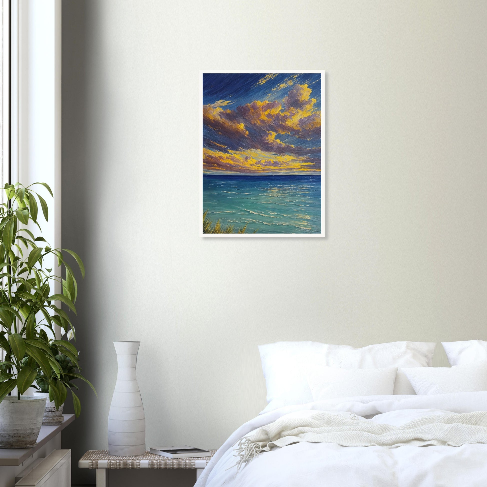 Sunset Serenity wall art captures the tranquil beauty of a sunset over a calm sea, with a sky painted in vibrant hues of yellow, orange, and purple. The brushstrokes create a dynamic scene that brings the peacefulness of the ocean and the warmth of the setting sun into your space. This artwork is perfect for those looking to add a serene and calming presence to their living room, bedroom, or dining room, enhancing the ambiance with its soothing colors and tranquil scene.