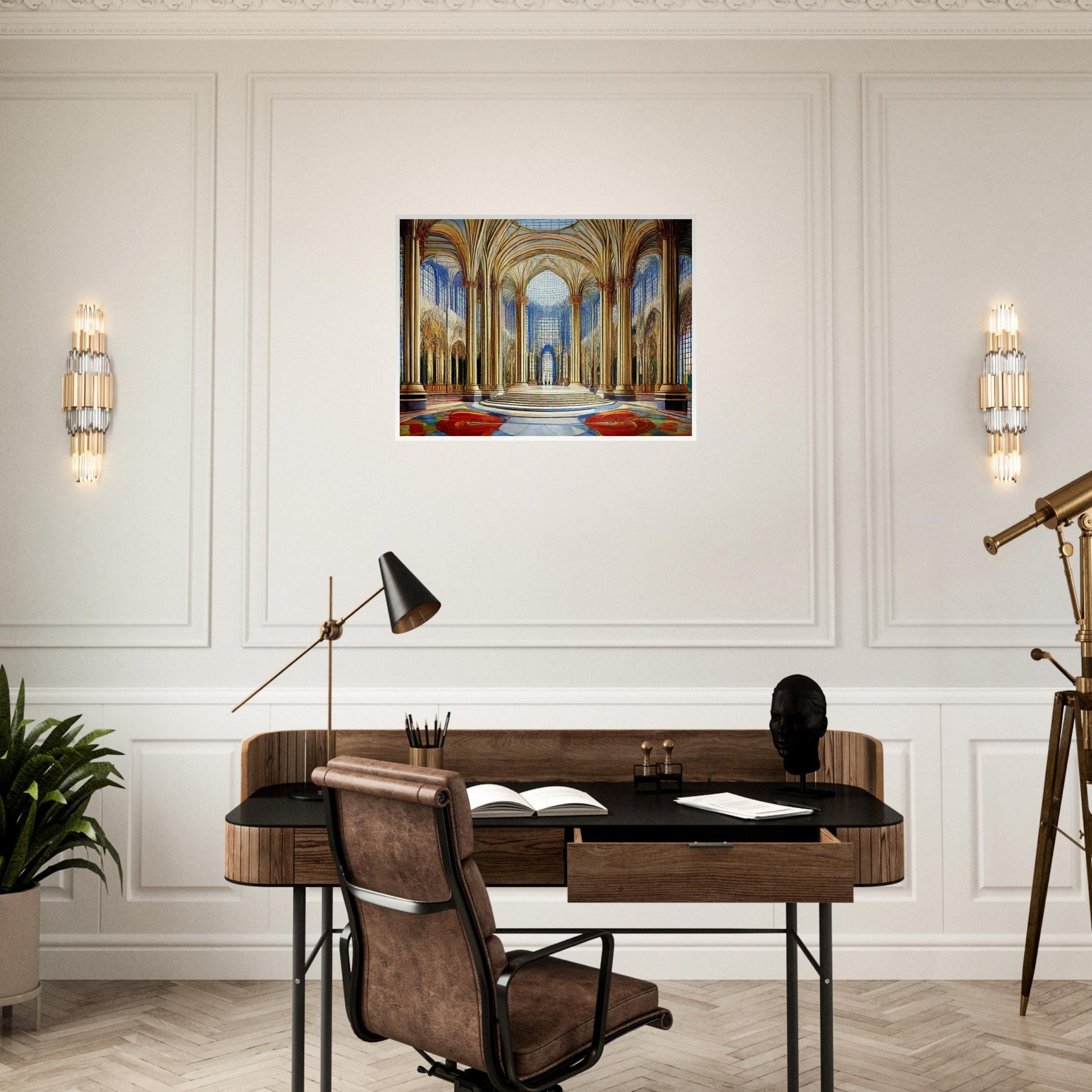 The Grand Vault wall art captures the awe-inspiring architecture of a grand, vaulted space with towering columns, magnificent archways, and windows. The play of light through the high windows creates a dramatic atmosphere, highlighting the graceful curves and symmetry of the design. The intricate flooring and architecture add depth and warmth to this elegant architectural masterpiece.