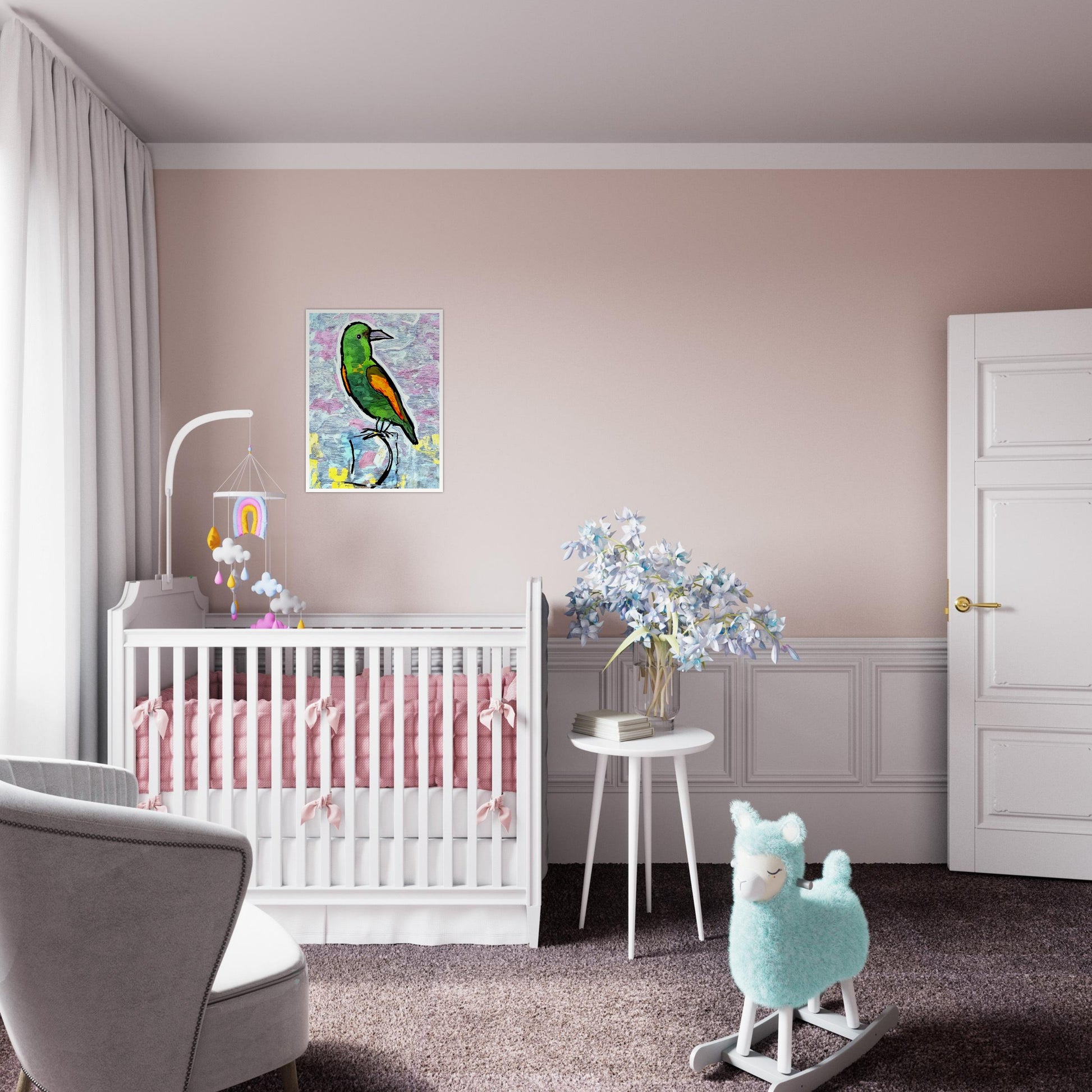 The Watchful Bird wall art brings a playful yet serene presence to any room, with its vibrant green and orange plumage contrasting against a soft, abstract background of pastels. The bird’s alert posture and inquisitive expression create a sense of curiosity and wonder, making it an engaging focal point for a nursery or bedroom. The bold lines and colors give the piece an energetic yet calming effect, perfect for sparking the imagination.