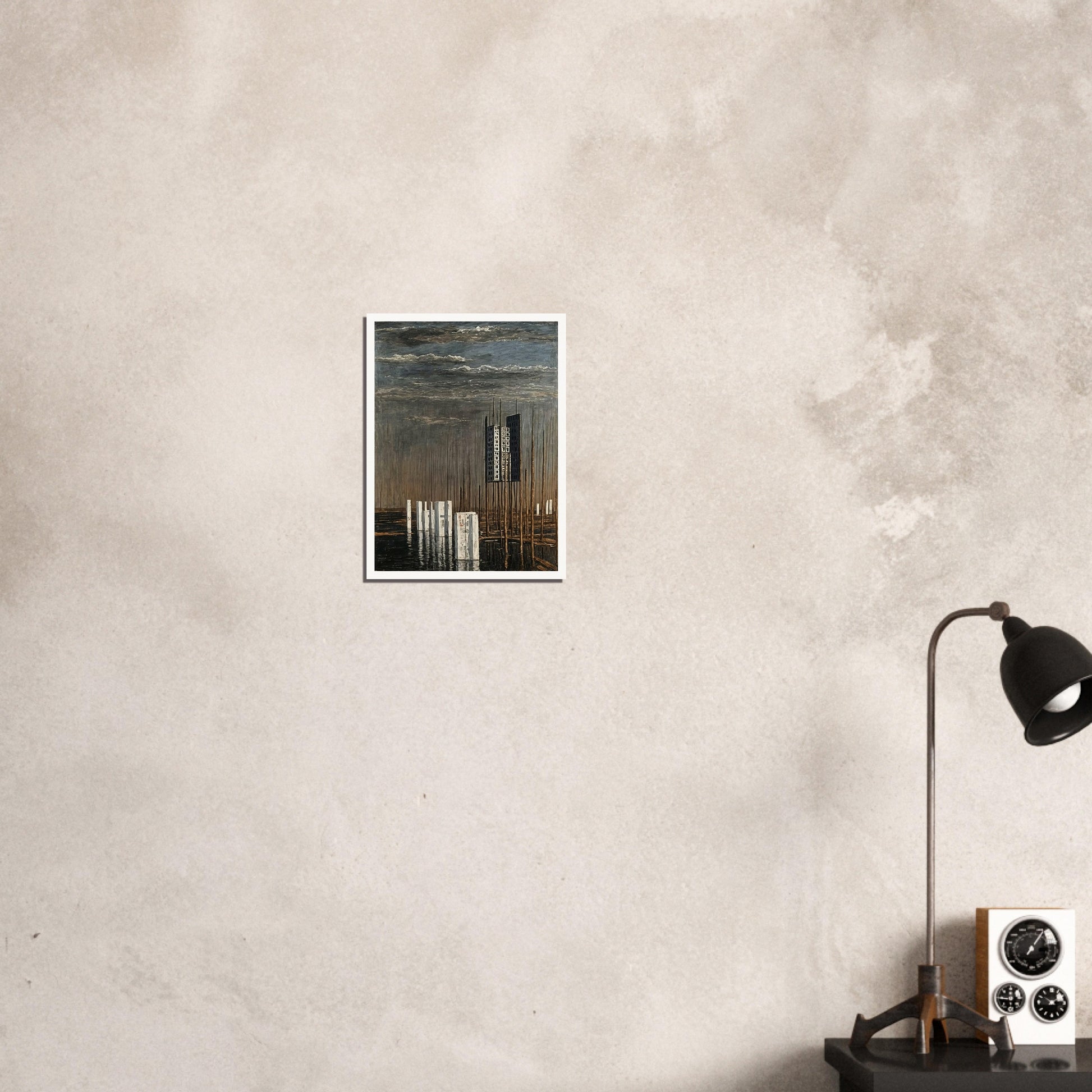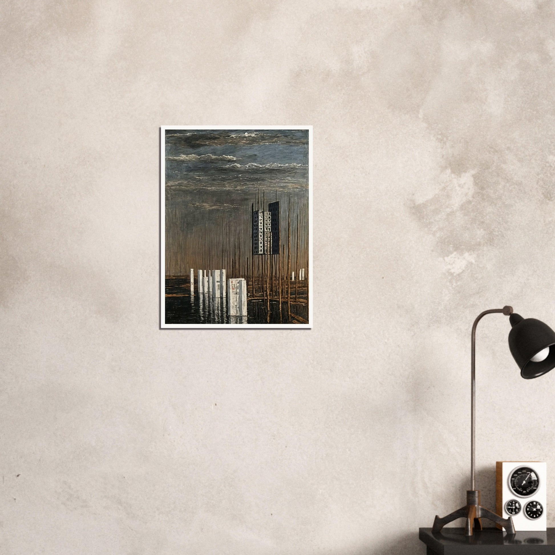 Towering Solitude wall art features a surreal landscape dominated by an isolated, towering structure suspended among a forest of tall, thin poles. The muted tones and the stark contrast between the man-made tower and the natural surroundings create a haunting yet mesmerizing atmosphere. The composition evokes a sense of isolation and introspection, making it a captivating centerpiece for any room.