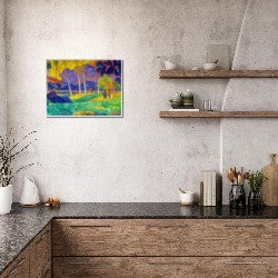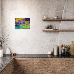 Tropical Dreamscape wall art captures a vibrant and lush landscape filled with tall palm trees, vivid foliage, and serene figures. The blend of bright colors and soft gradients creates a scene that radiates warmth and tranquility, making it a captivating centerpiece for any space. The artistic composition combines elements of nature and human presence, bringing a harmonious balance to the overall design.