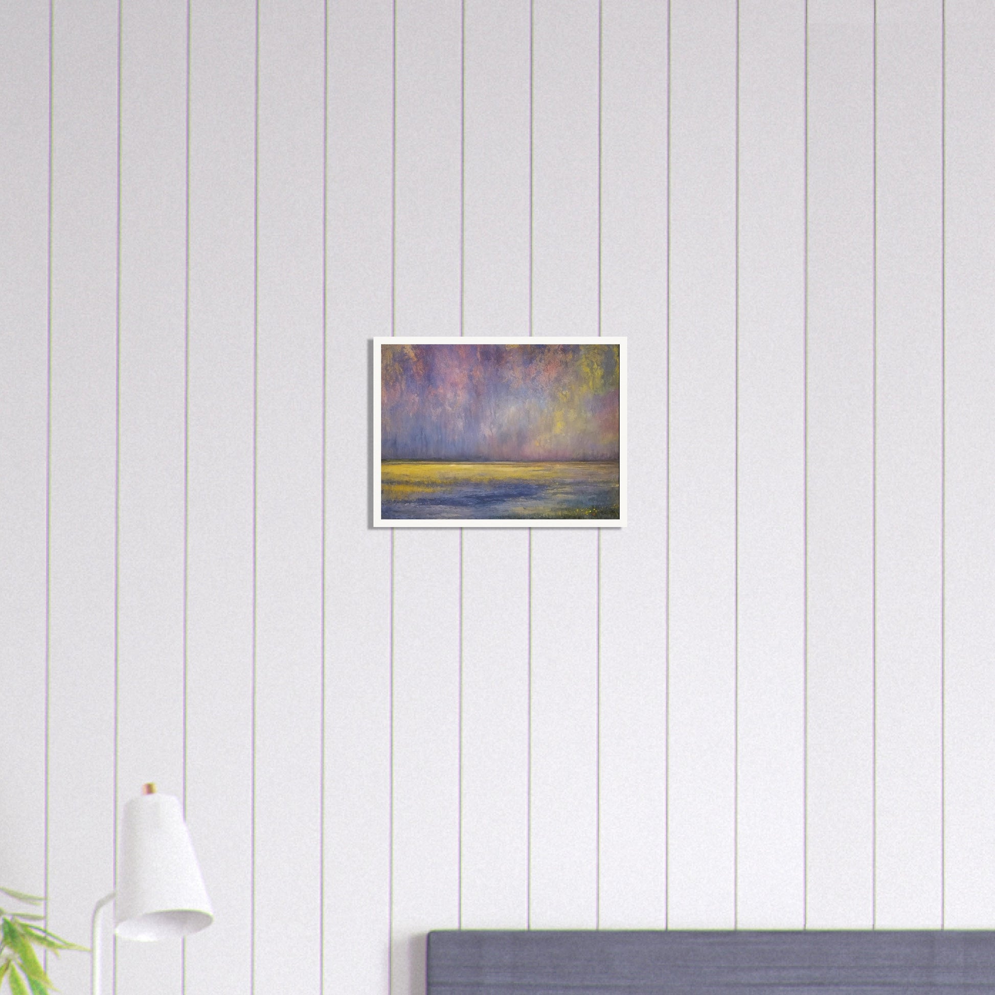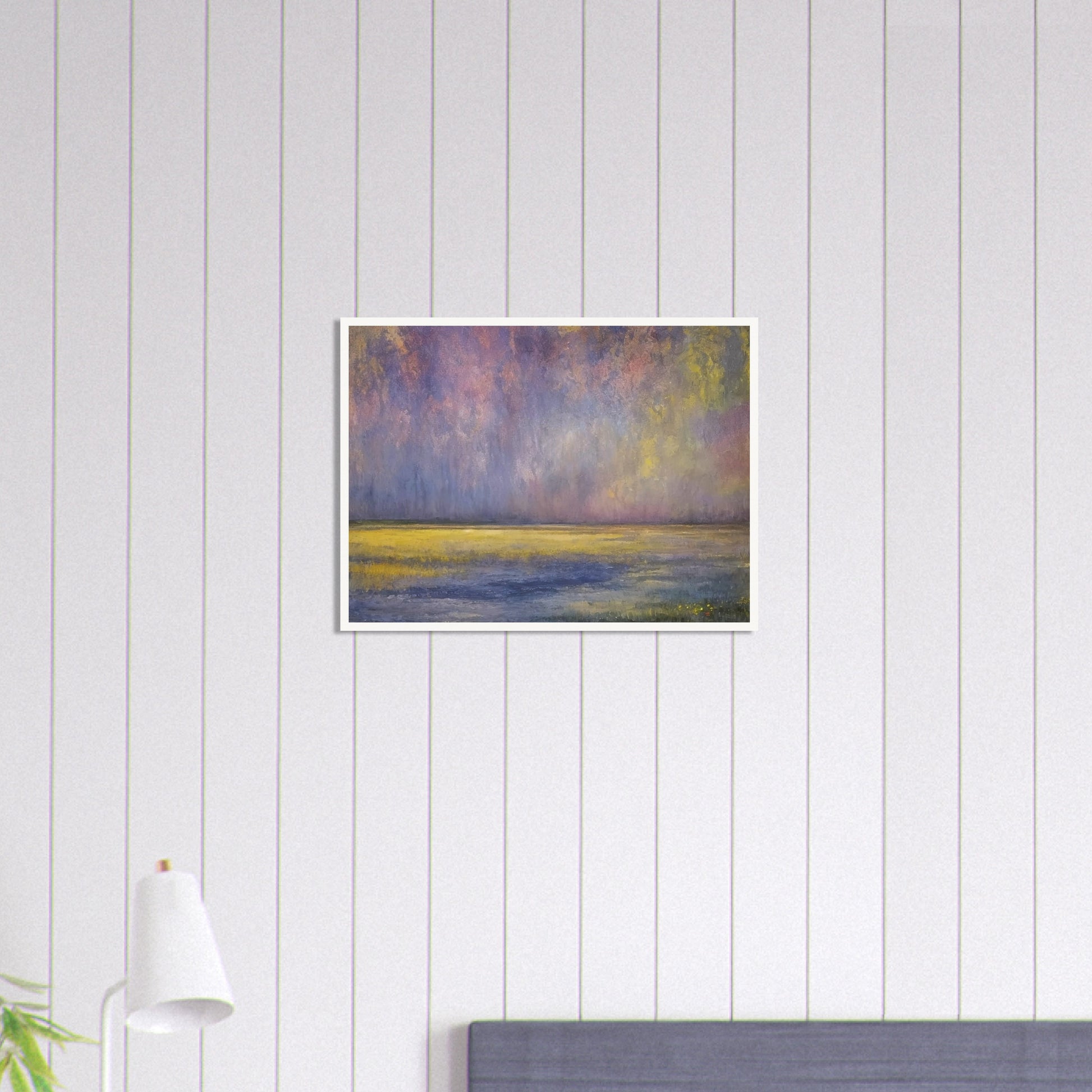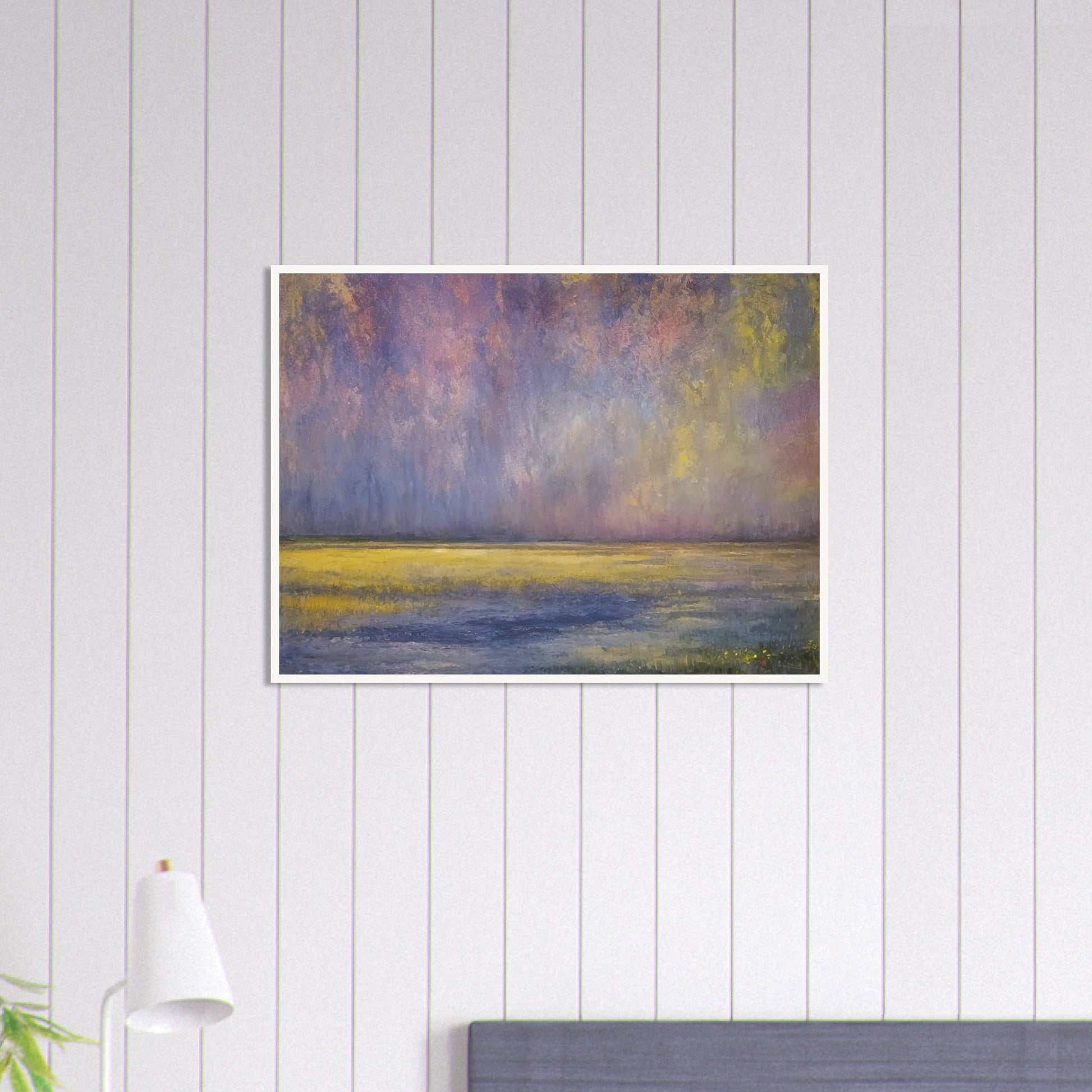 Twilight Field of Dreams wall art portrays a serene and dreamlike landscape where soft hues of purple, yellow, and blue blend seamlessly into the horizon. The gentle transition of colors evokes a peaceful atmosphere, reminiscent of the calm just before dusk. The impressionistic style, with its delicate brushstrokes, emphasizes the ethereal quality of the scene, inviting the viewer to lose themselves in its tranquility. The use of muted tones and the smooth gradient of colors create a soothing visual experience, making this piece a perfect addition to any space seeking a touch of calm and elegance.