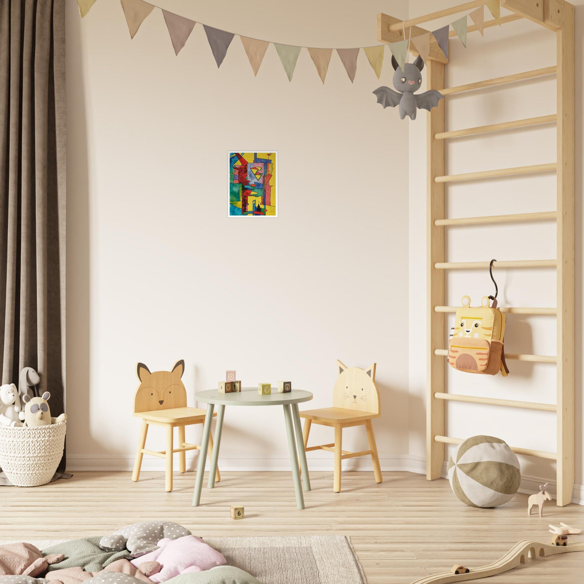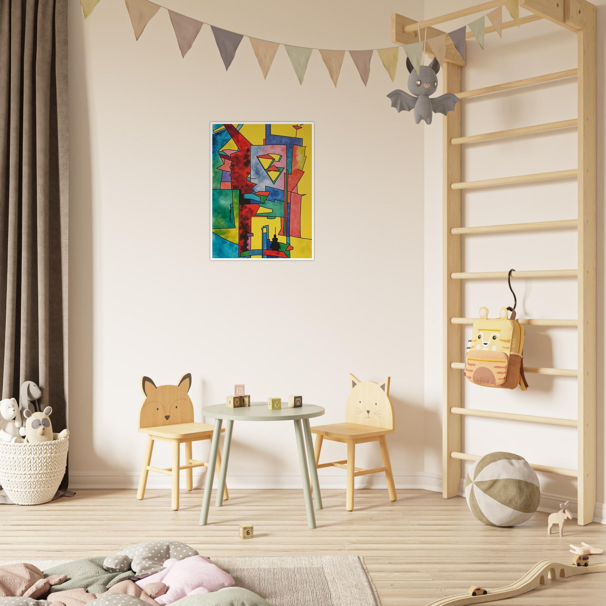 Urban Angles wall art brings a vibrant geometric composition to life, characterized by sharp lines and bold color blocks. The artwork plays with perspective and shapes, creating a dynamic interplay of angles that draw the viewer's eye across the canvas. The bright yellows, reds, blues, and greens make this piece a lively addition to any space, adding an energetic and modern feel. This design not only captures the essence of urban landscapes but also infuses it with a bold, artistic flair that enhances contemporary interiors.