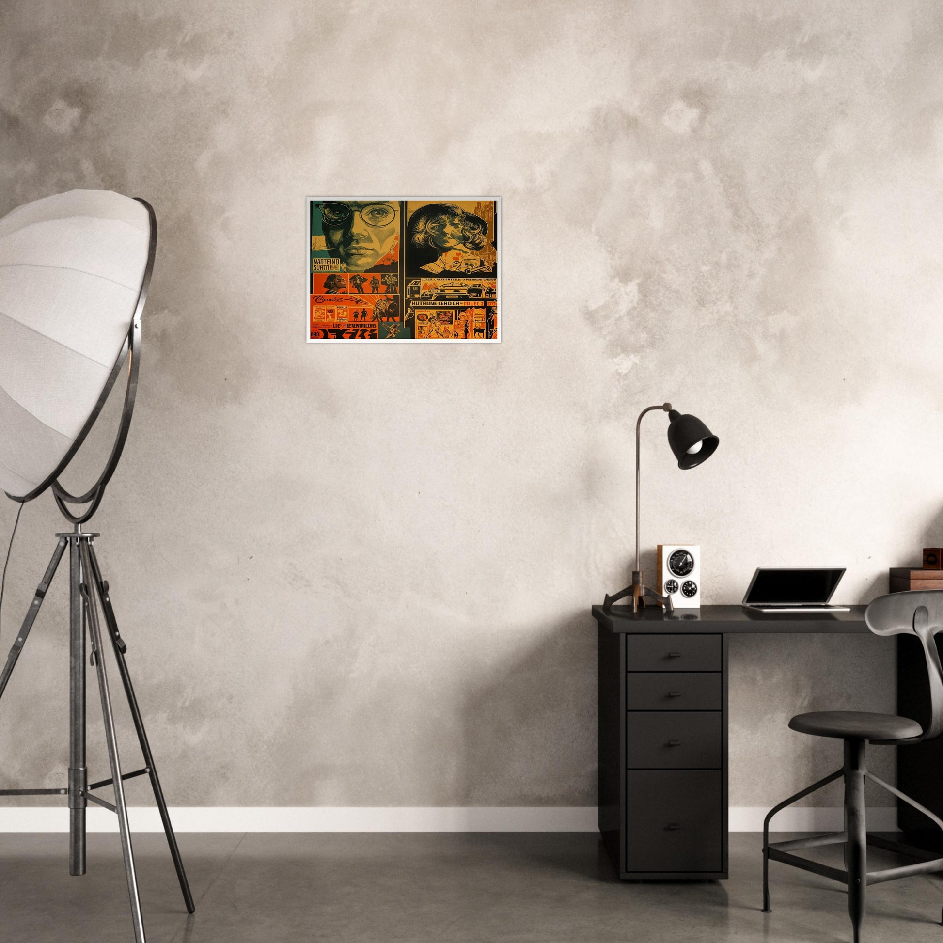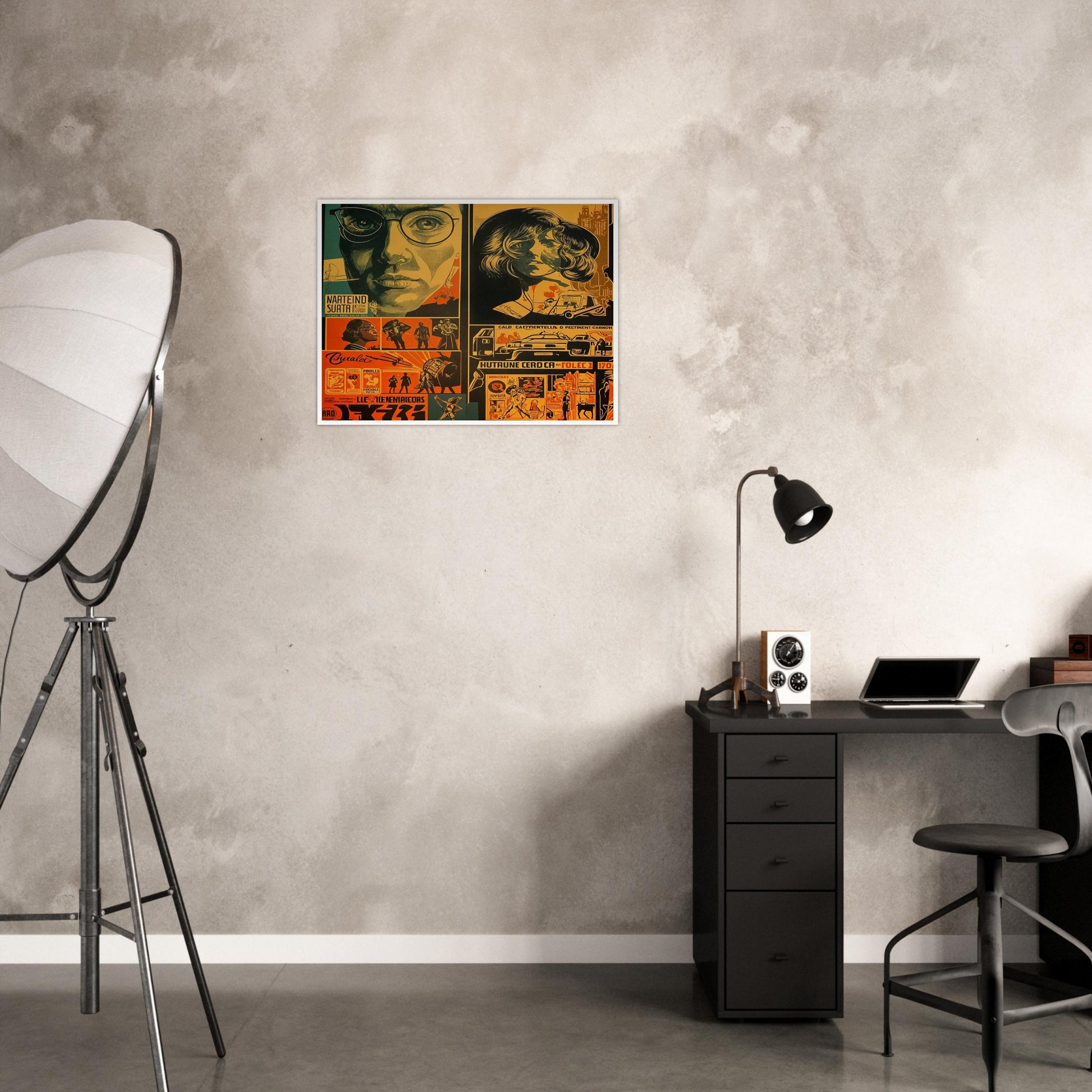 Urban Glimpse features a vintage street portrayal of city life. The orange and green tones capture the grit and glamour of city living. This piece takes you back to a time of pulpy thrillers and film noir, all while offering a contemporary twist with its stylized presentation.