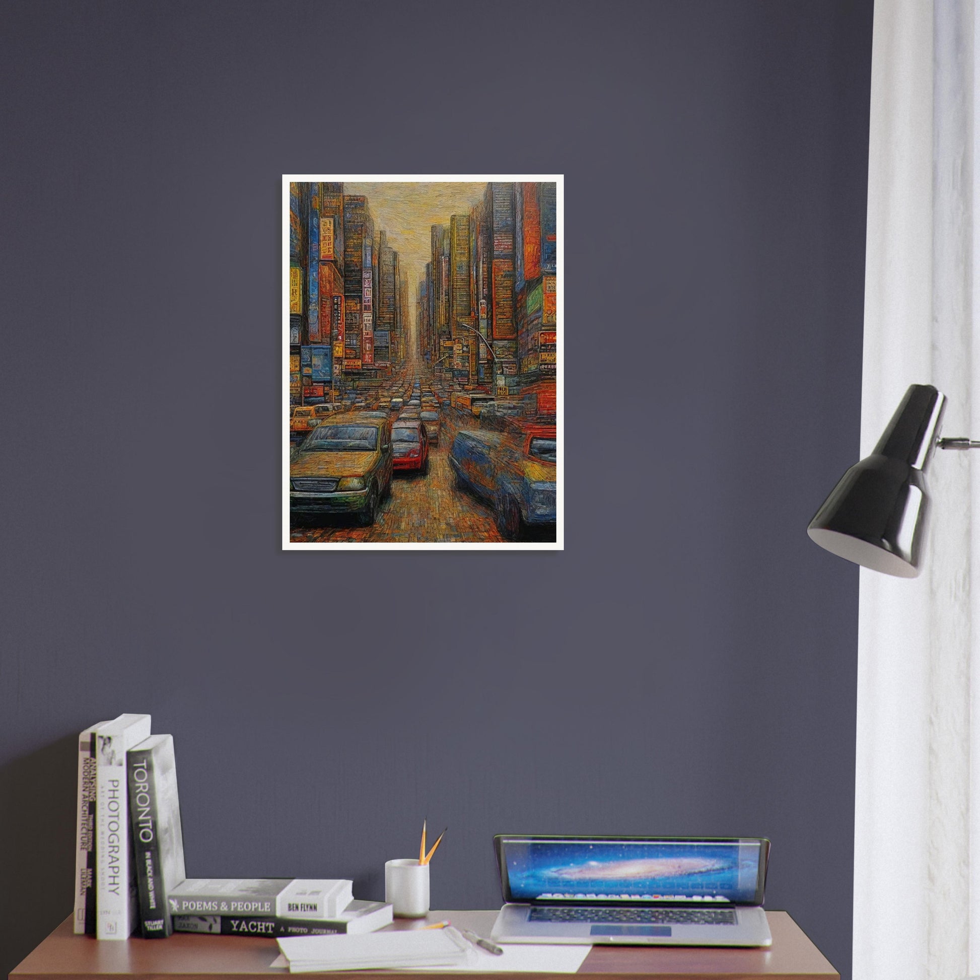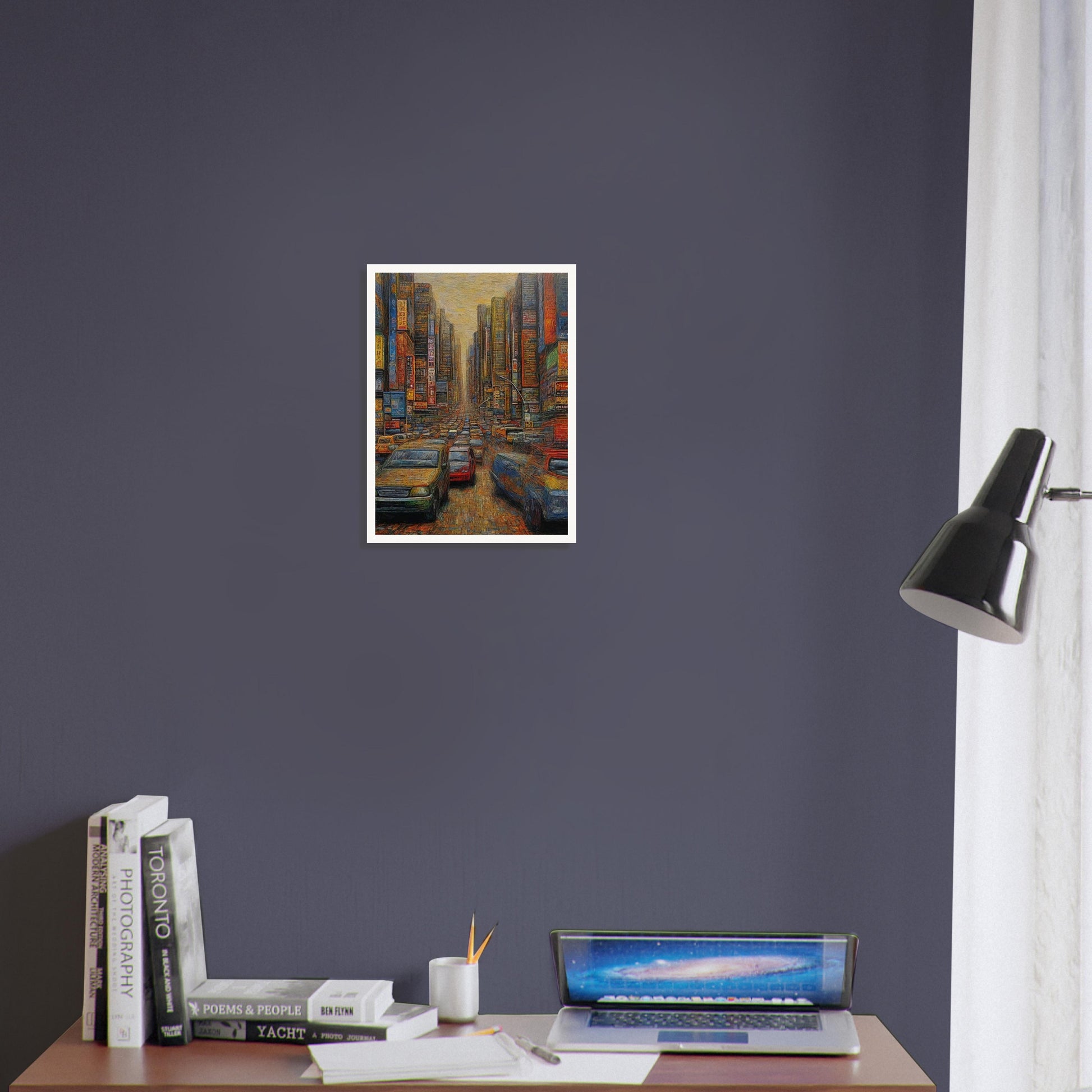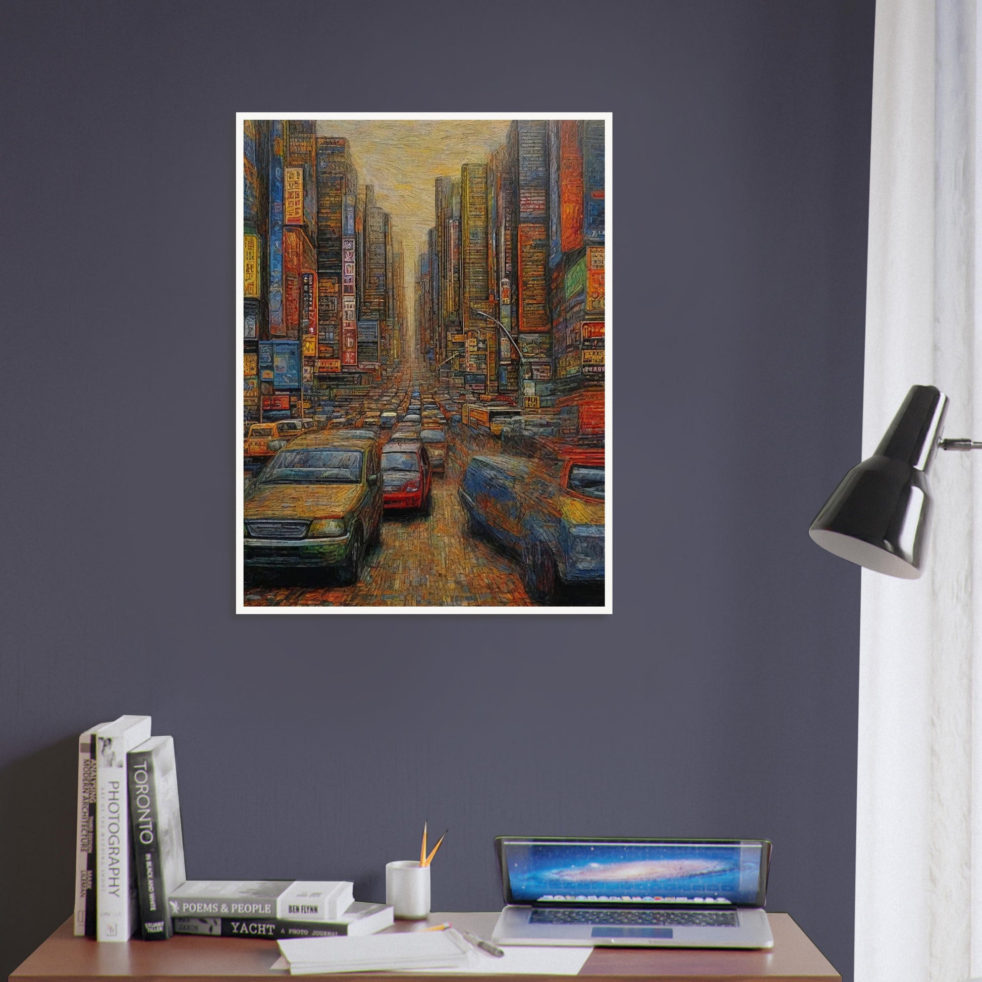 Urban Rush Hour wall art captures the vibrant pulse of city life, with a bustling street scene filled with traffic and towering skyscrapers. The dynamic colors convey a sense of movement and energy, while the layered buildings and vehicles create a feeling of depth and complexity. The use of space and proportion highlights the grandeur of the urban environment, drawing the viewer into this fast-paced city moment.