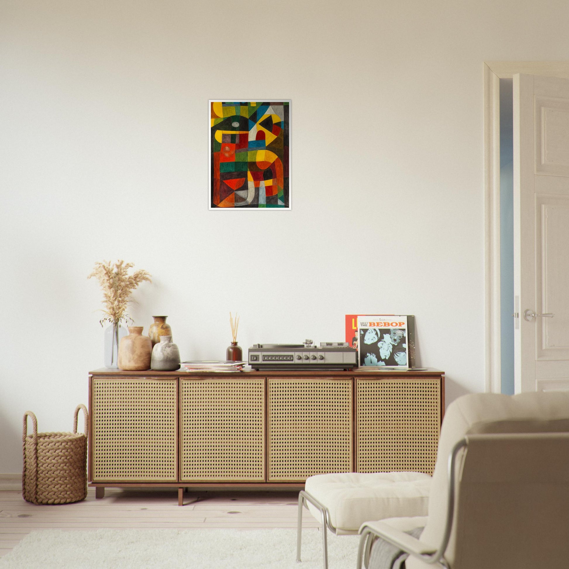 Vibrant Symmetry wall art features a bold interplay of geometric shapes and colors, creating a dynamic design. The arrangement of forms in reds, yellows, greens, and blues brings a balanced yet energetic feel, adding a modern touch to your space. This abstract piece blends symmetry and vibrant colors, inviting the viewer to appreciate the rhythm of shapes while maintaining a sense of order and harmony.
