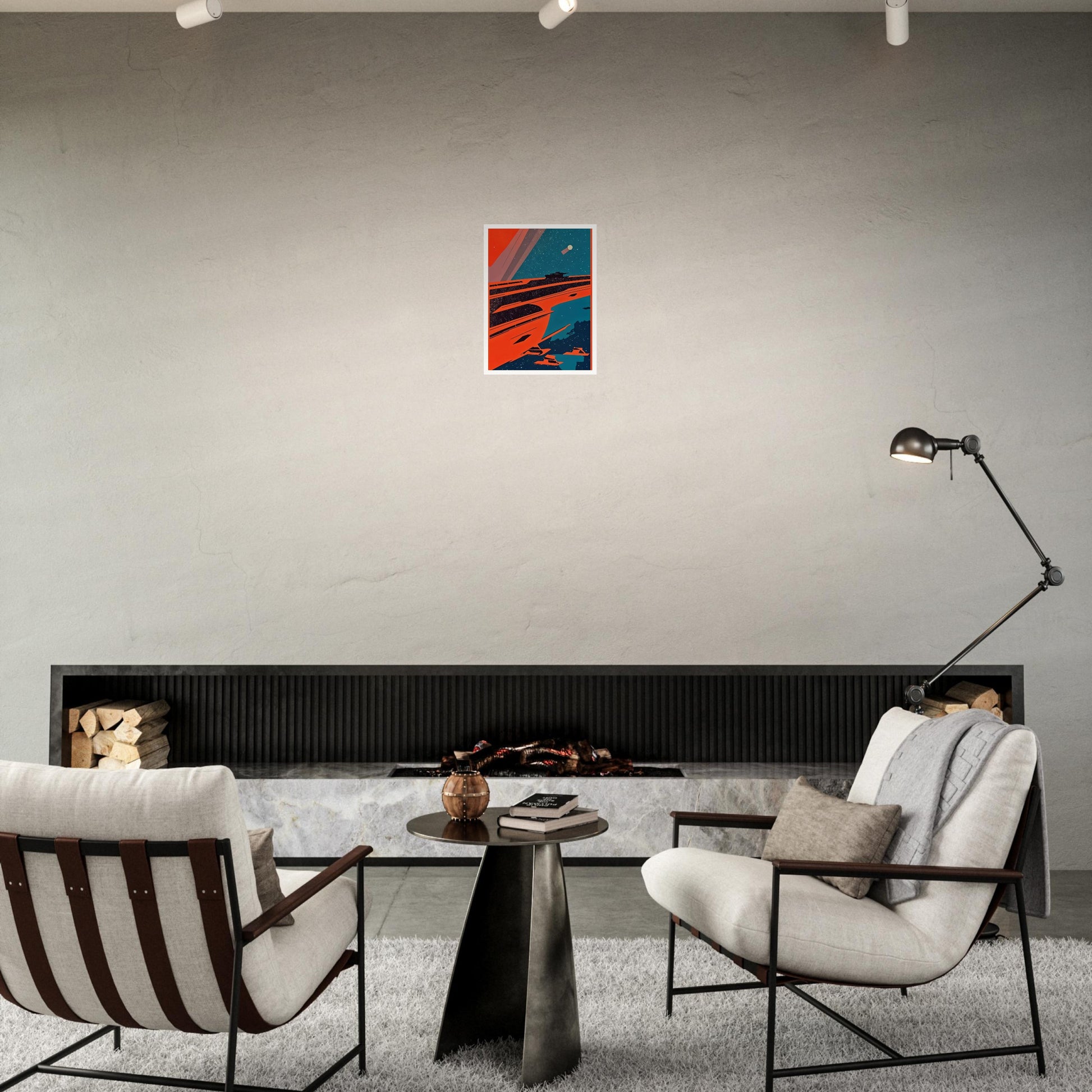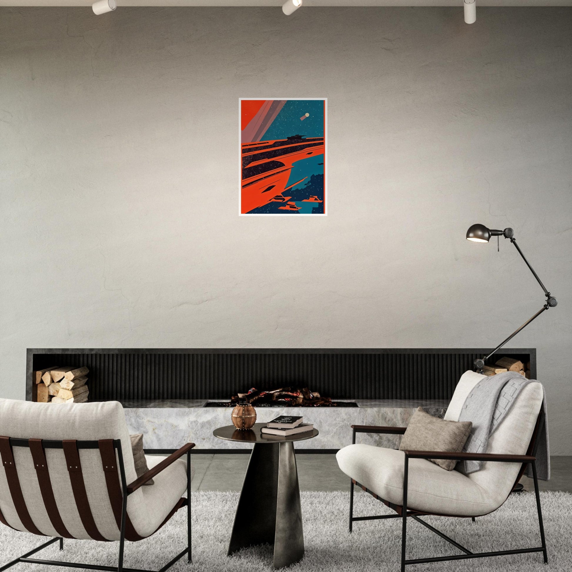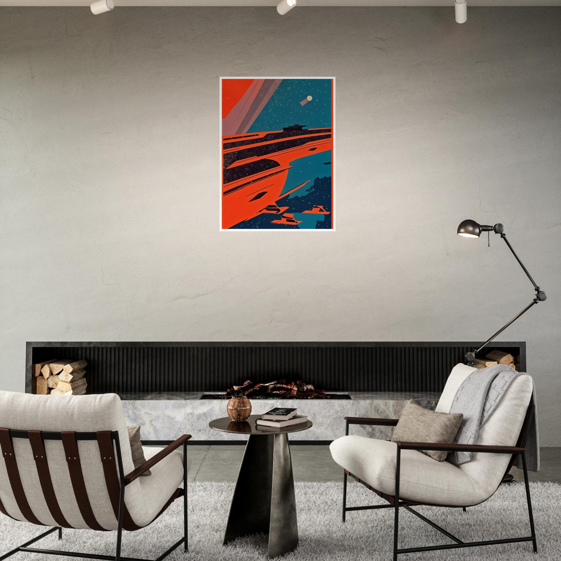 Voyage Beyond wall art illustrates a futuristic space scene where sleek spacecrafts traverse the distant realms of the universe. The rich use of deep reds and blues creates a bold contrast, while the geometric forms of the ships lend the piece a modern, surreal quality. This artwork brings the mystery and excitement of space exploration right into your living space. The dynamic design of Voyage Beyond captures the essence of sci-fi adventure, with clean lines and sharp contrasts evoking the thrill of travel through uncharted galaxies.