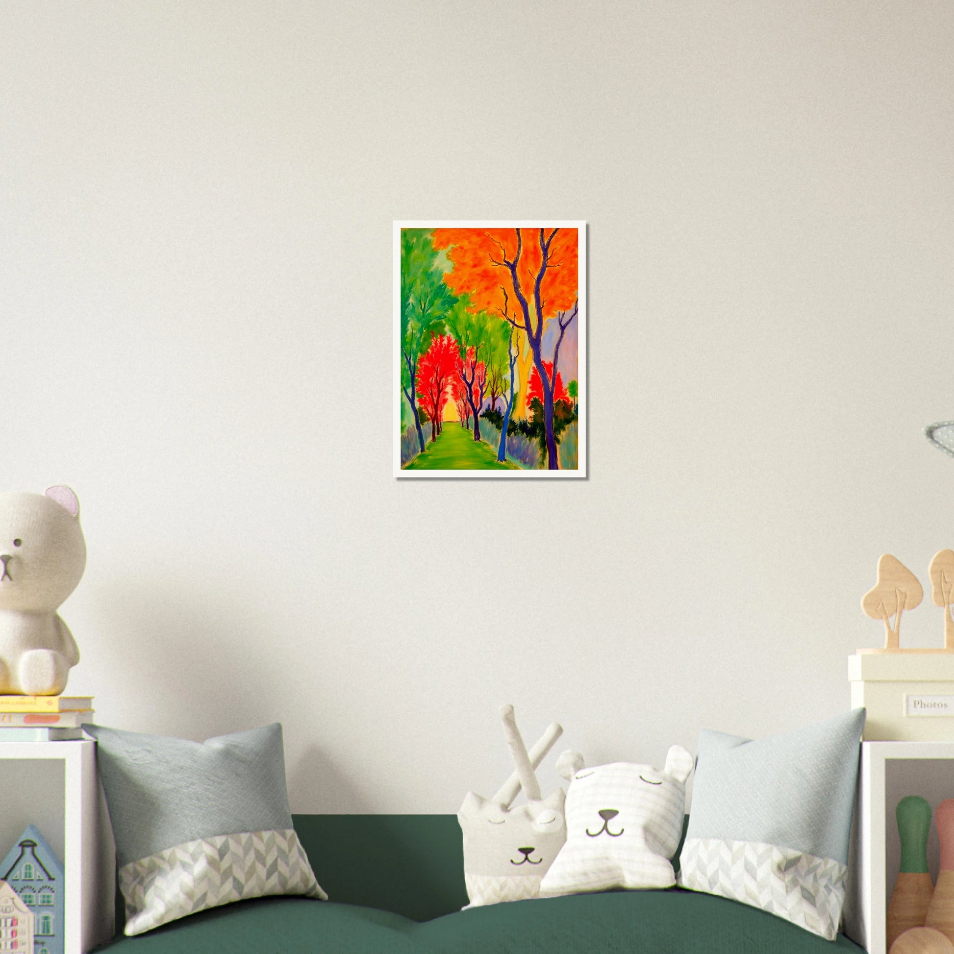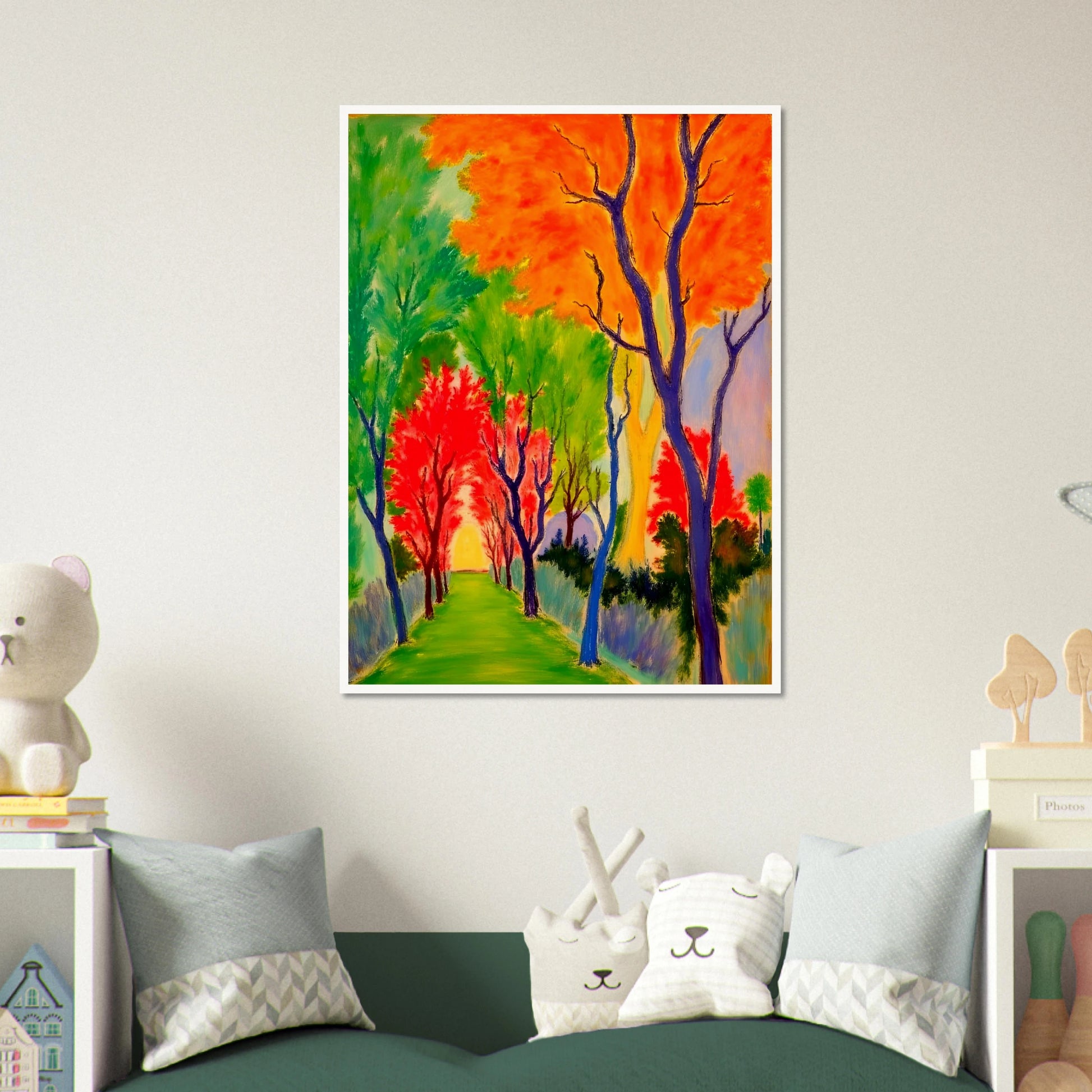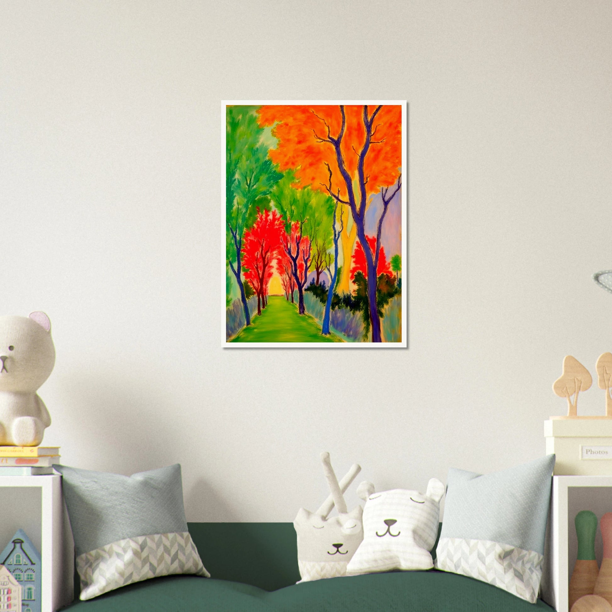 Walk Brightly wall art celebrates the vivid energy of nature through expressive color and rhythm. The composition features a radiant pathway surrounded by trees glowing in shades of red, orange, and green, leading toward a soft golden horizon. The expressive brushstrokes and contrast between warm and cool tones bring depth and movement, capturing the essence of a bright, hopeful journey.