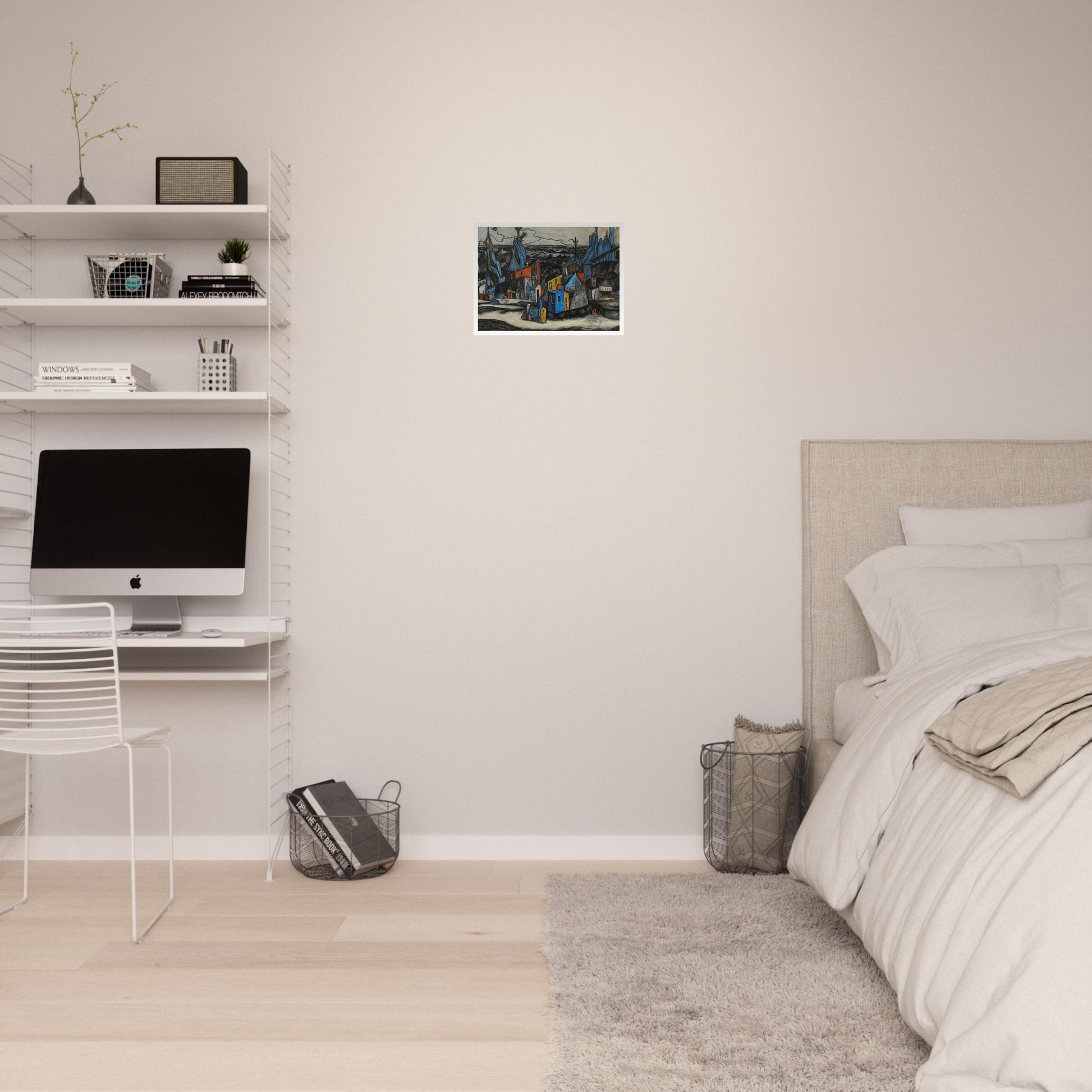 Whimsical Village wall art brings a quirky, abstract portrayal of a colorful town nestled among rolling hills and strange shapes. The bold use of colors—deep blues, reds, and yellows—combined with geometric structures, creates a surreal and lively scene. The intricate lines and expressive shapes add a playful yet thought-provoking quality, making this piece a captivating focal point in any room.