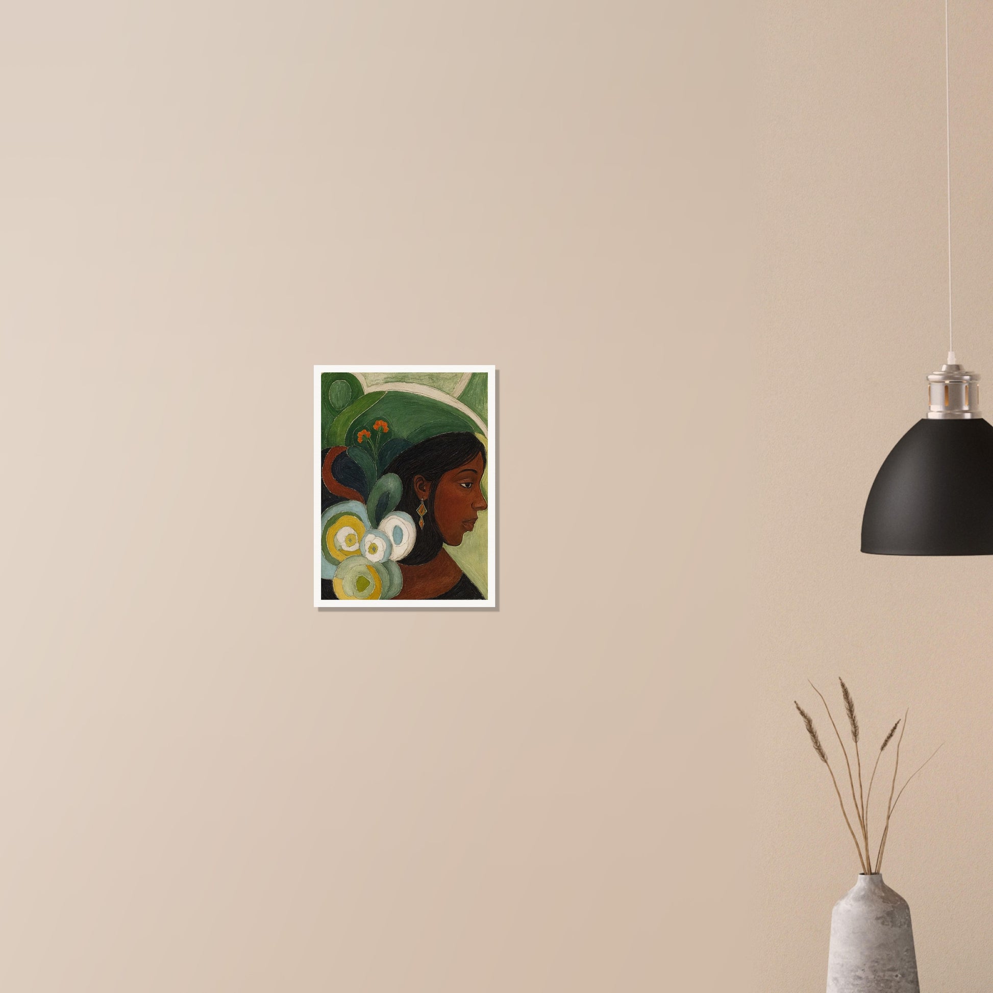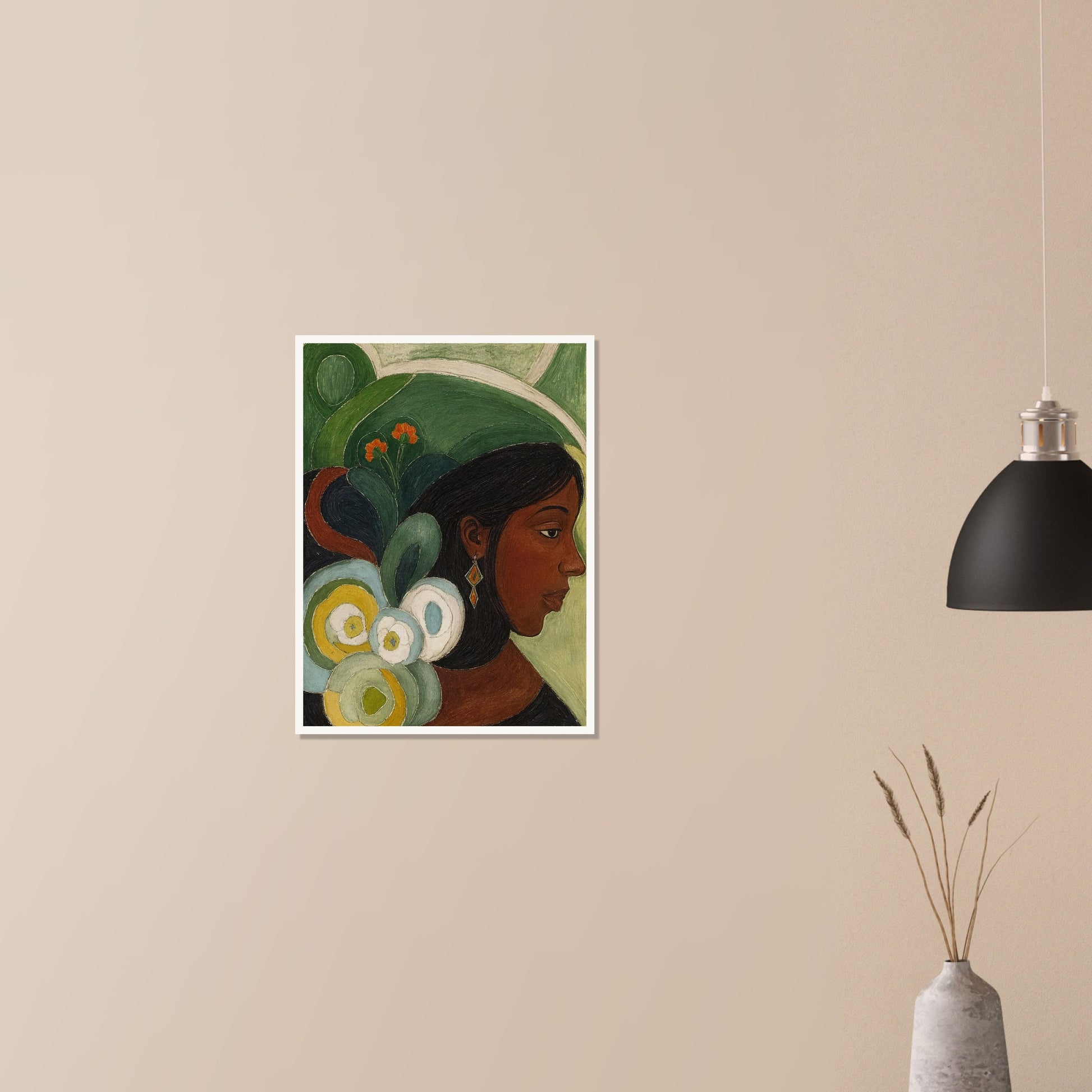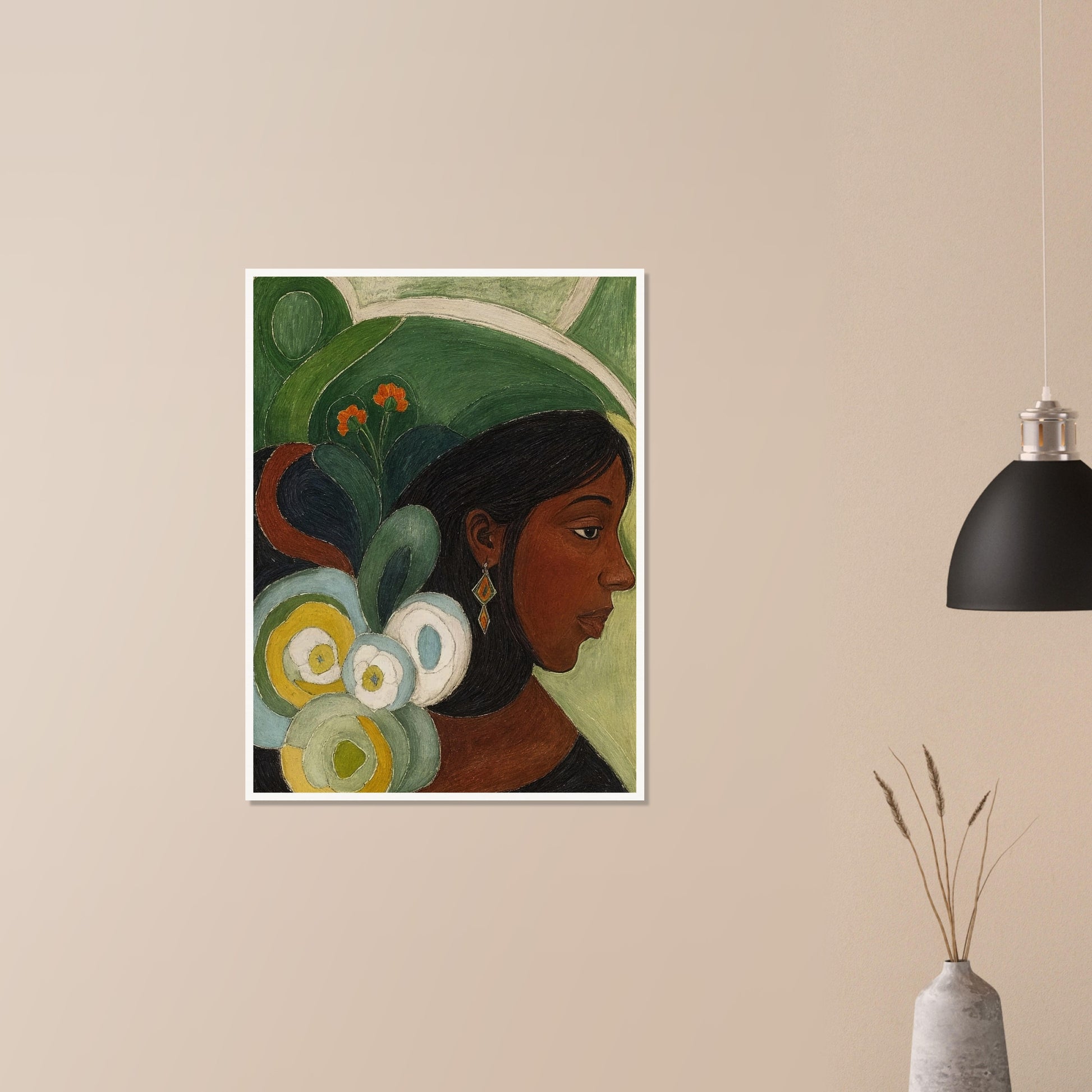 Whispers of Green wall art features a beautiful profile of a woman surrounded by soft green and floral shapes, creating a harmonious and expressive piece. The subtle blending of earthy tones and vibrant accents offers a serene and poetic portrayal, inviting the viewer into the subject's calm world. The delicate brushstrokes and flowing lines give the artwork a sense of gentle movement, making it both expressive and peaceful.