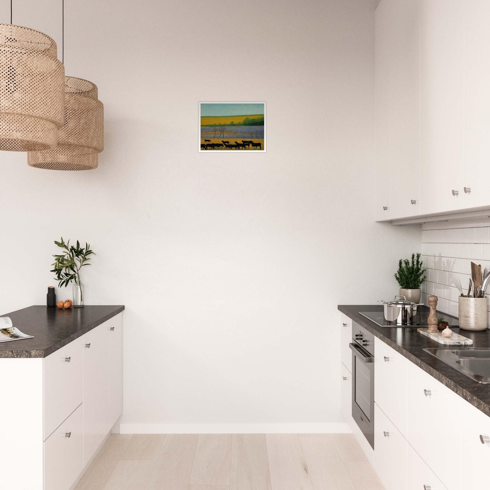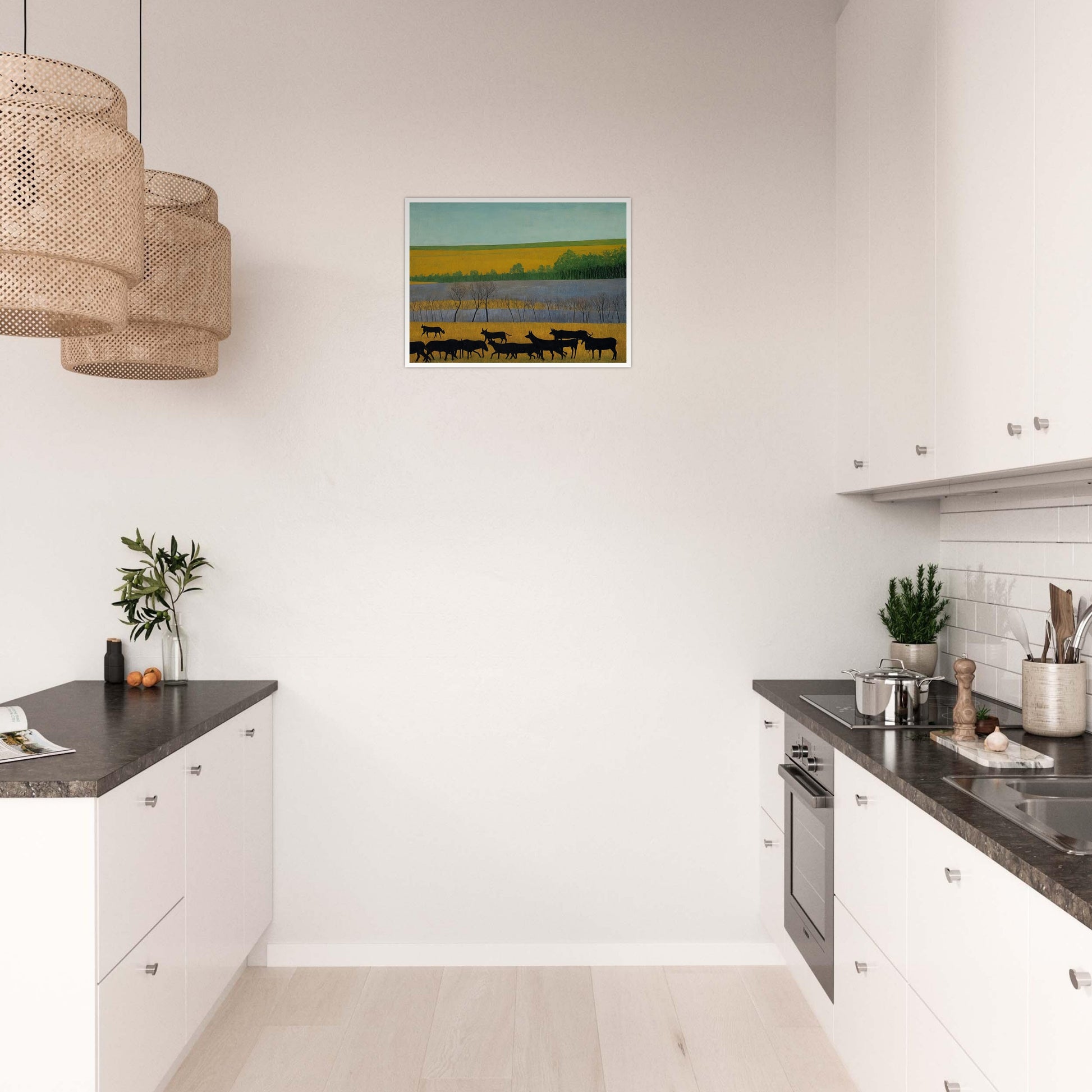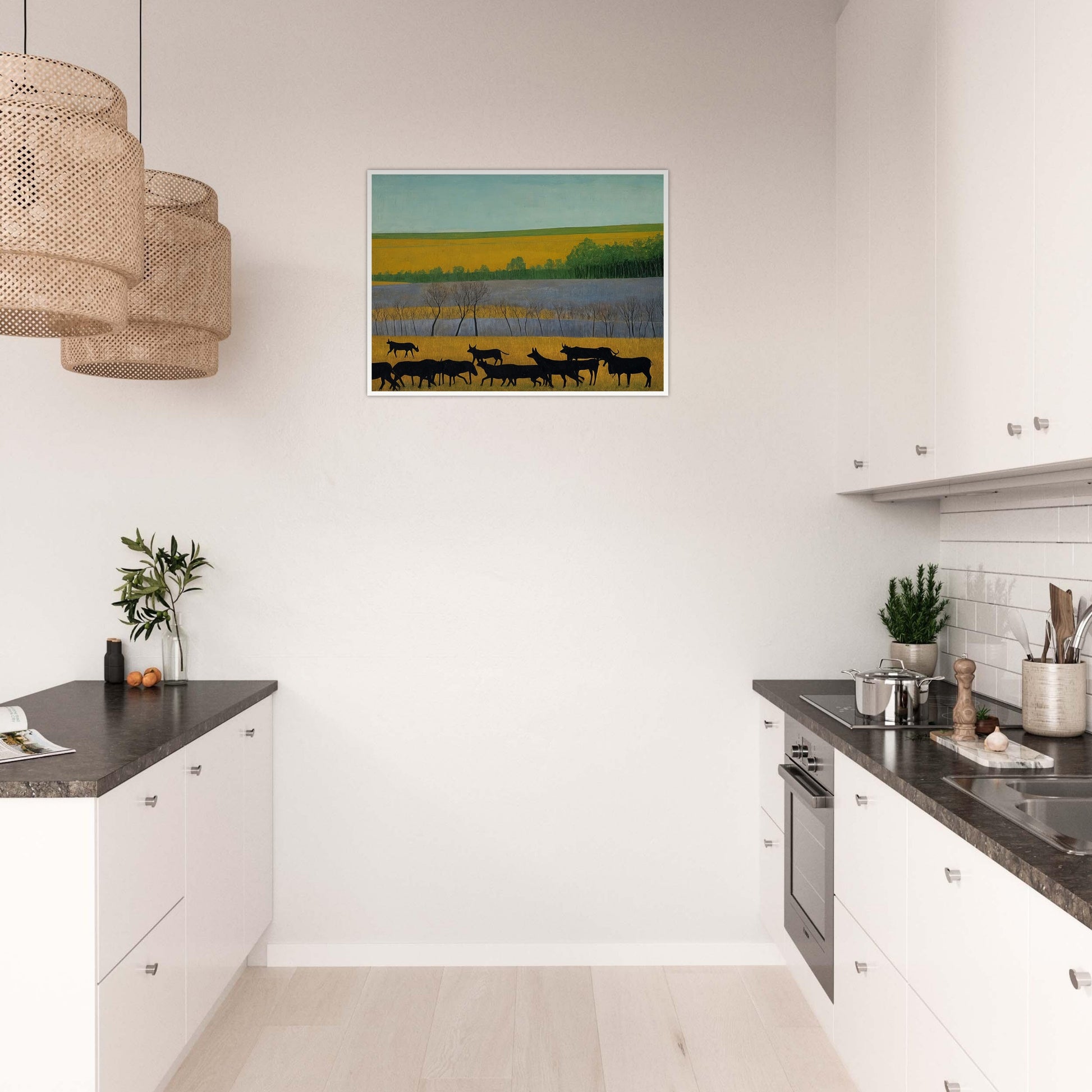 Whispers of the Field wall art captures the serene beauty of a rural landscape, where silhouettes of animals move through a vibrant and golden field. The dark figures against the expansive backdrop of green and yellow earth invite a deep sense of calm and connection to nature. The stillness and simplicity of the scene depict a timeless rhythm, where life moves at its own gentle pace.